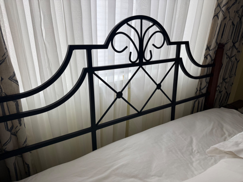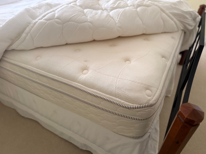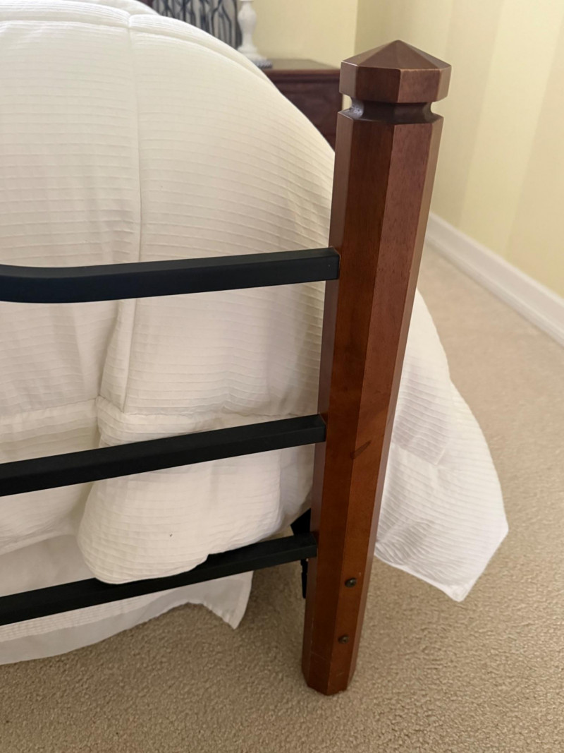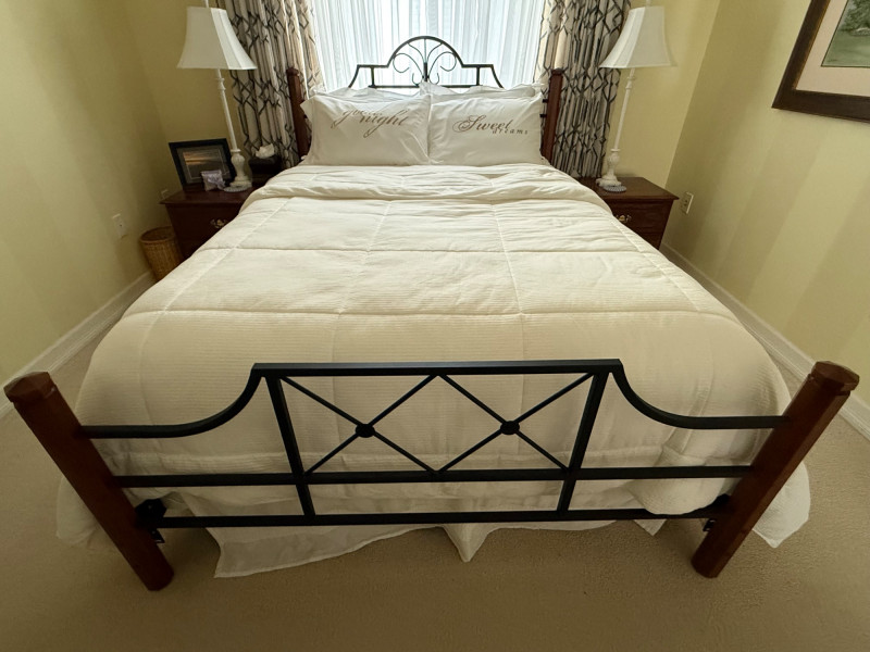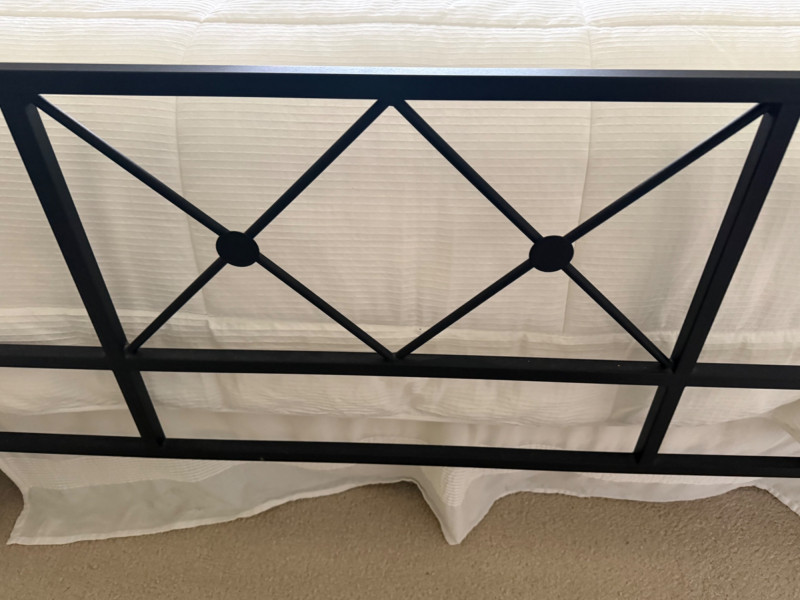 Metal and wood frame. Medium firmness mattress. Queen size. Come with high quality bedding. Very clean. Was used only as guest bed.