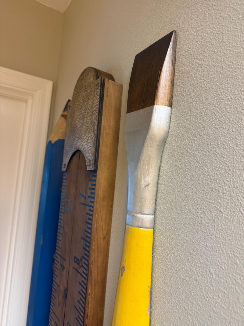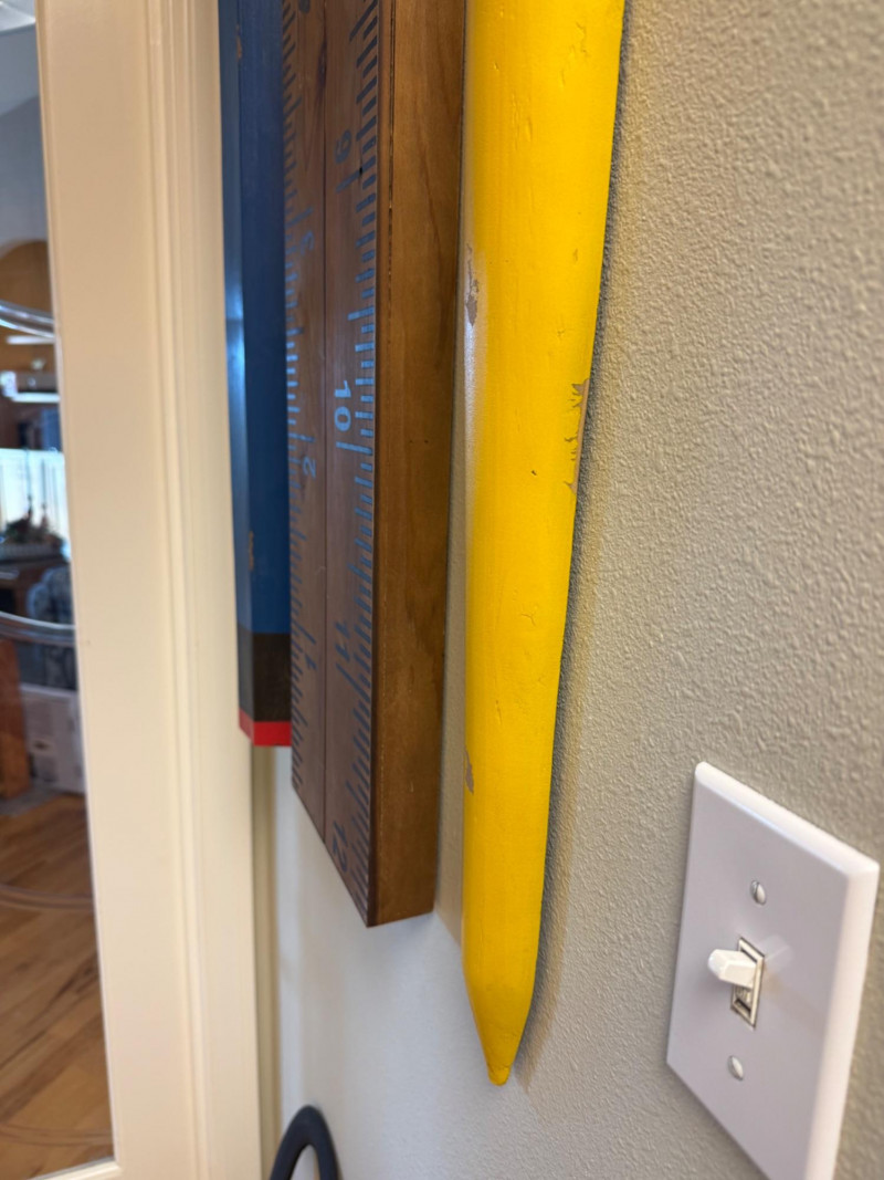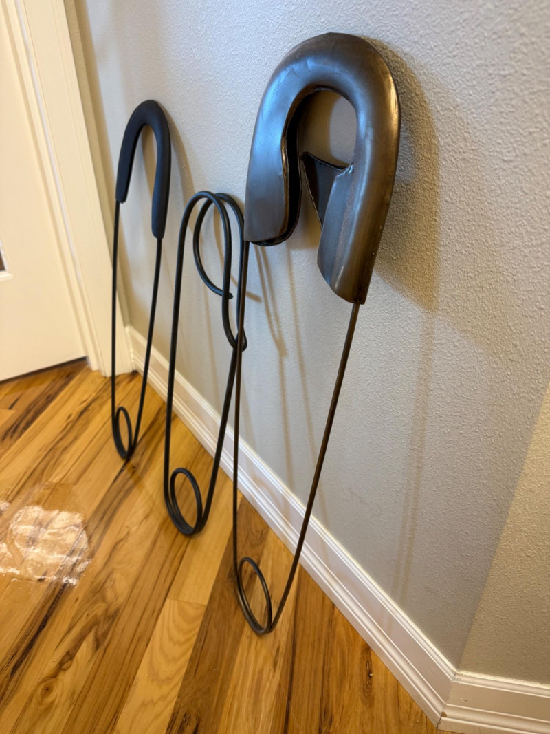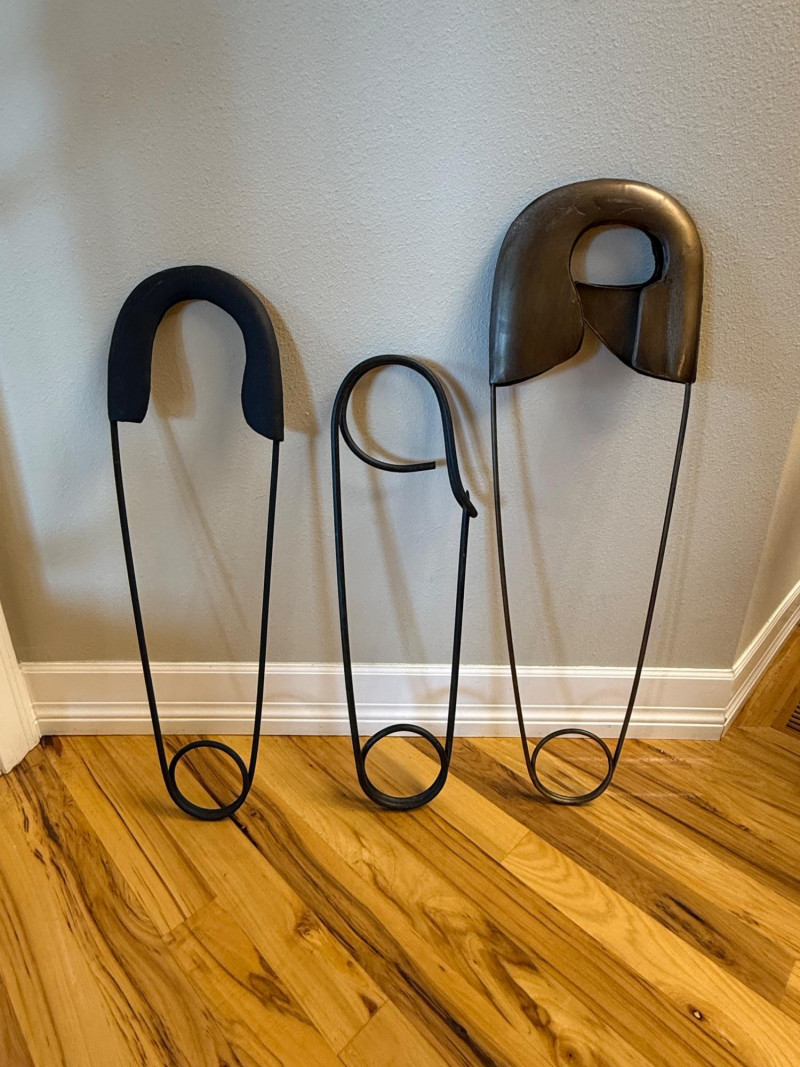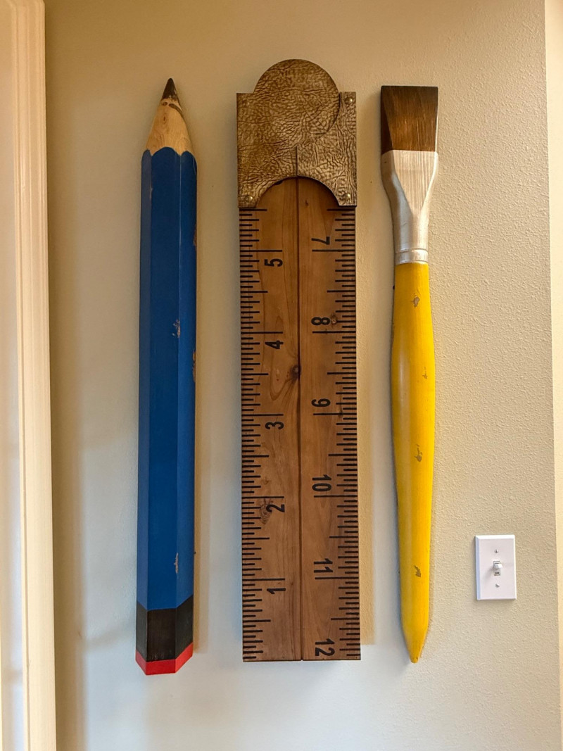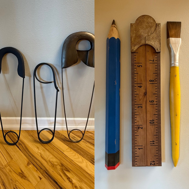 A group of large, whimsical decorative sculptures styled after everyday objects. On the left are three oversized metal safety‑pin sculptures, each with a different curve and finish. On the right are three oversized art‑themed wall pieces: a large blue pencil, a wooden ruler marked 1–12, and a big paintbrush with a yellow handle. These pieces are playful, bold, and designed as statement décor.