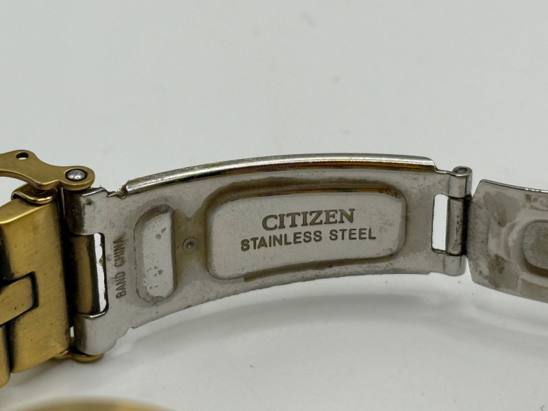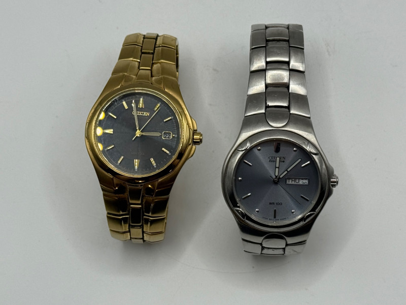 Two classic Citizen men’s wristwatches, each with a different finish and dial style. Both are rated WR 100 (water‑resistant to 100 meters) and feature a date or day‑date window at the 3 o’clock position. Both working and keeping time.