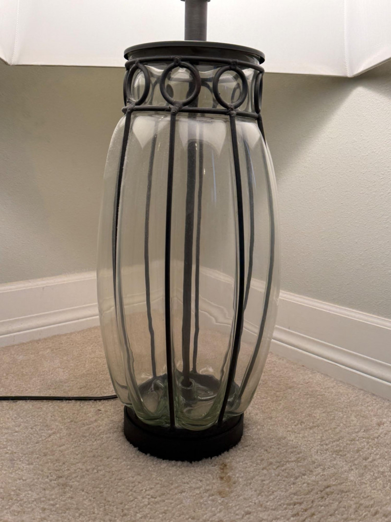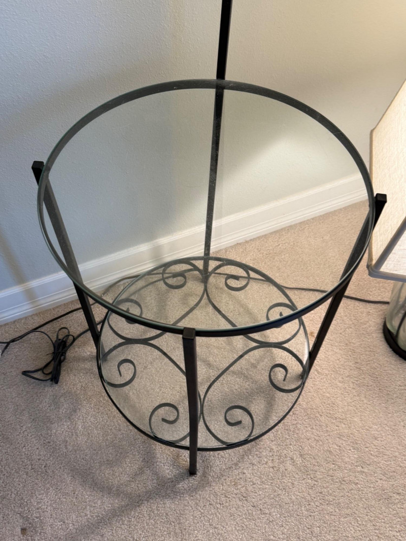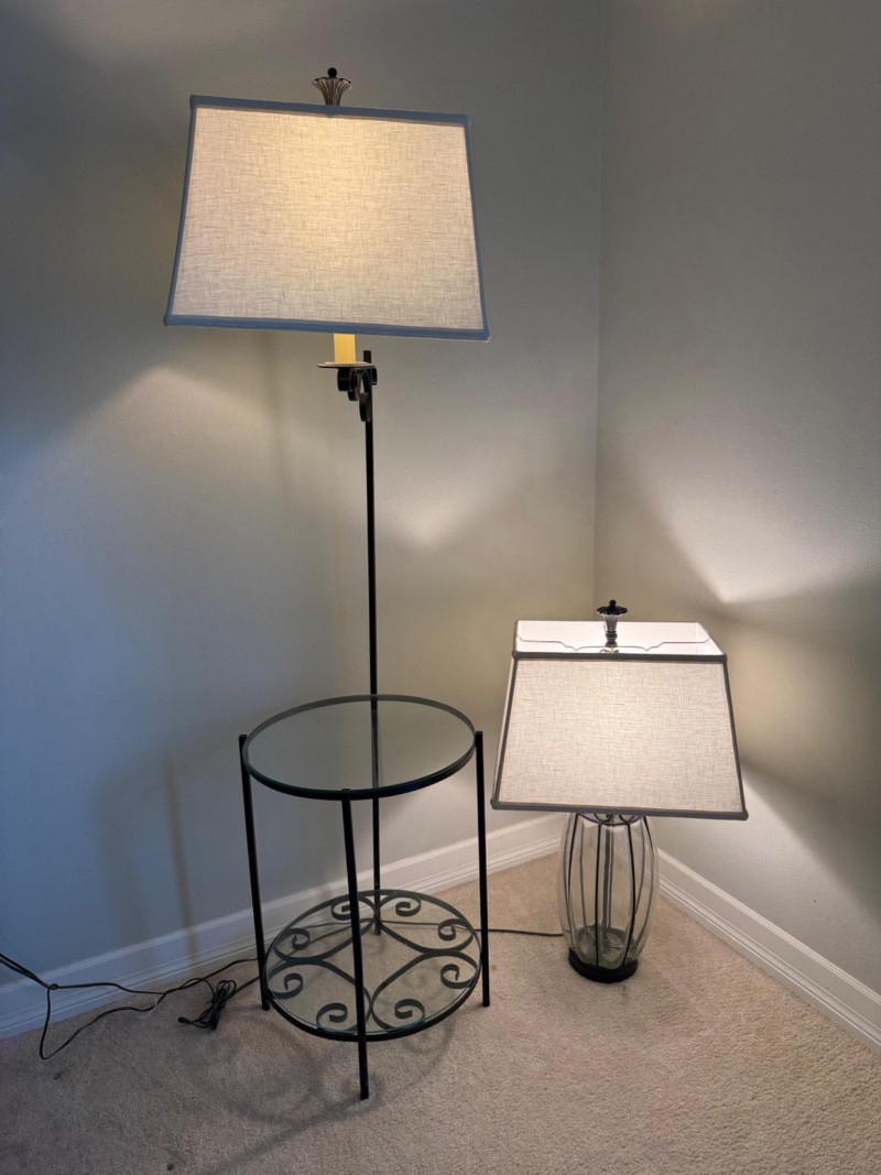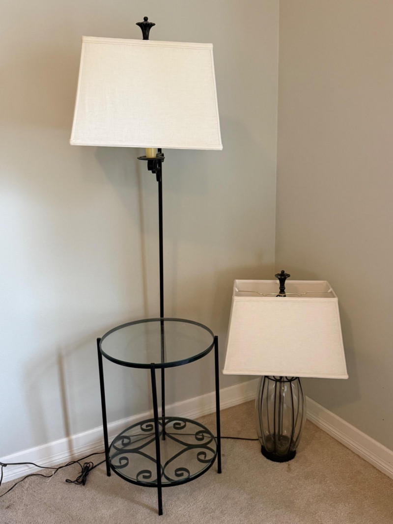 Lot includes a metal floor lamp with an attached round glass‑top table and lower metal scrollwork shelf. The floor lamp has a rectangular fabric shade. Also included is a matching table lamp with a rectangular fabric shade and glass/metal base. Both lamps are shown powered on Lamp with table is 61” h. Table top is 15” wide. Lamp is 30” tall.