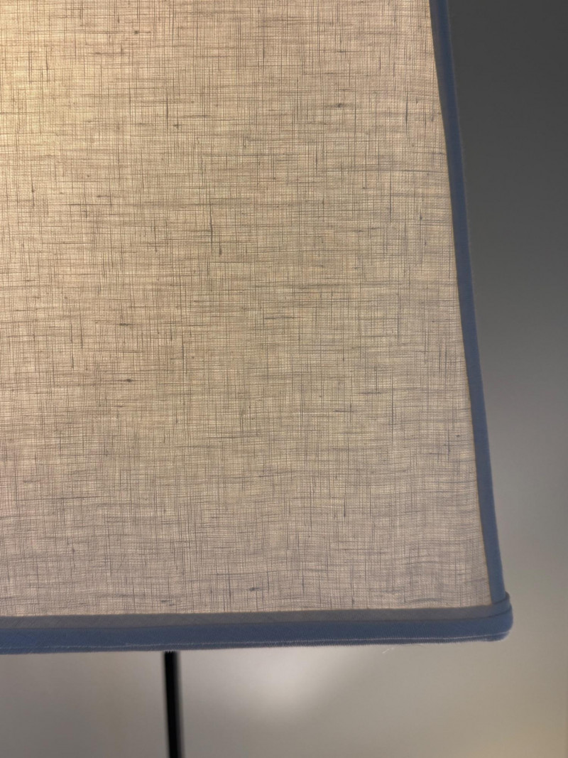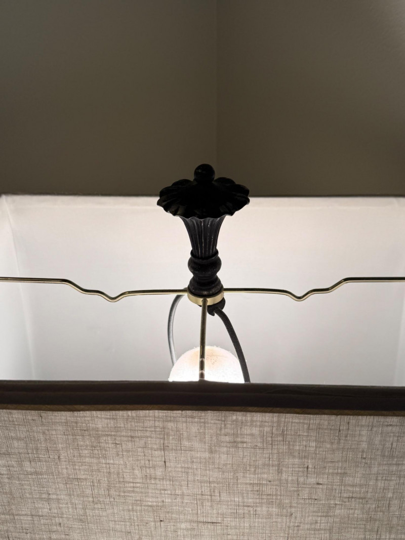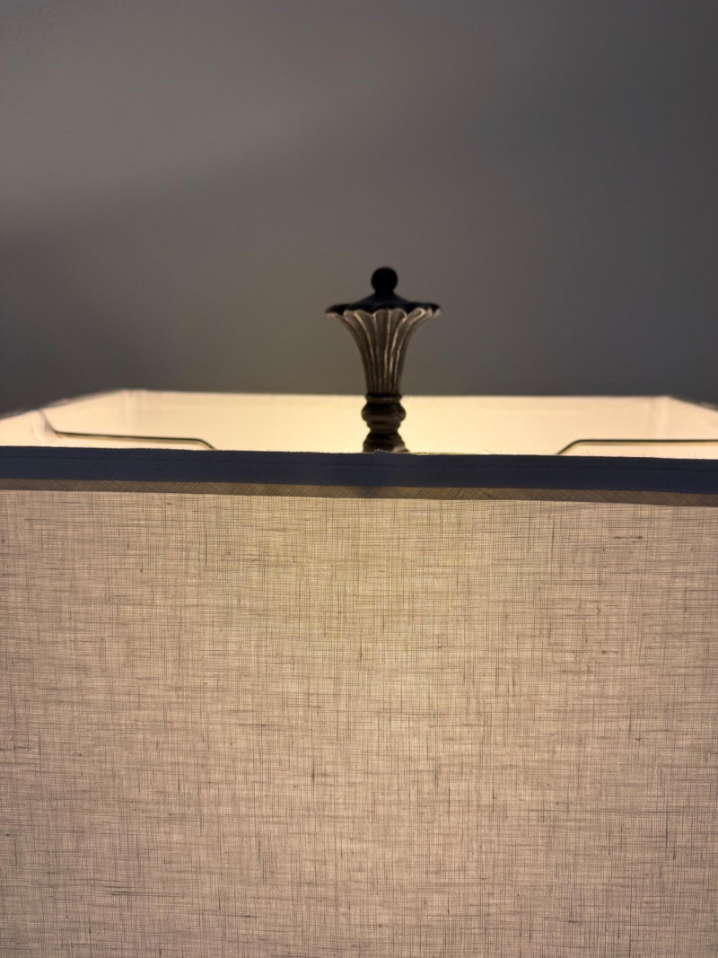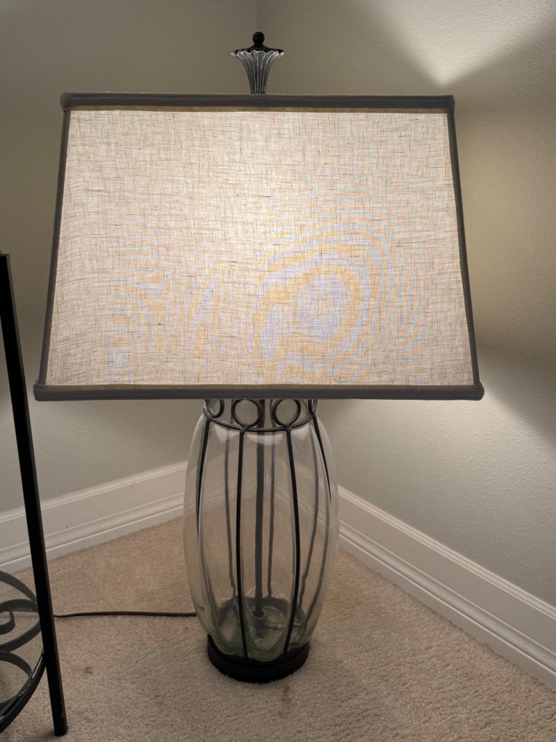 Lot includes a metal floor lamp with an attached round glass‑top table and lower metal scrollwork shelf. The floor lamp has a rectangular fabric shade. Also included is a matching table lamp with a rectangular fabric shade and glass/metal base. Both lamps are shown powered on Lamp with table is 61” h. Table top is 15” wide. Lamp is 30” tall.