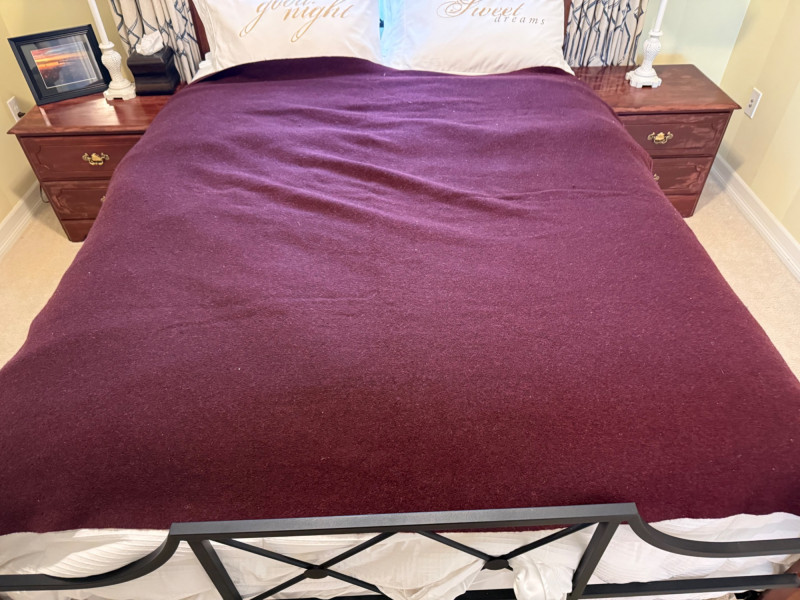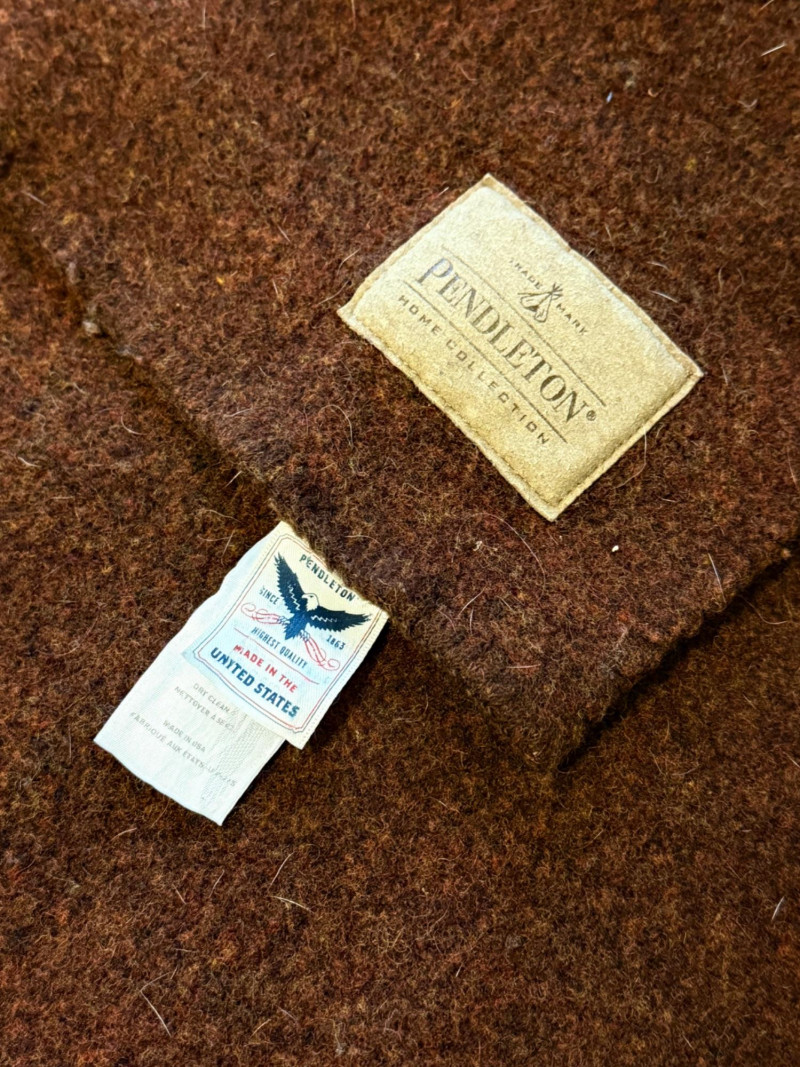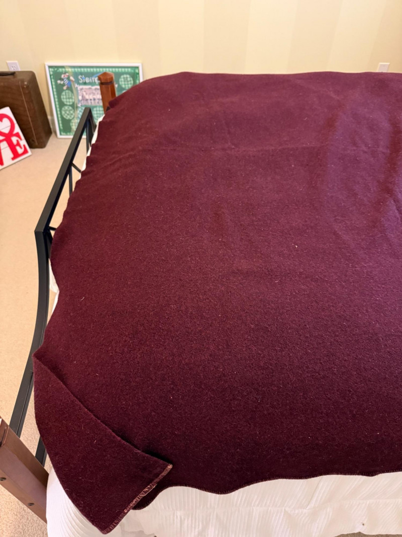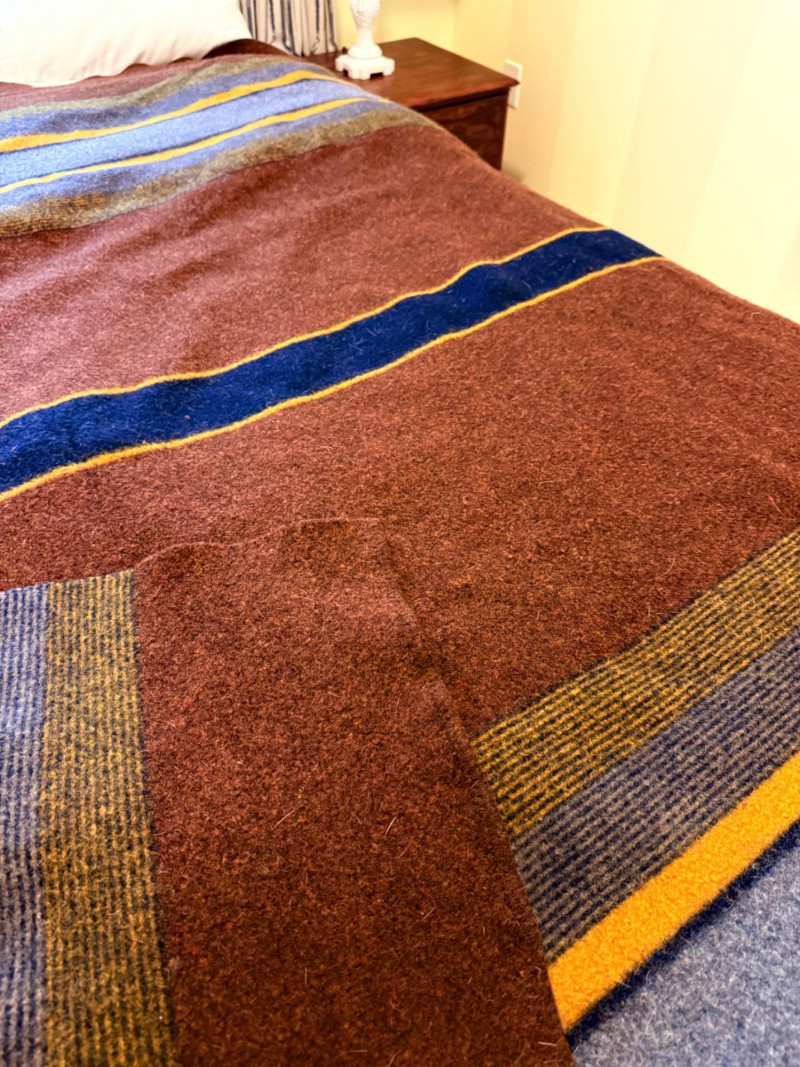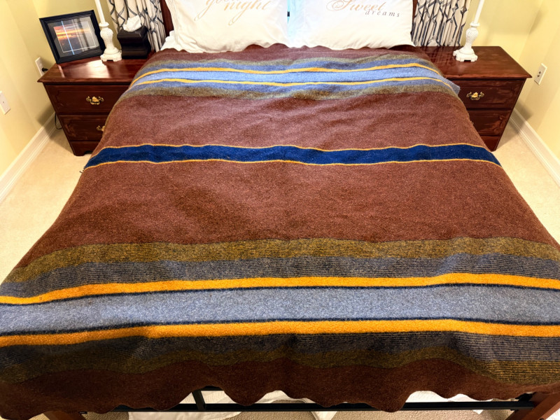 Pendleton wool blanket displayed on a queen‑size bed. Features horizontal multicolor stripes in brown, blue, gray, mustard, and olive tones. Standard wool weave with finished edges. Solid burgundy wool blanket displayed on a queen‑size bed. Standard woven wool construction with finished edges.