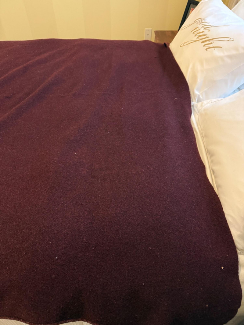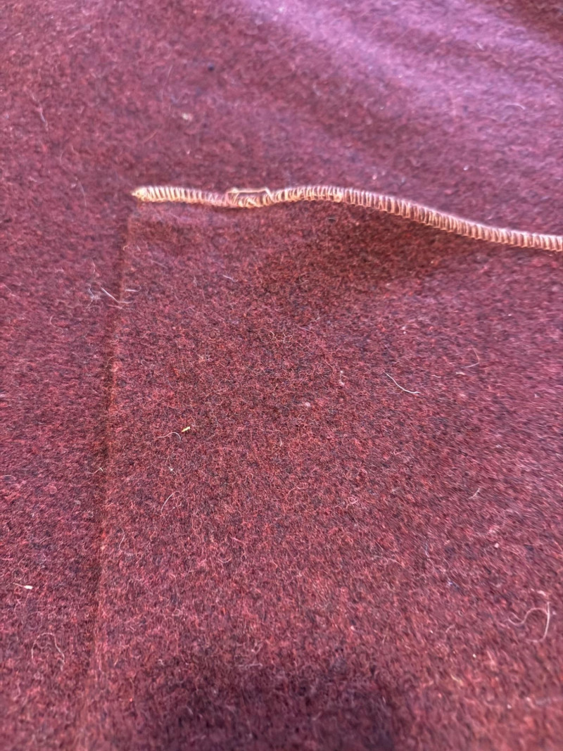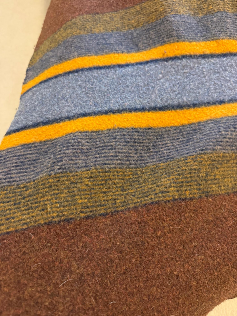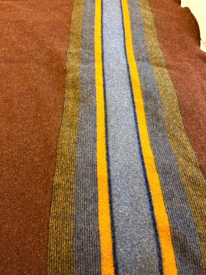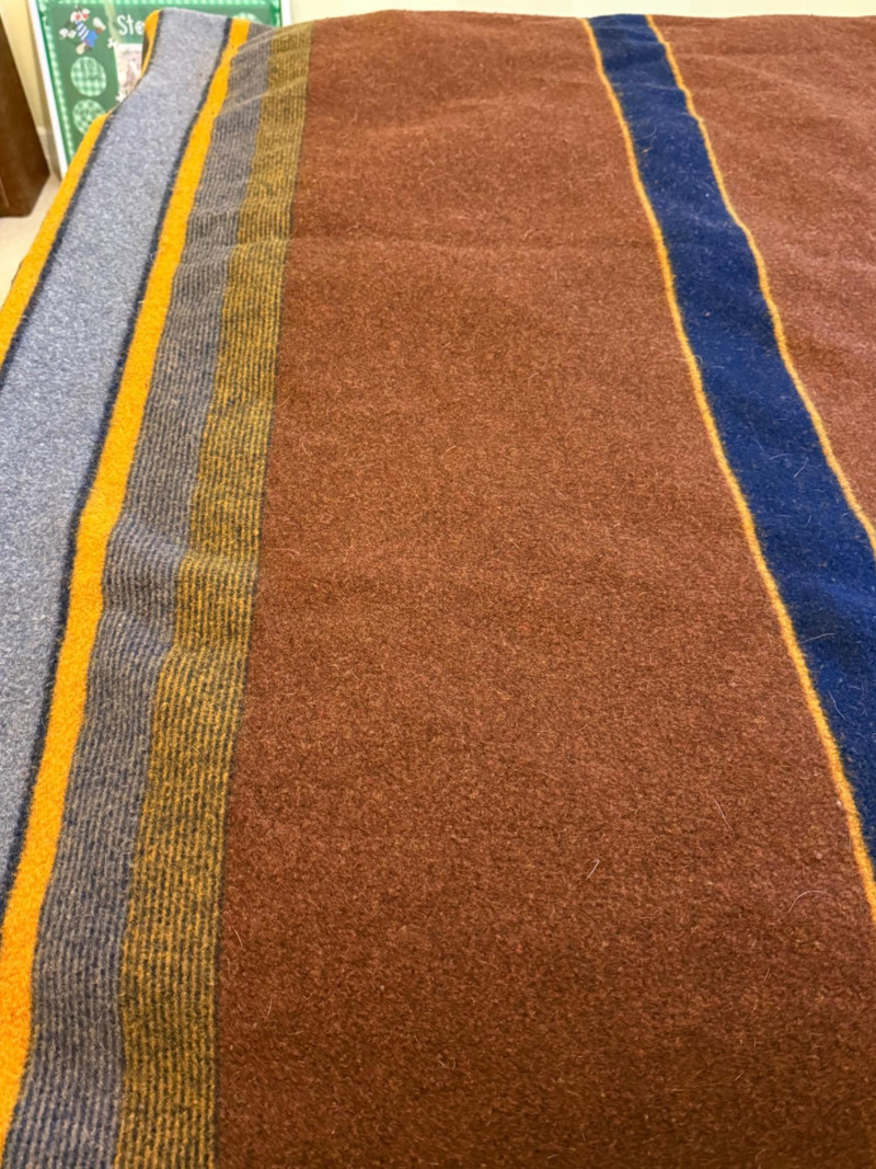 Pendleton wool blanket displayed on a queen‑size bed. Features horizontal multicolor stripes in brown, blue, gray, mustard, and olive tones. Standard wool weave with finished edges. Solid burgundy wool blanket displayed on a queen‑size bed. Standard woven wool construction with finished edges.