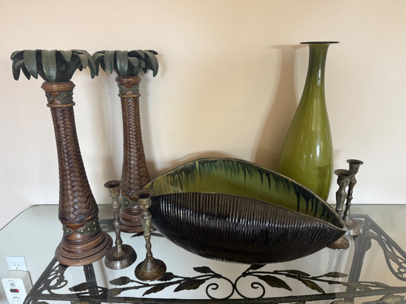 Lot # 49 - Green Tropical Decor-Bowl, Vase, and Candle Holders