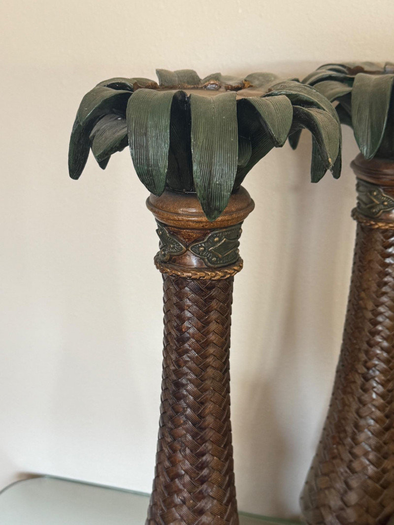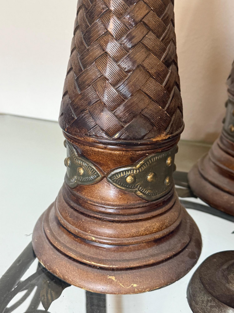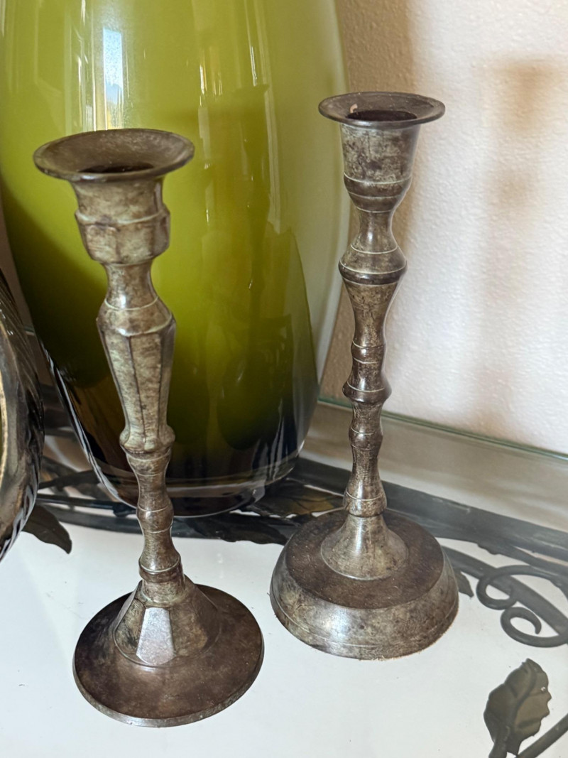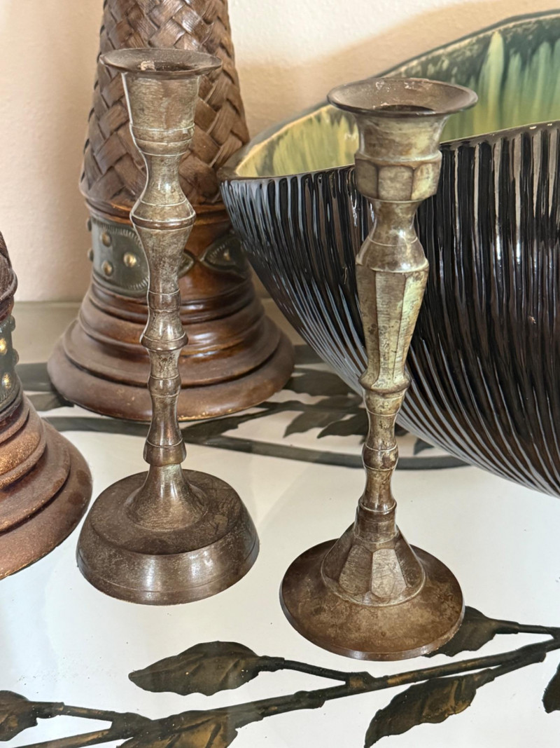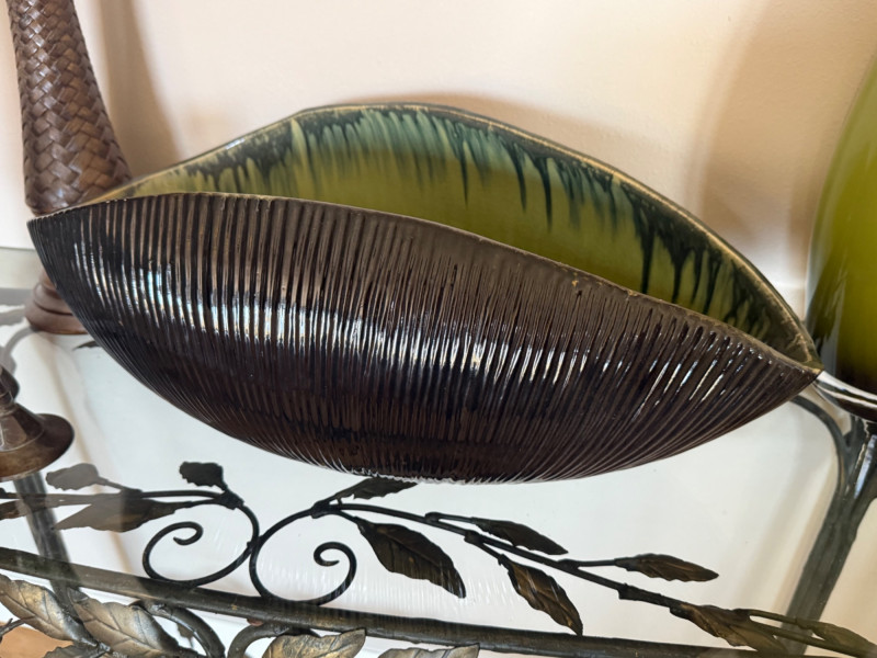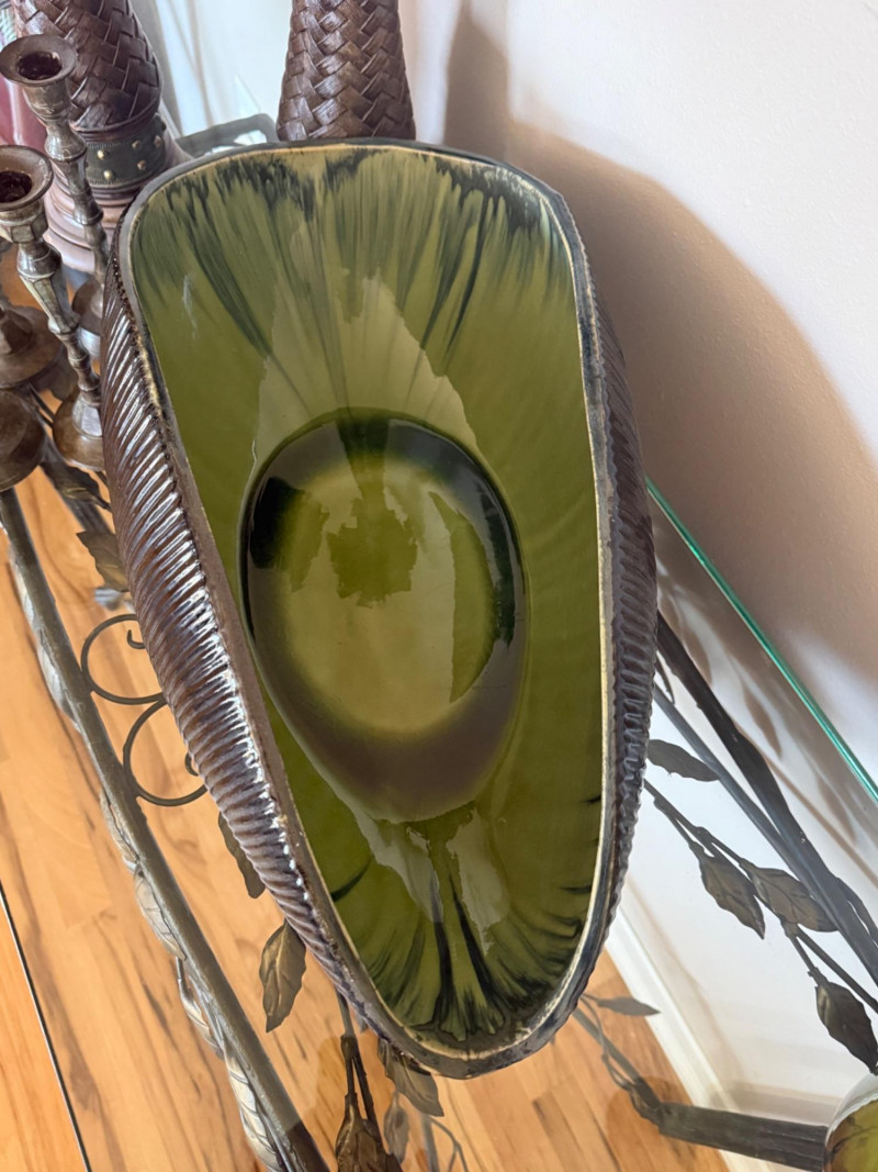 A coordinated home‑decor grouping featuring natural textures and warm earth tones. The display includes two tall woven‑style candle holders with palm‑leaf‑shaped tops, a large green ceramic vase with a narrow neck, a wide ribbed ceramic bowl in green and dark brown, and several small brass/bronze candle holders. The mix of ceramic, metal, and textured materials creates an elegant, organic look. Green glass case is 19.5” tall. Large bowl is 20.5” w x 7.5” h.