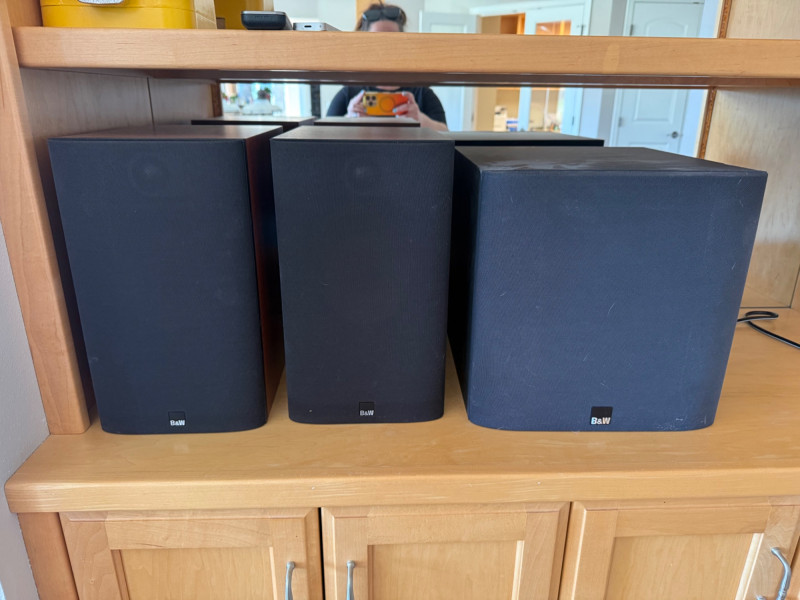 Set includes one Bowers & Wilkins subwoofer and two Bowers & Wilkins speakers. All pieces feature black cabinets with black fabric grilles and the B&W logo at the lower front. Speakers are 13.5” h x 8” w x 12.5” d. Subwoofer is 12.25” h x 12.25” w x 13.75” d.