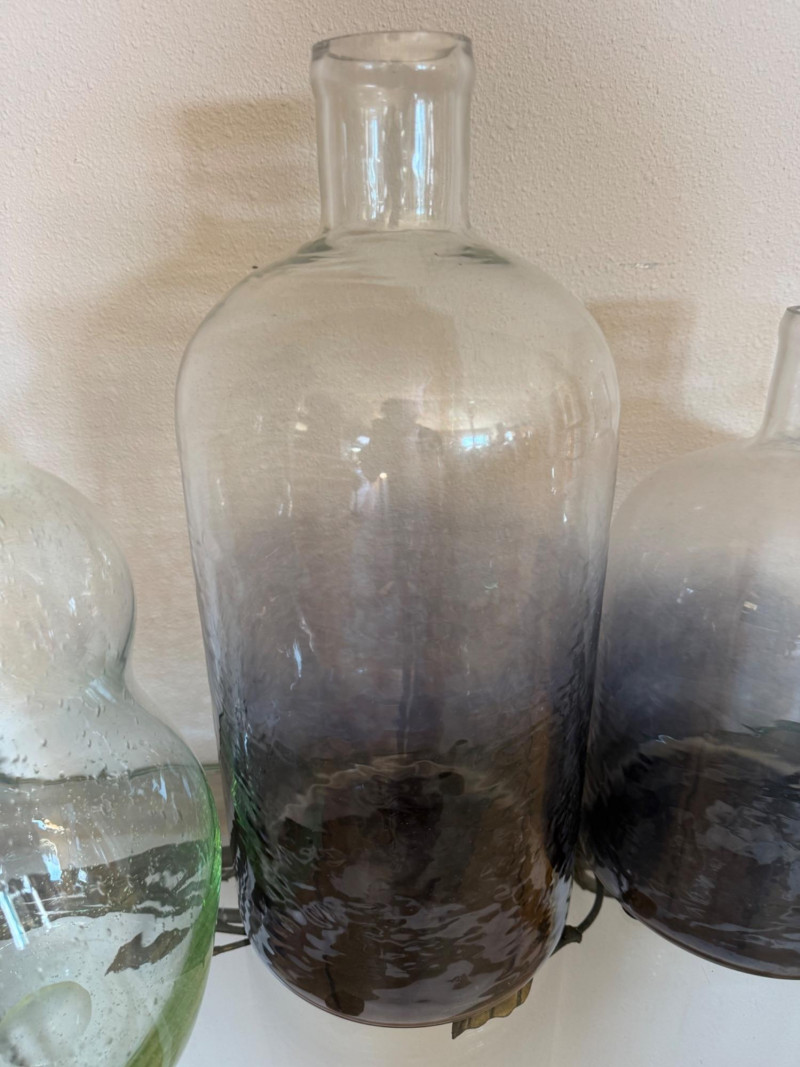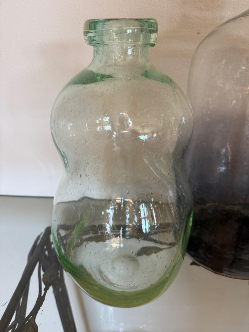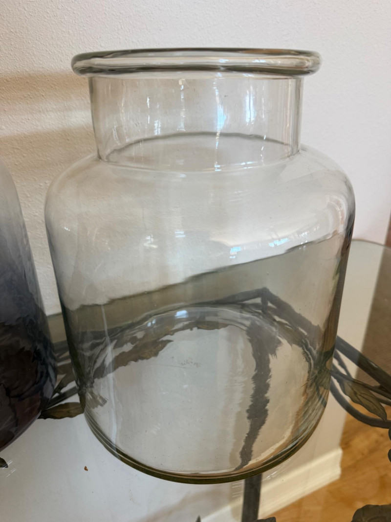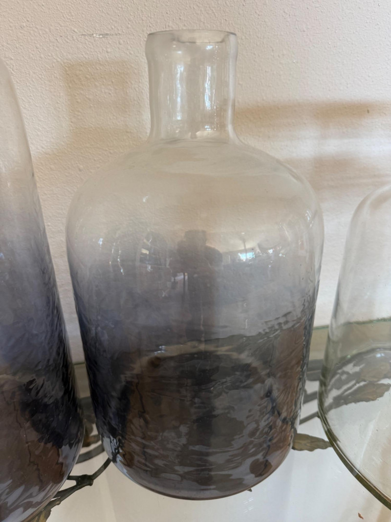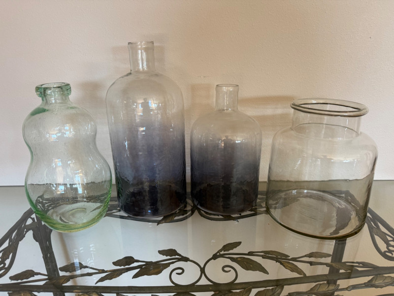 Group of four decorative glass vessels in assorted shapes and finishes, including: One green‑tinted bottle with curved body and narrow neck Two clear bottles with dark‑to‑clear gradient coloring and short necks One clear wide‑mouth jar with cylindrical form and thick rim
