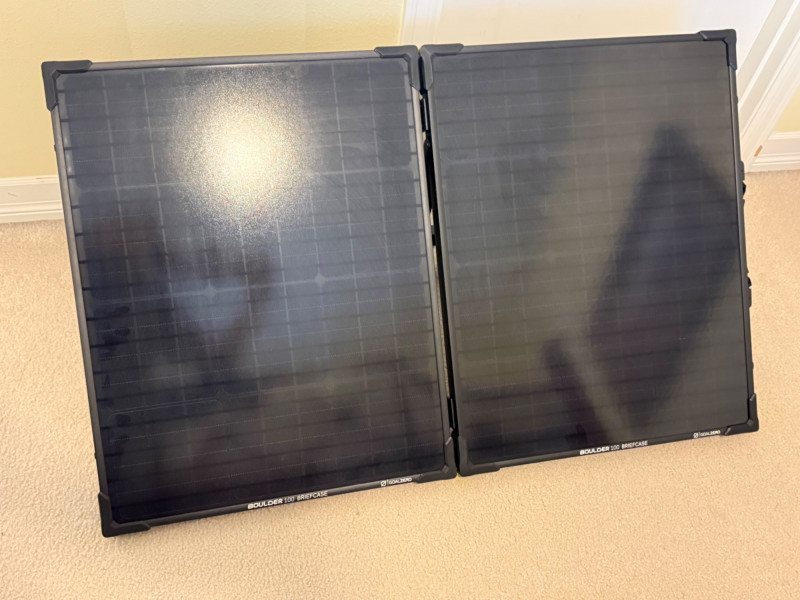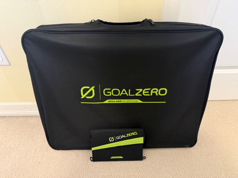 Set includes two Goal Zero portable solar panels in branded carrying cases: Goal Zero Boulder 100 Briefcase (larger case) Goal Zero Nomad (smaller case) 1. Goal Zero Boulder 100 Briefcase