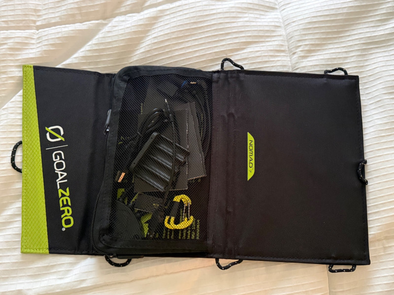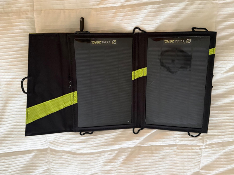 A portable solar panel designed to collect sunlight and convert it into usable power. Folds like a briefcase for transport Used to charge power stations, batteries, or run small devices (through a power station) Typically paired with Goal Zero Yeti power stations 2. Goal Zero Nomad (small panel)