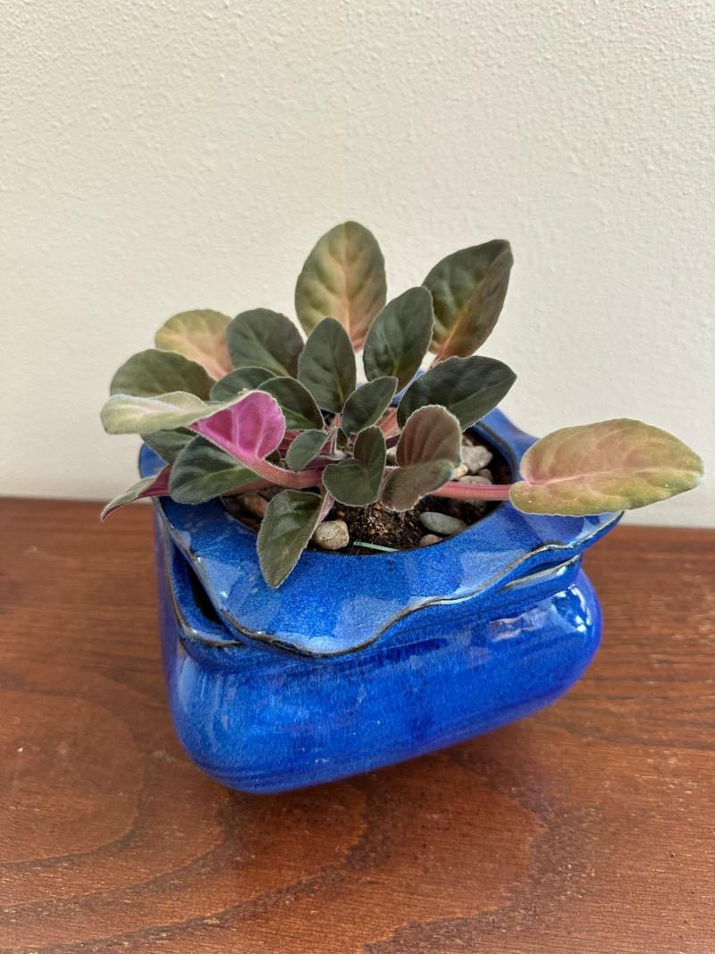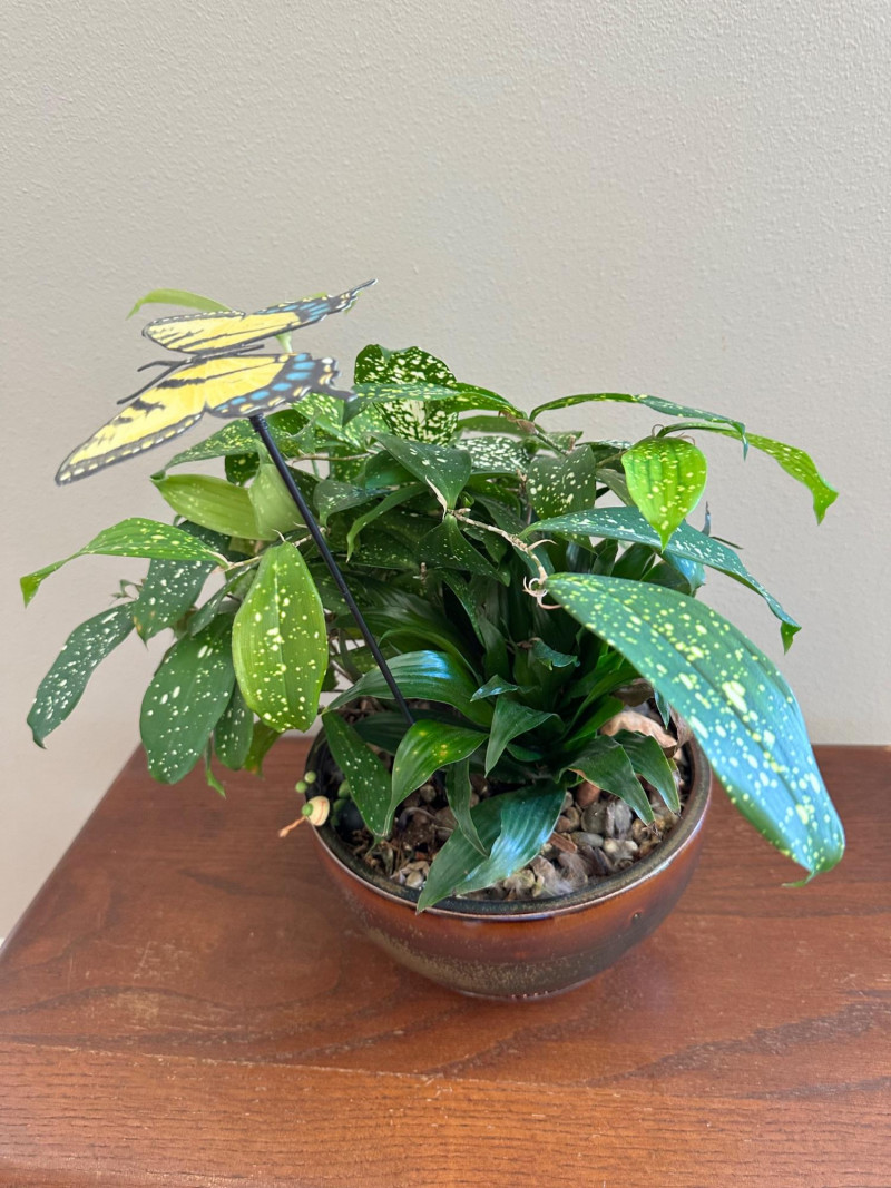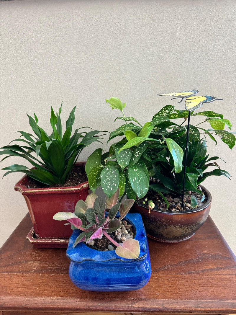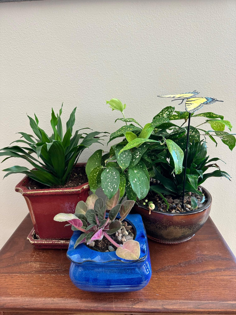 Group of three live houseplants in assorted ceramic pots, including: Plant 1: Upright plant with long, narrow green leaves in a red square ceramic pot Plant 2: Broad‑leaf green plant with white speckling in a round brown pot, with a decorative butterfly pick Plant 3: Compact plant with green leaves and purple undersides in a bright blue ceramic pot with wavy rim All plants appear healthy at time of listing. Pots included.