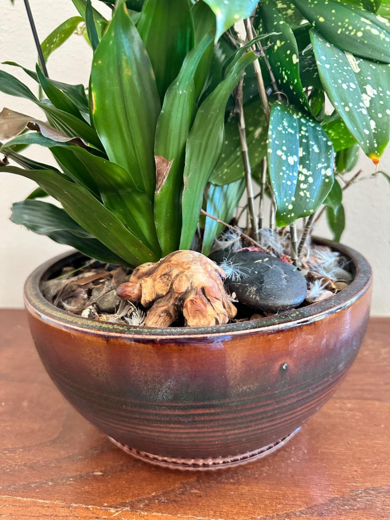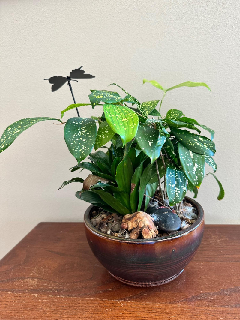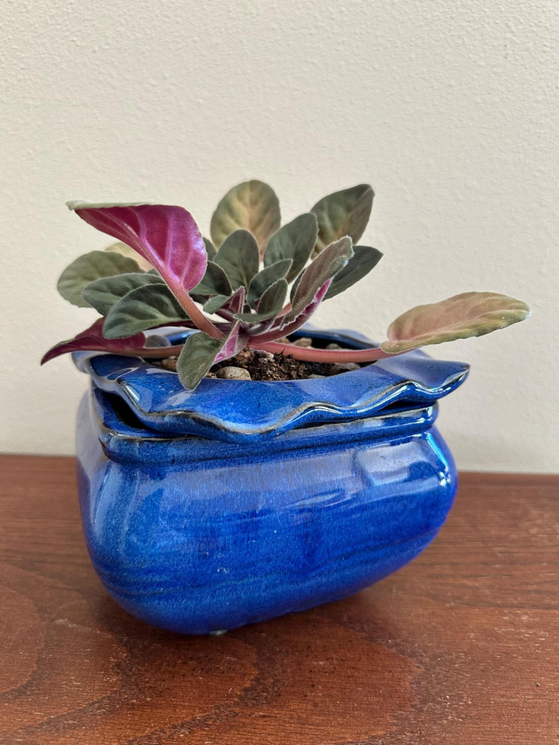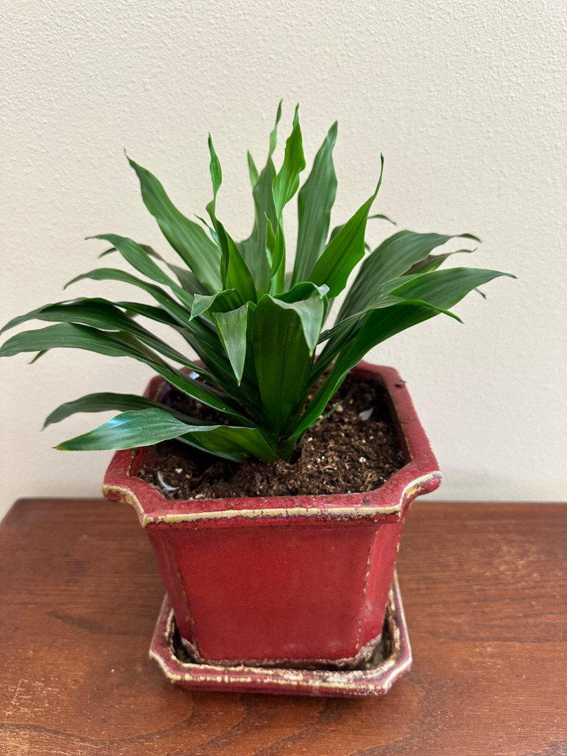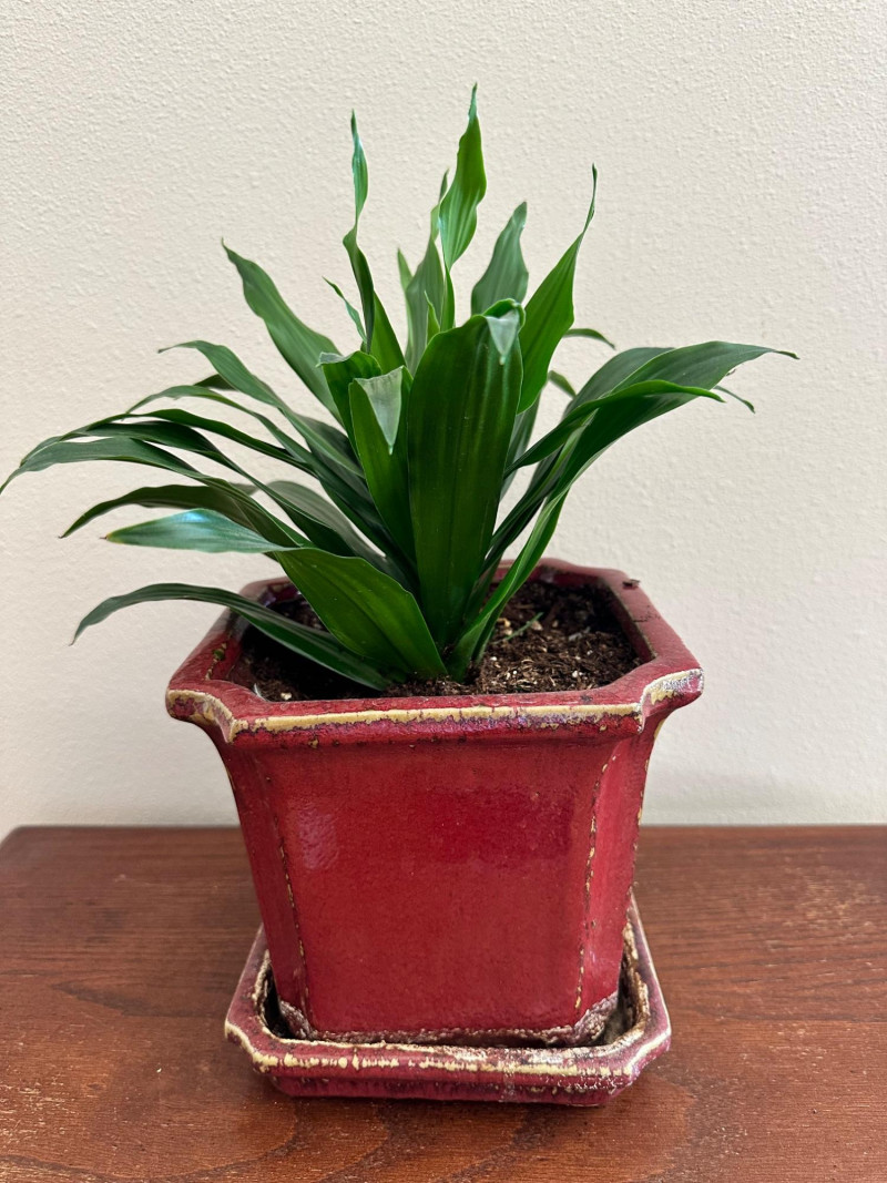 Group of three live houseplants in assorted ceramic pots, including: Plant 1: Upright plant with long, narrow green leaves in a red square ceramic pot Plant 2: Broad‑leaf green plant with white speckling in a round brown pot, with a decorative butterfly pick Plant 3: Compact plant with green leaves and purple undersides in a bright blue ceramic pot with wavy rim All plants appear healthy at time of listing. Pots included.