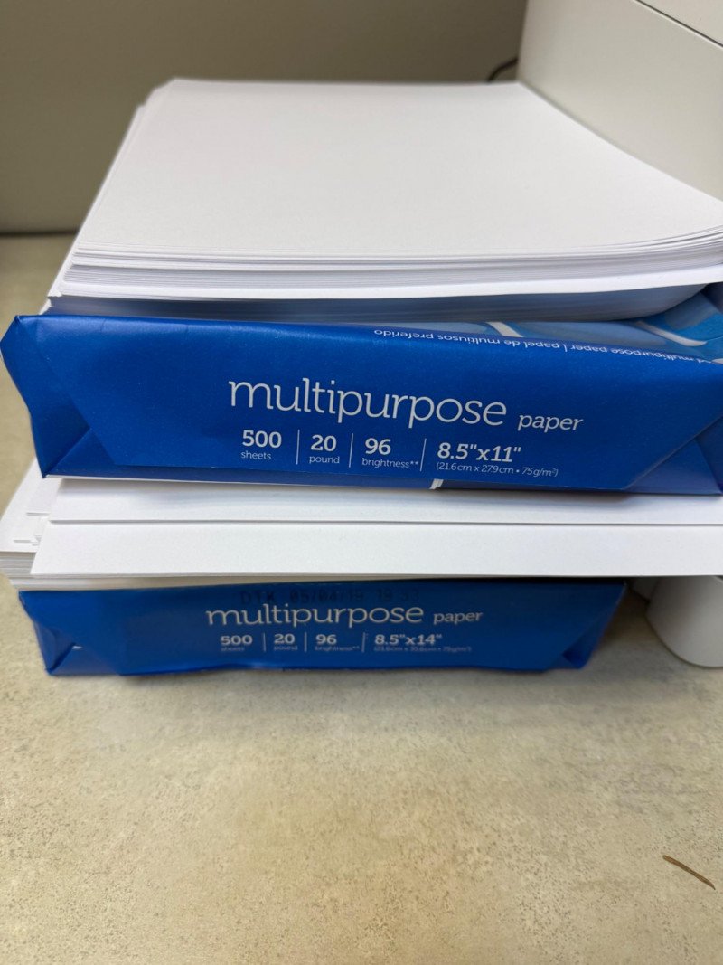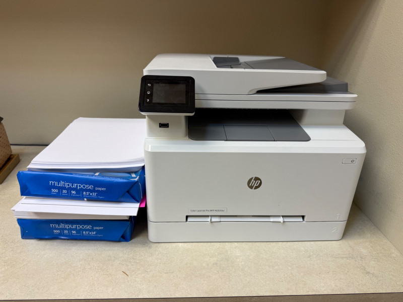 HP Color LaserJet Pro MFP printer in white finish, featuring a touchscreen control panel and front output tray. Includes two reams of multipurpose 8.5" × 11" paper (500 sheets each, 20 lb, 96 brightness).