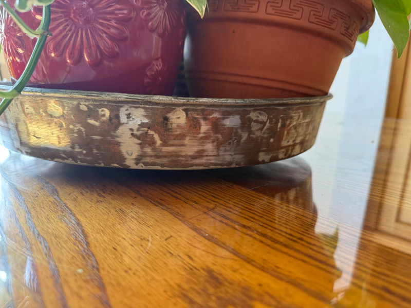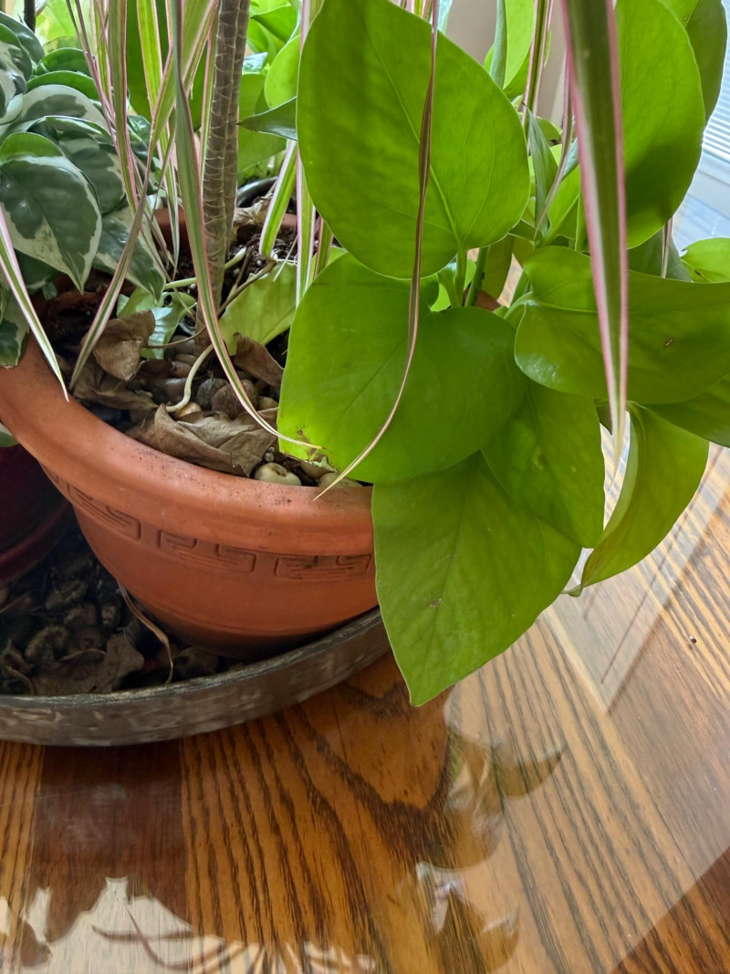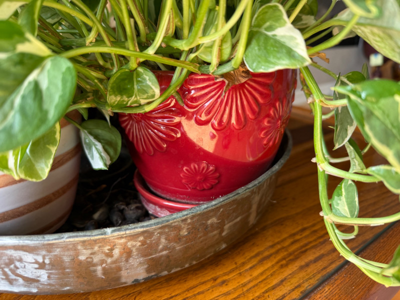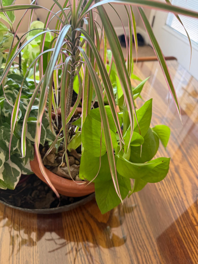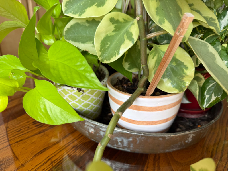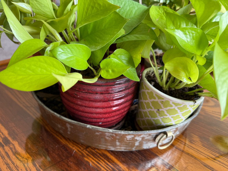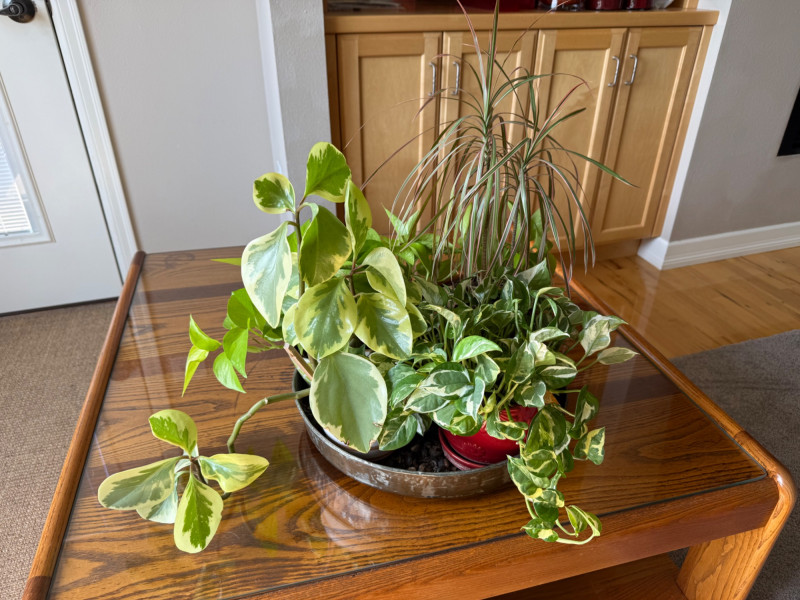 Collection of assorted live houseplants arranged together in a shallow metal tray. Includes a mix of leafy green and variegated varieties, along with one taller plant featuring long, narrow striped leaves. A trailing vine extends over the edge of the tray. Tallest plant 14 inches tall.