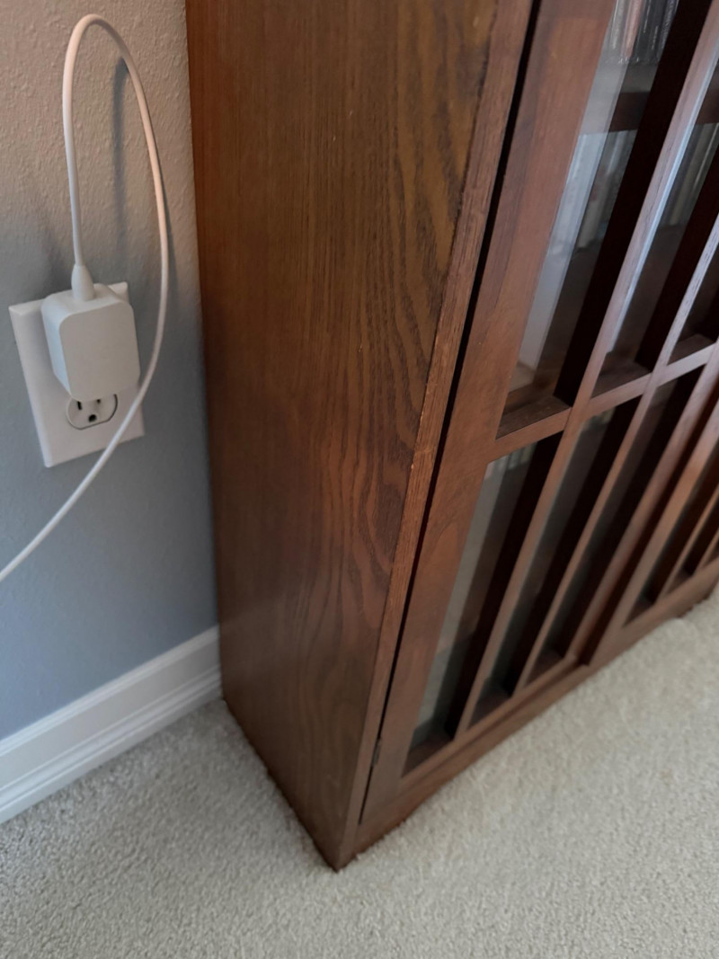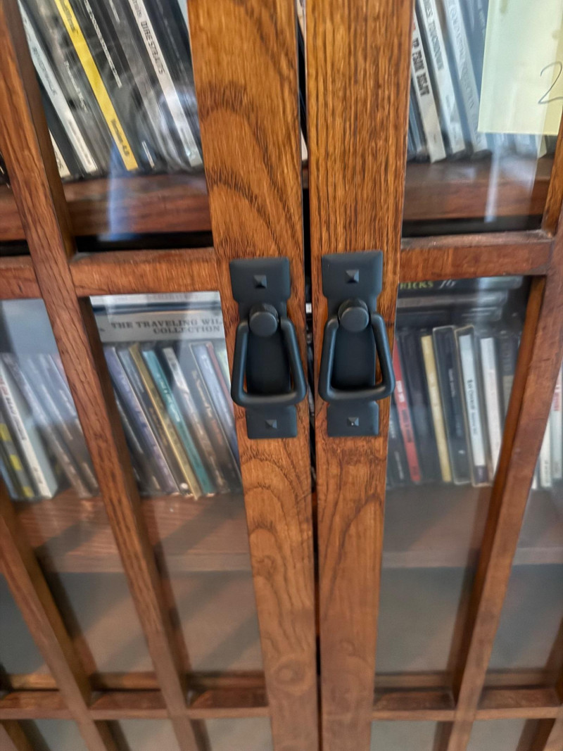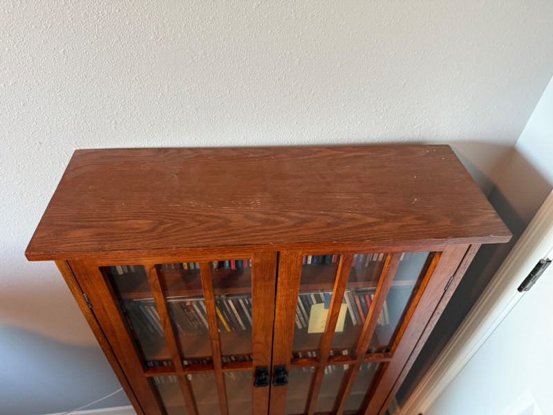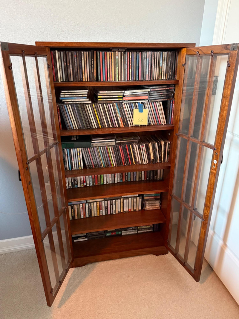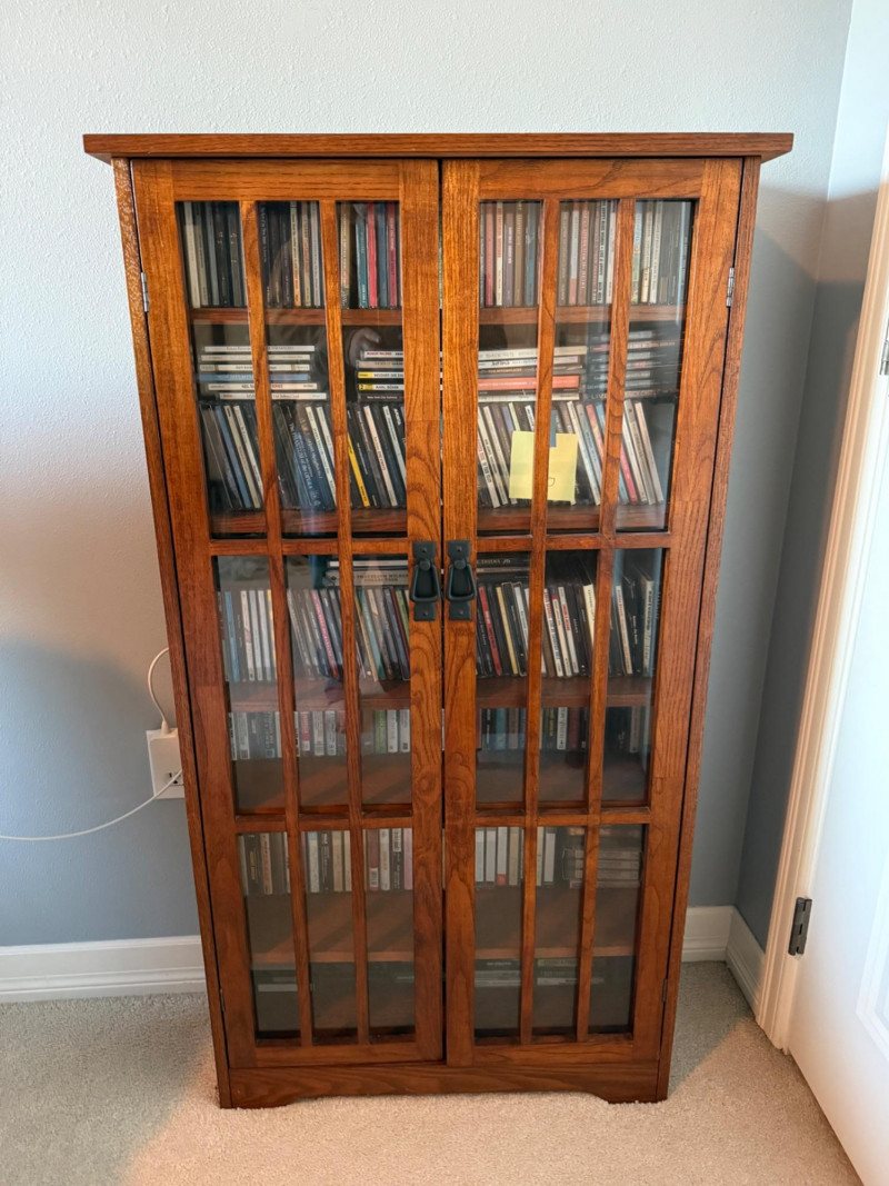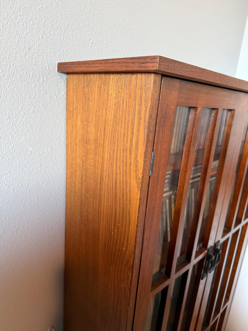 Medium‑tone wood media cabinet with two glass‑paneled doors and black metal handles. Interior fitted with multiple shelves currently holding CDs (contents not included per listing).