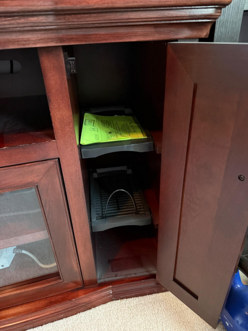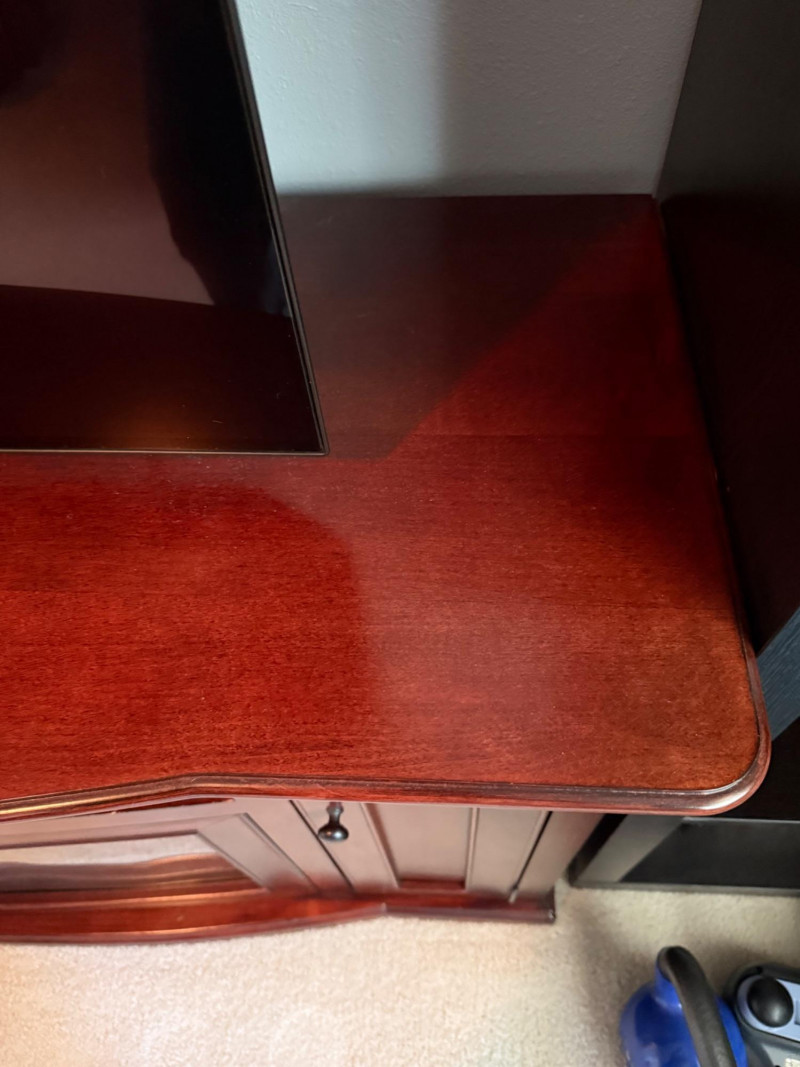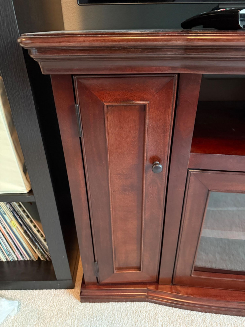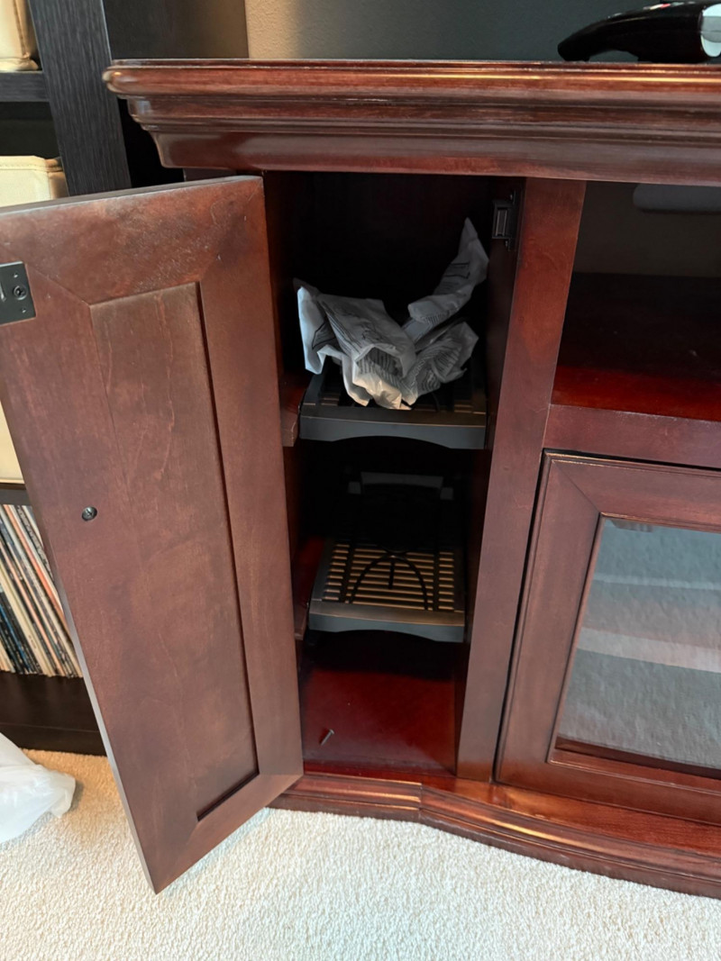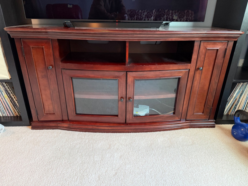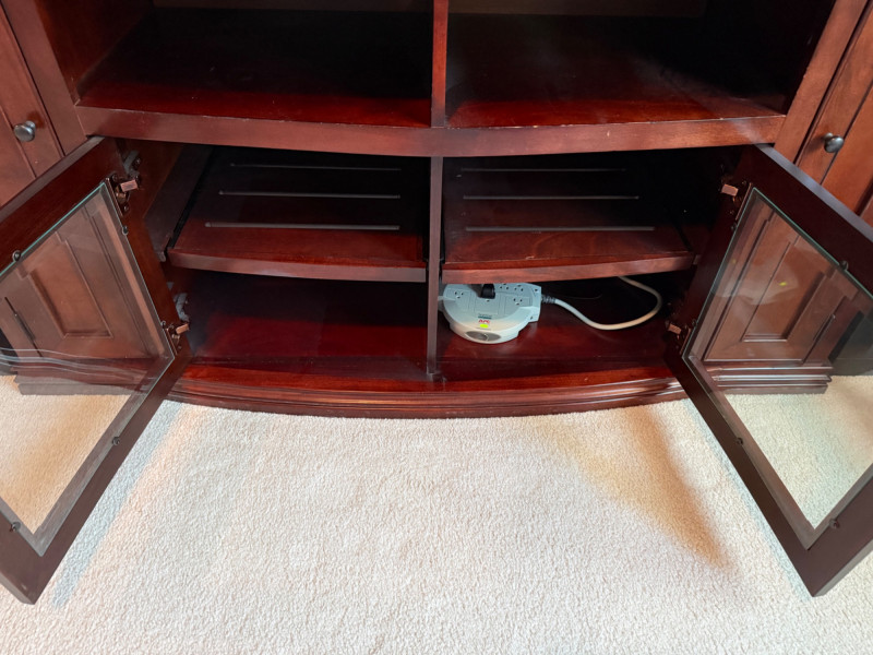 Dark wood entertainment console with a curved front edge and multiple storage compartments, including: Two tall side cabinets with paneled doors Two open center shelves for media components Two lower glass‑paneled doors with interior shelving