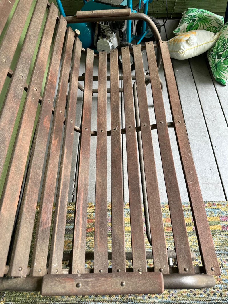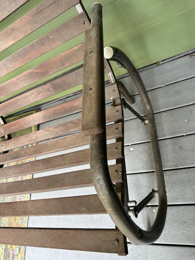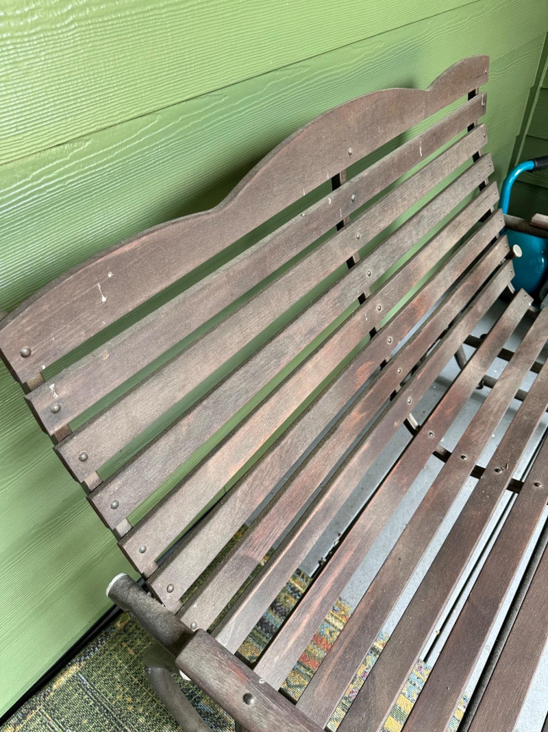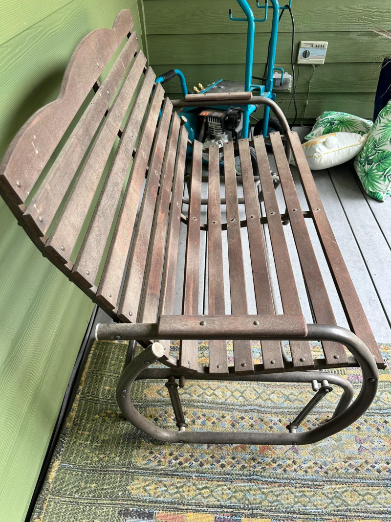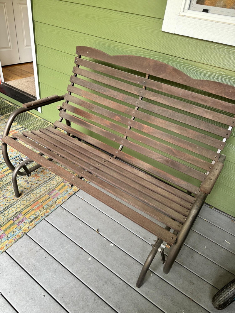 Light outdoor wear consistent with normal use. Glides easily and is in good conditon. Has been under porch out of weather. May need a touch up staining.