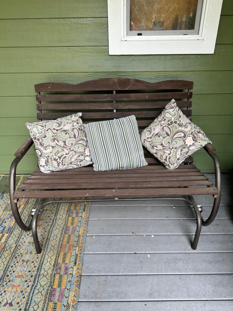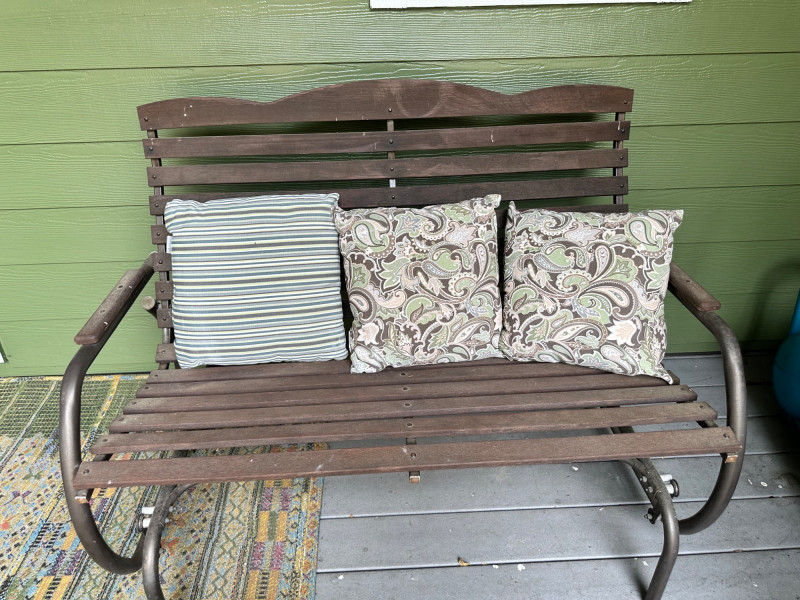 Outdoor glider featuring a metal frame with slatted wood seat and back, accompanied by three loose cushions (two paisley‑patterned, one green‑striped). Designed for porch or patio seating. Dimensions: 47" W × 22" D × 35" T
