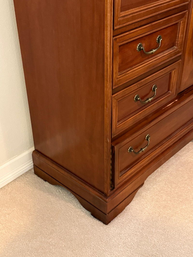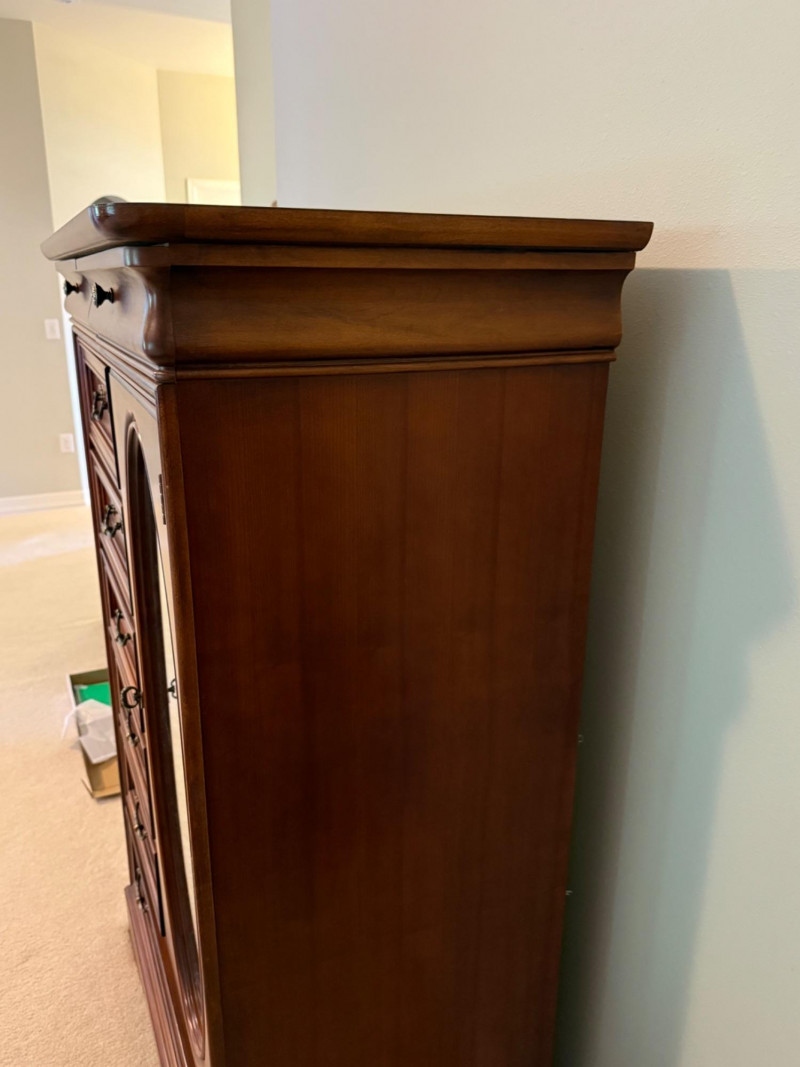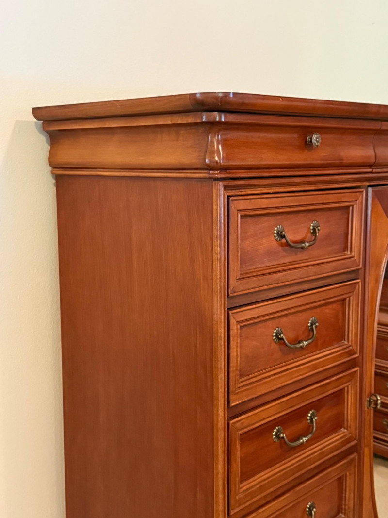 Traditional Lexington armoire in a warm brown wood finish featuring: Six stacked drawers on the left side with ornate brass pulls One full‑height door on the right with an oval inset mirror, opening to interior storage (not shown) One wide lower drawer spanning the full width Classic molded drawer fronts and decorative trim