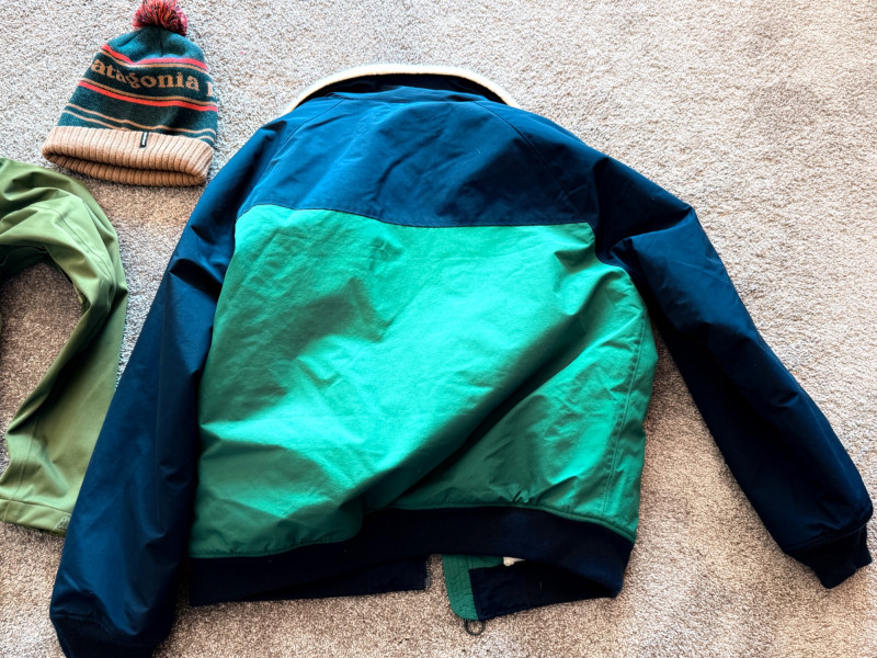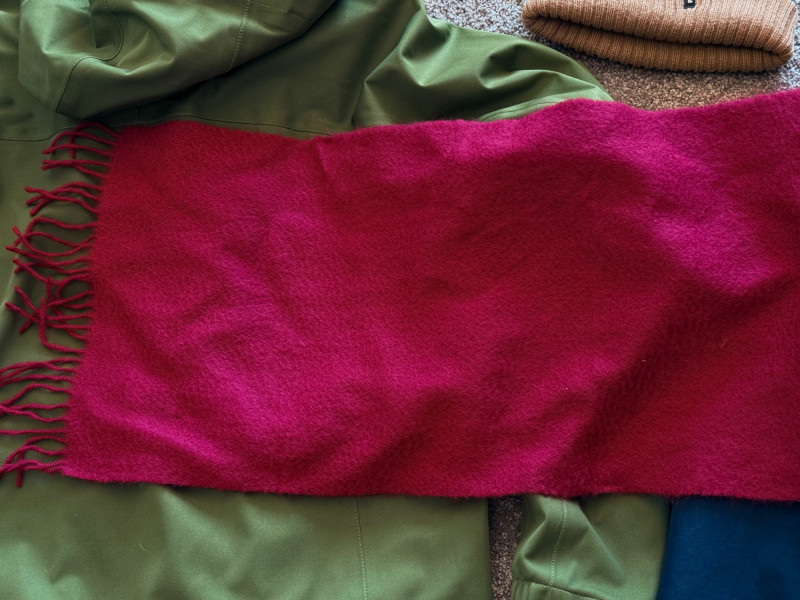Mid‑weight zip‑up jacket Attached hood and zippered pockets Casual outdoor style Good for cool‑weather layering Bright red wool scarf with fringe. Soft, warm, classic winter accessory Knit beanie with pom‑pom Tan base with green and orange stripes “Patagonia” lettering across the front Warm, casual cold‑weather hat Green body with navy sleeves White fleece collar Zippered pockets Warm, casual outerwear for colder daysGreen Hooded REI Jacket