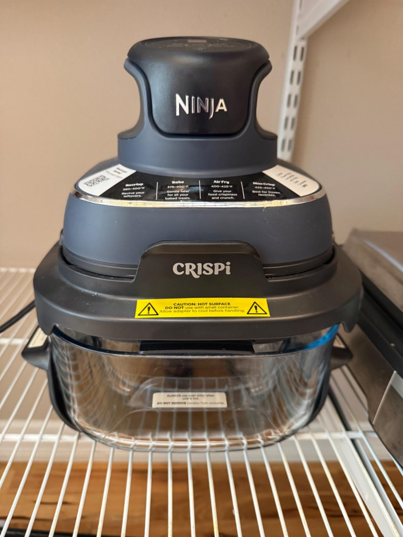 Countertop cooker with clear front chamber Black top section with labeled controls Designed for air frying, crisping, and quick cooking Compact size for kitchen counters Appears in good, lightly used condition Hinged lid with stainless exterior Two front control knobs with indicator lights Clean with normal signs of useNinja “Crispi” Air Fryer / Multi‑Cooker