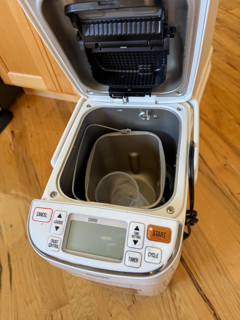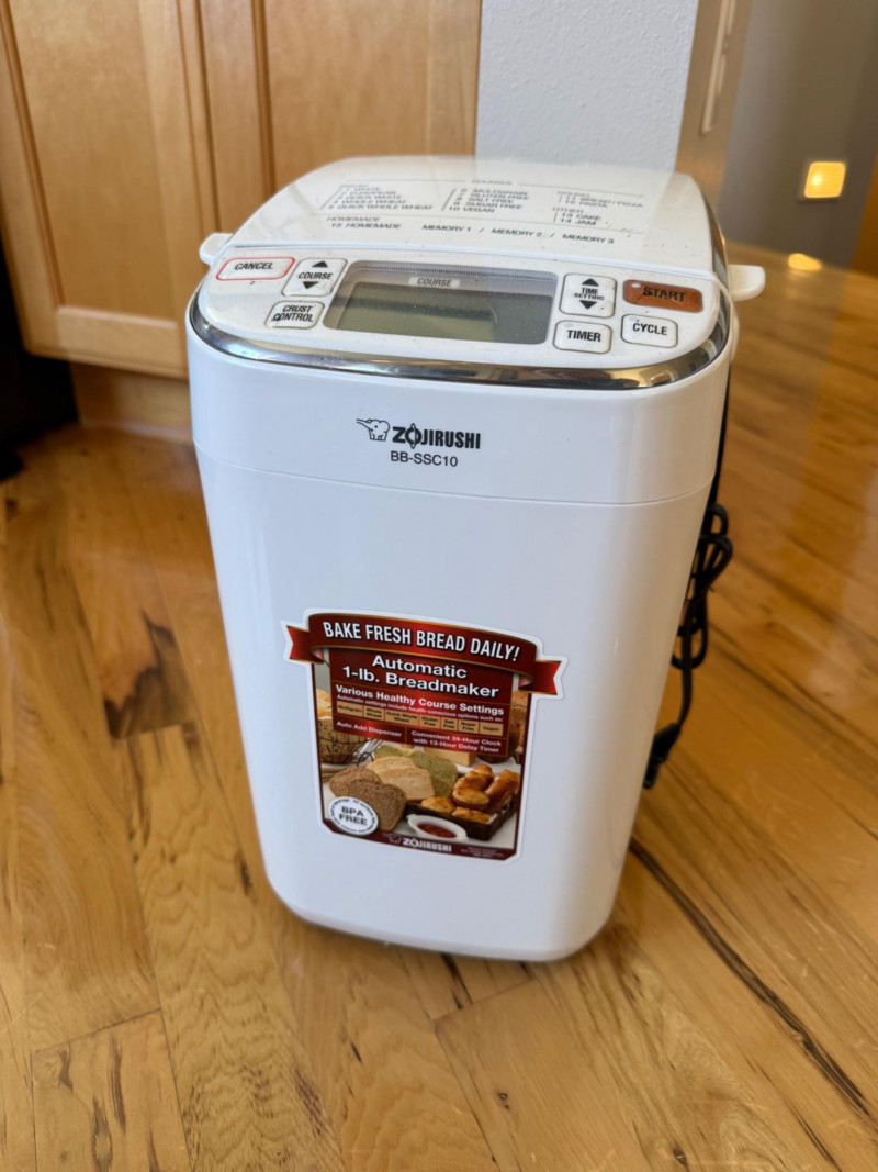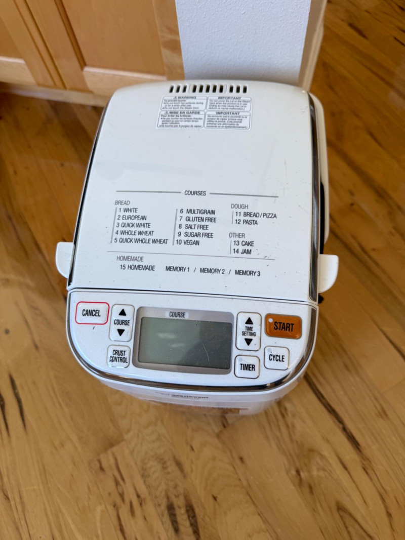 Compact white countertop breadmaker Digital control panel with multiple course settings Features include: 1‑lb loaf capacity, delay timer, auto‑add dispenser, and memory settings Front label highlights healthy baking options Designed for easy, daily homemade bread Appears clean and in good conditionZojirushi Automatic 1‑lb Breadmaker — Simple Info