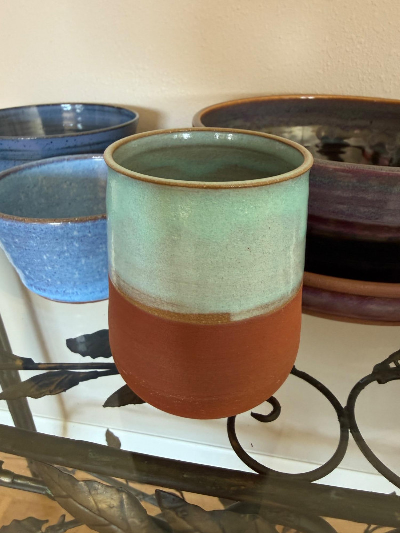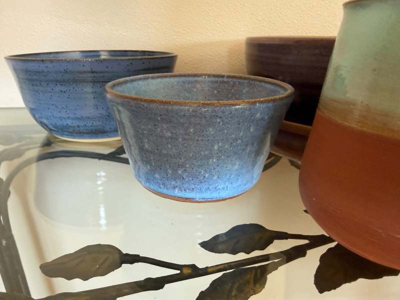 Hand‑thrown ceramic bowls Glossy blue glaze with subtle variation Functional for serving or décor Each piece slightly unique due to handmade nature Deep, wide handmade bowl Rich reddish‑brown glaze with natural texture Statement piece for display or serving Light beige clay with speckled glaze Two small holes near rim (likely for hanging or threading) Rustic, earthy handmade look Compact cup with two‑tone glaze Turquoise interior/upper glaze and warm terracotta base Artistic, decorative piece Handmade mug with handle Blue‑green glaze with natural drip variation Functional and decorativeBlue Bowls (2)