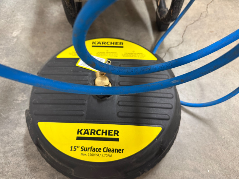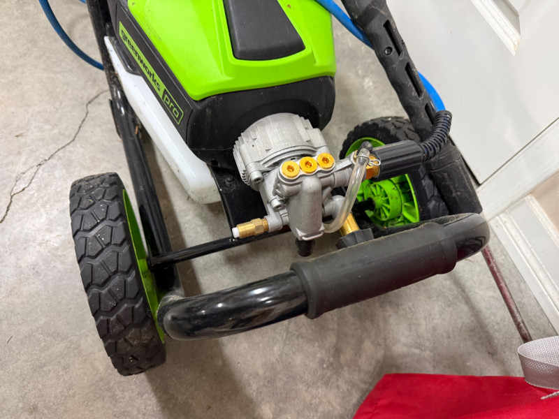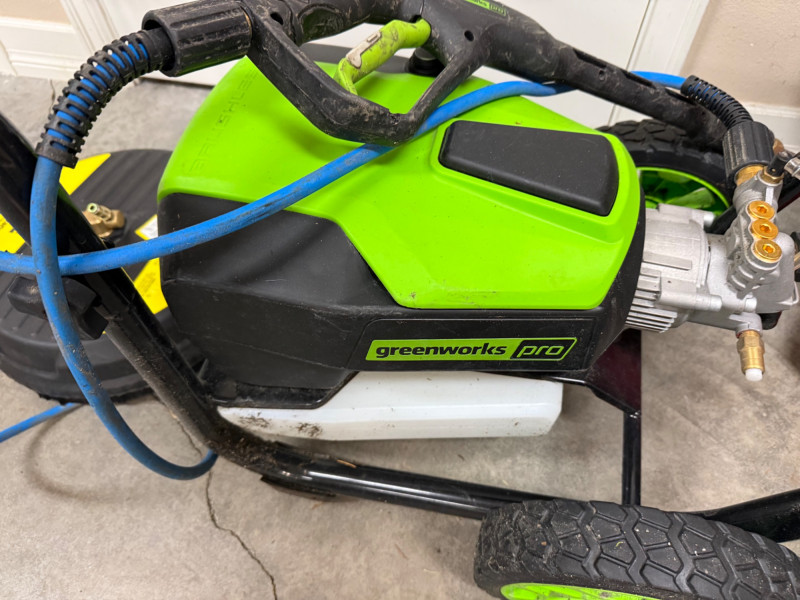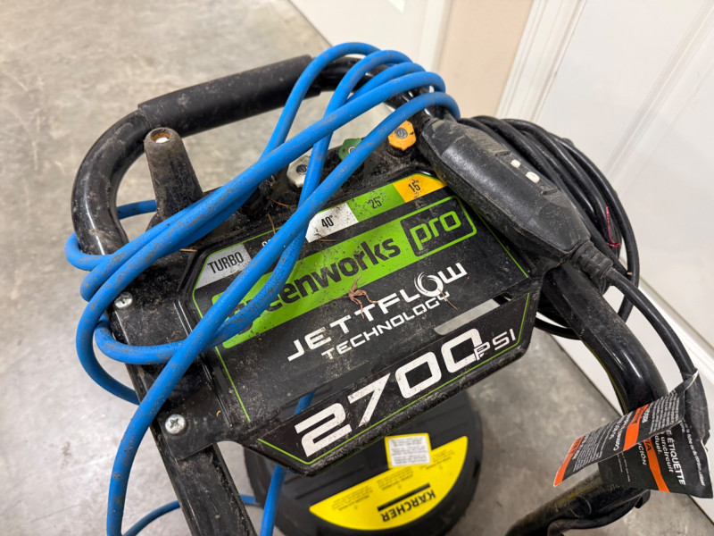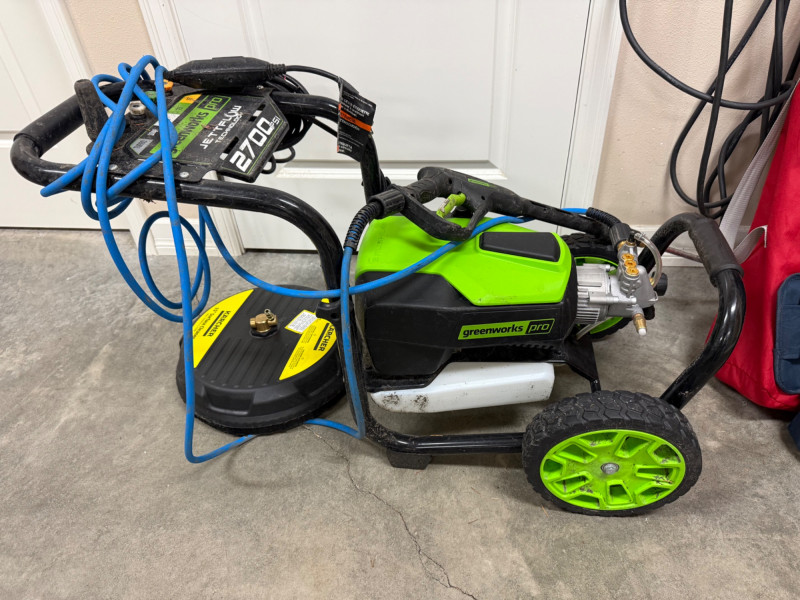 Electric pressure washer with 2700 PSI rating Black metal frame with bright green housing Two large wheels for easy rolling Blue hose coiled on the handle Includes a surface cleaner attachment (yellow/black) Good for driveways, decks, siding, and outdoor cleaningGreenworks Pro Pressure Washer