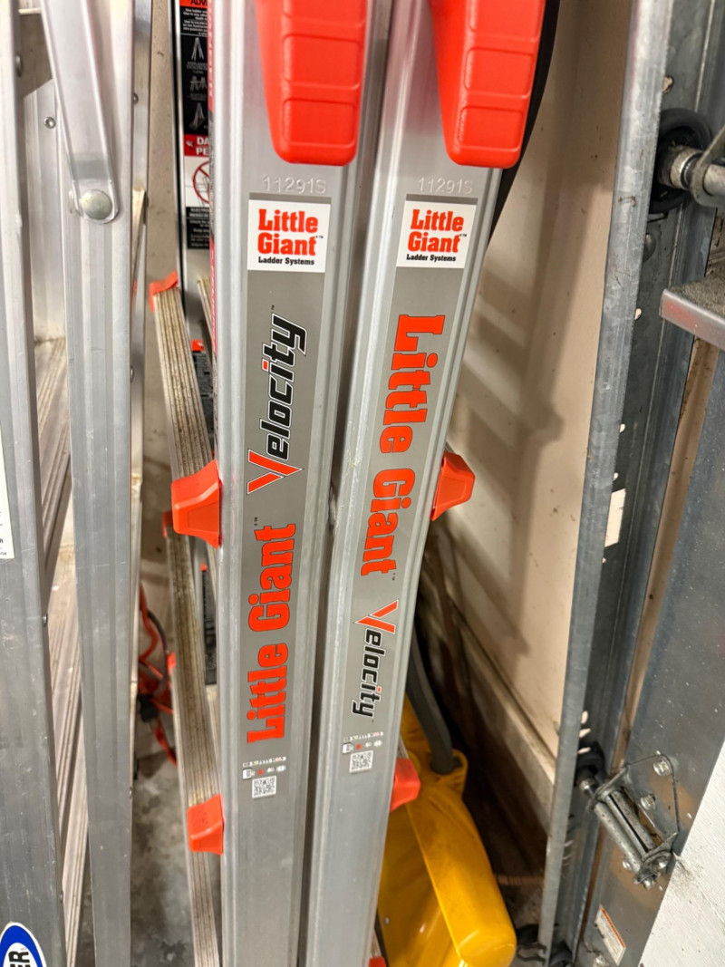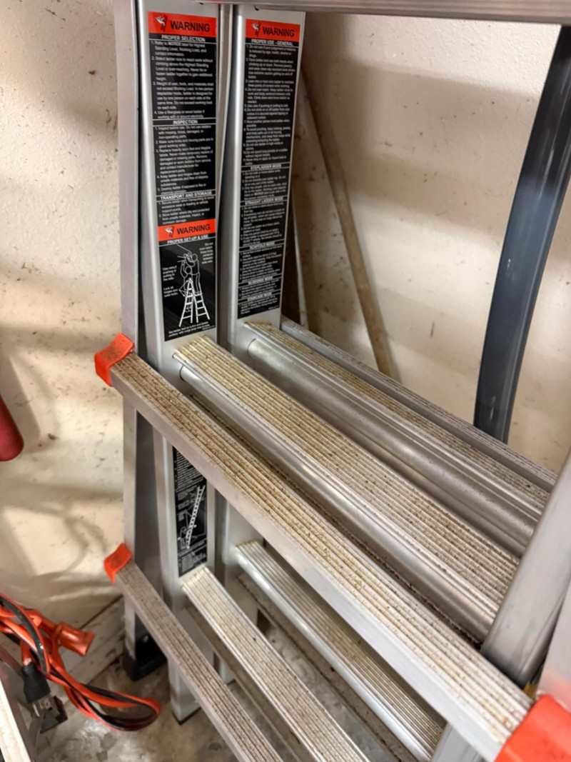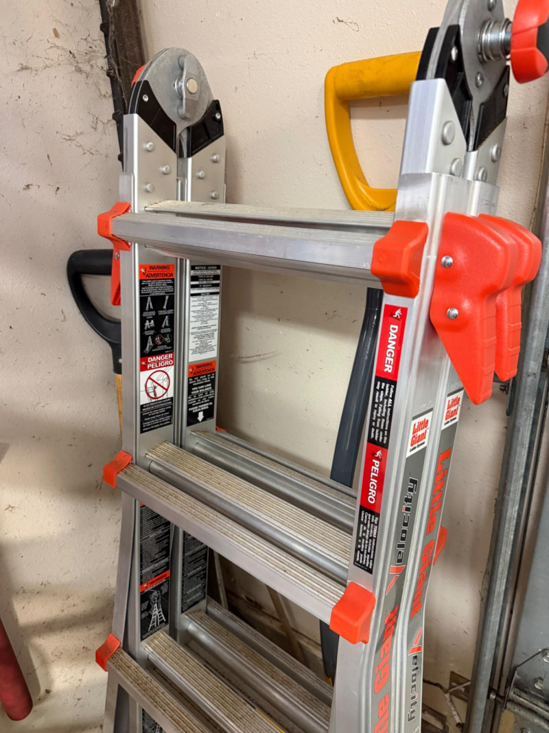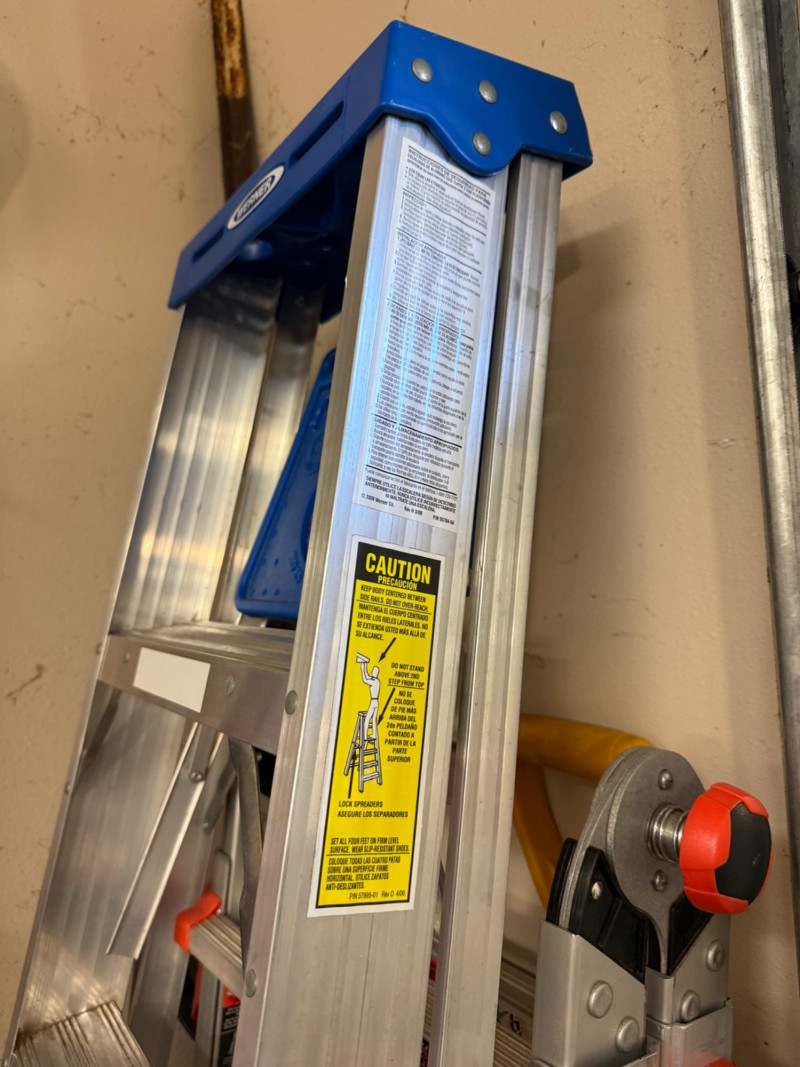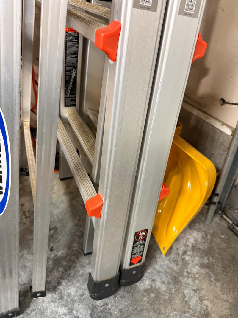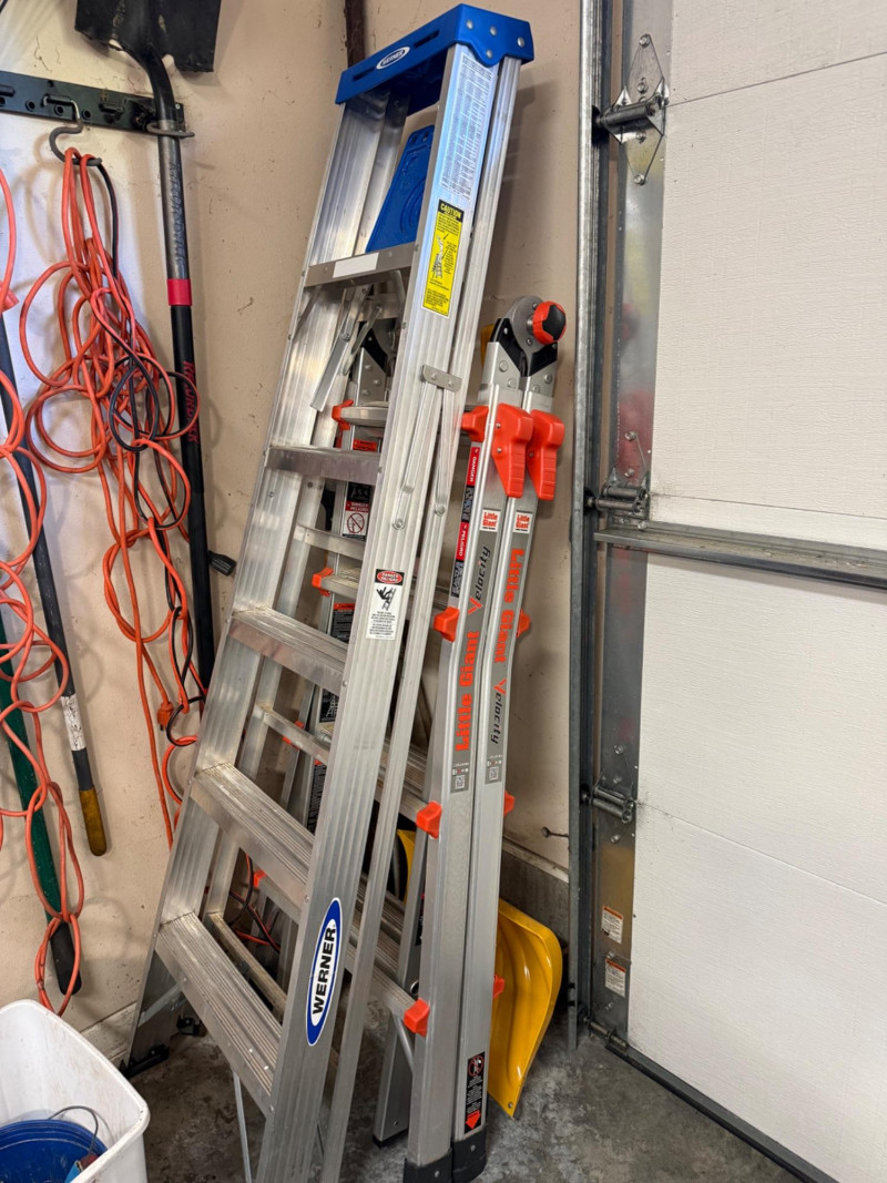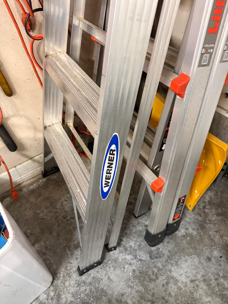 Standard aluminum step ladder Blue top cap with built‑in tool slots Lightweight, durable construction Common household/contractor brand Good for indoor and outdoor tasks Visible safety labels and clean condition Adjustable multi‑use ladder with locking hinges Orange locking mechanisms and stabilizers Can function as an A‑frame, extension, or scaffold support Heavy‑duty aluminum build Popular for versatility and professional use Appears well‑kept with normal wearWerner Aluminum Ladder