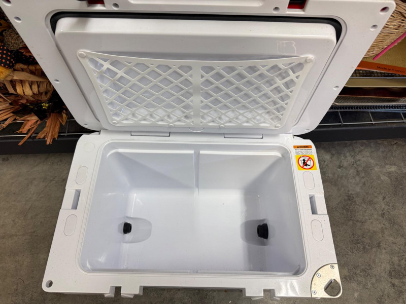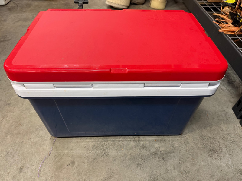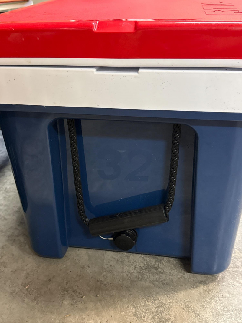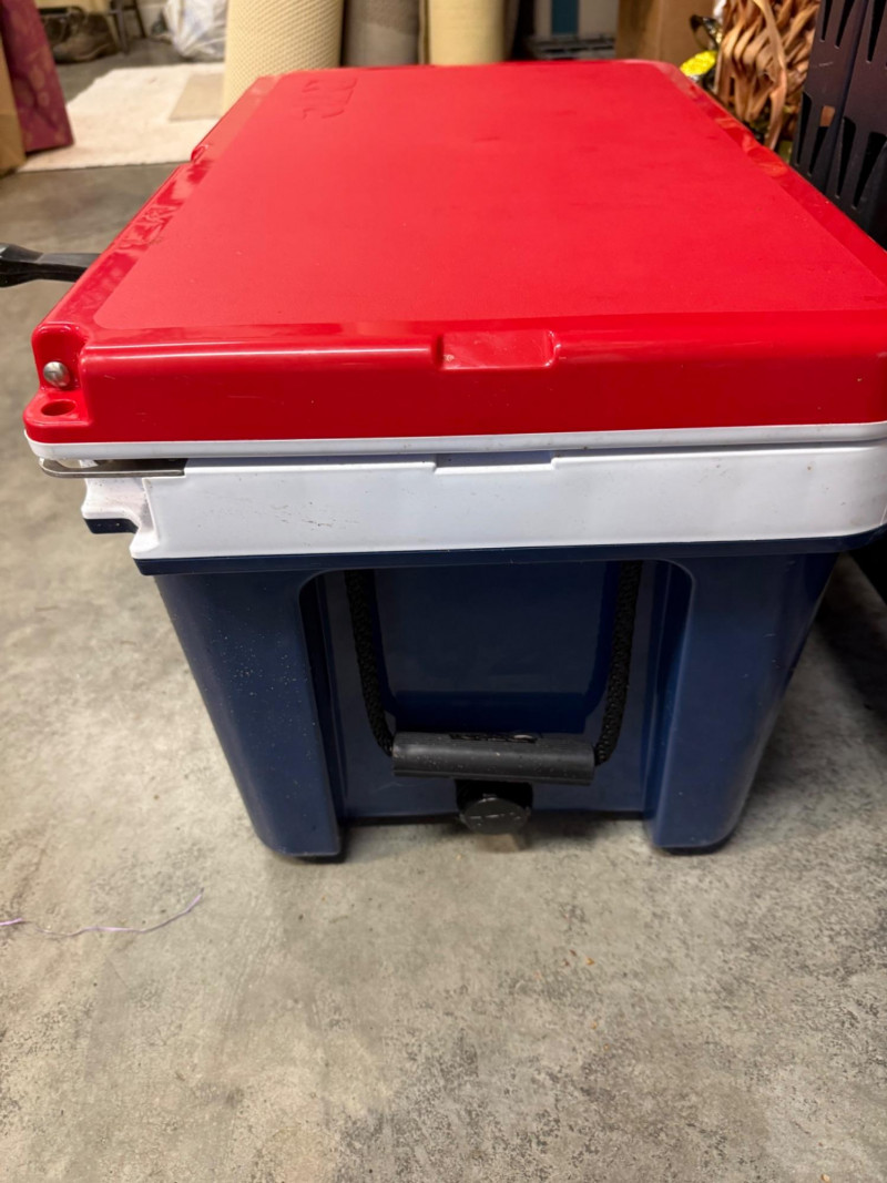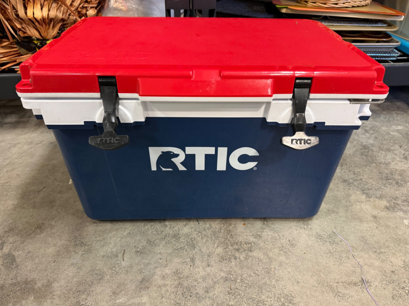 Large hard‑shell RTIC cooler Dark blue body with red lid and white trim Two heavy‑duty black RTIC latches on the front Molded RTIC logo on the front panel Rugged design for camping, boating, tailgating, and outdoor use Insulated for long ice retentionRTIC Hard‑Sided Cooler