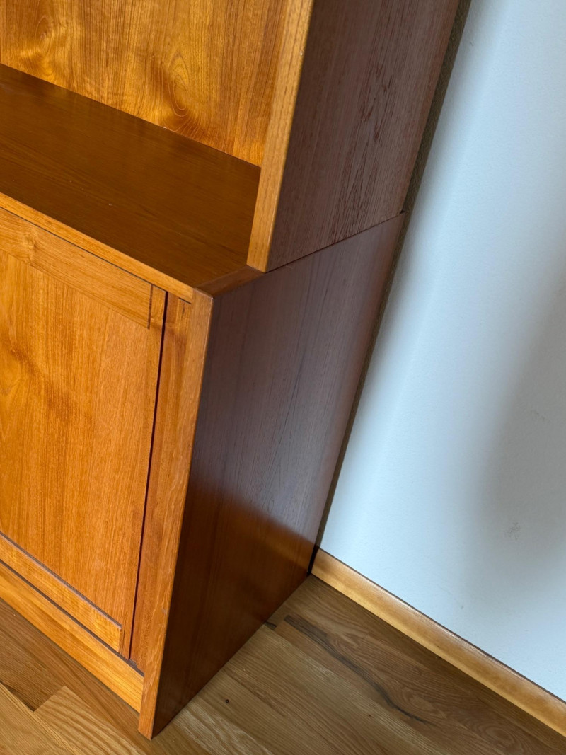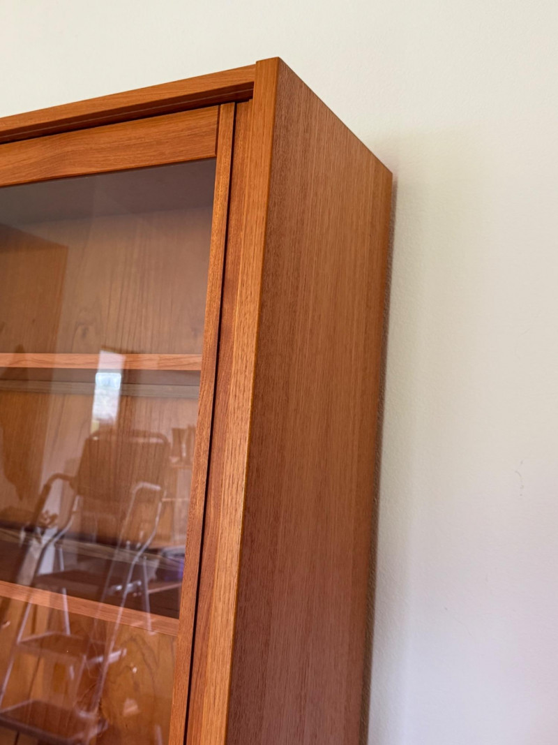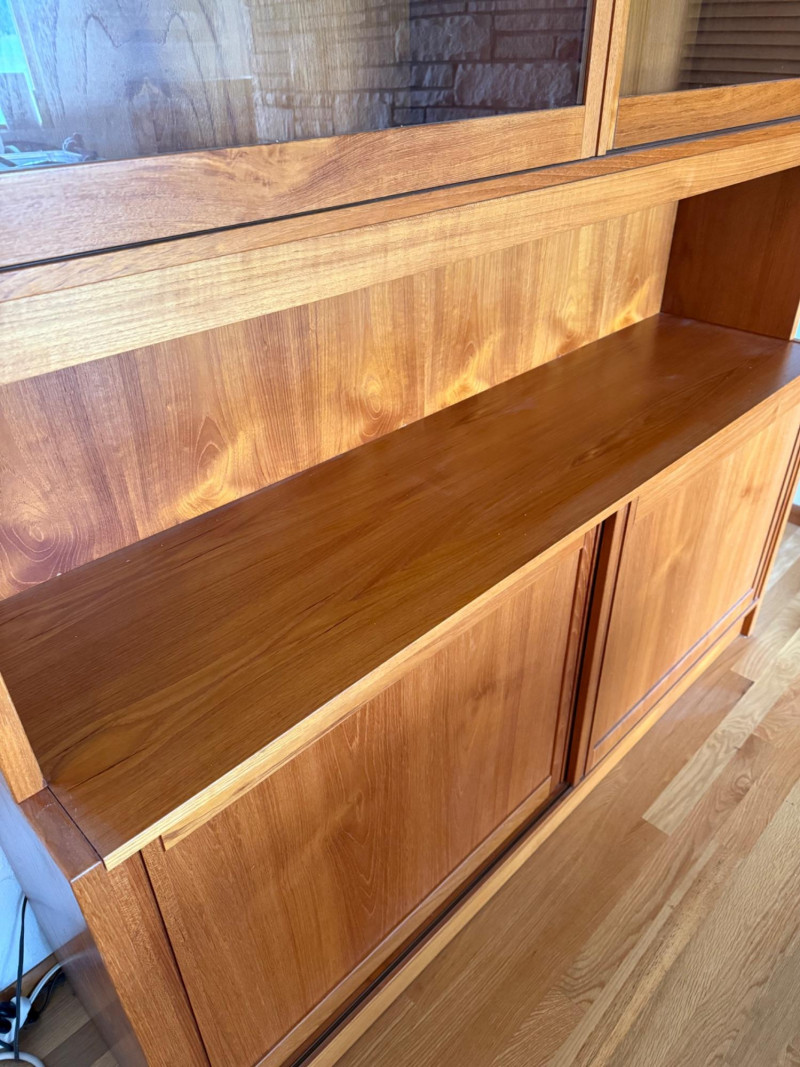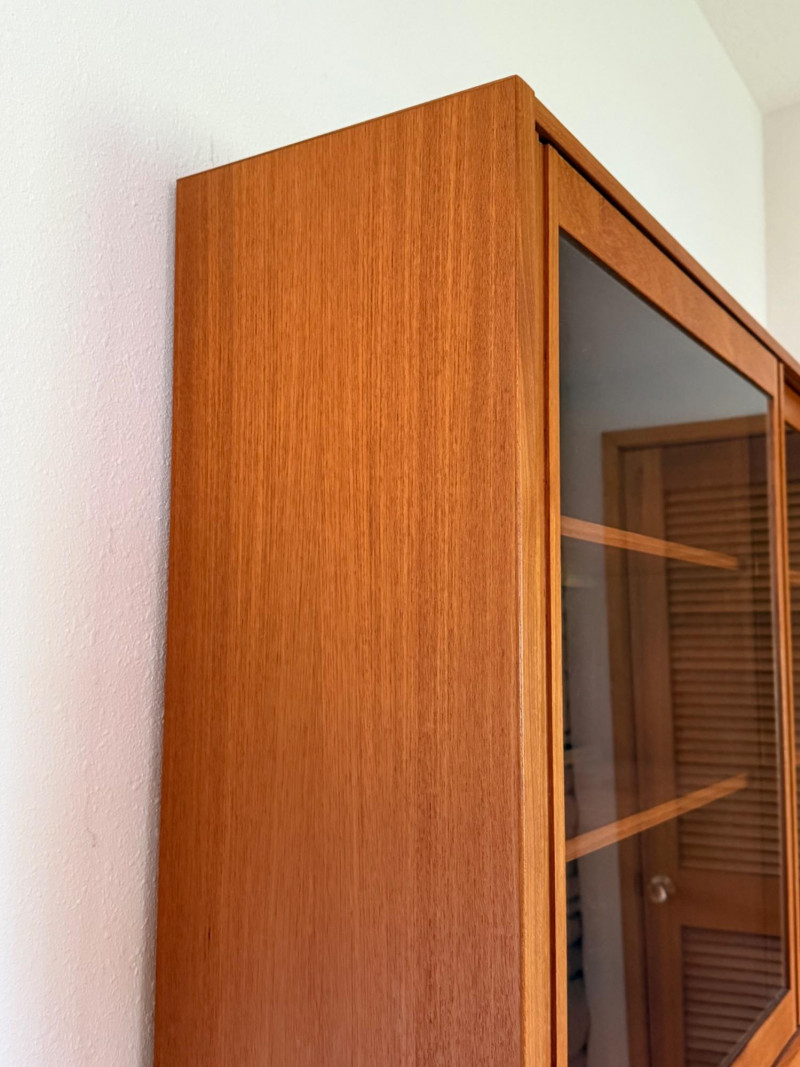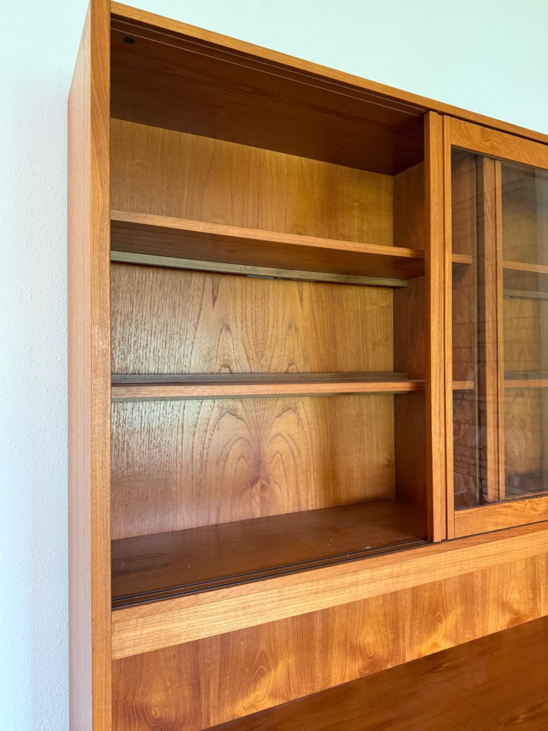 A classic Scandinavian teak hutch featuring glass sliding doors over adjustable shelving and a lower cabinet with smooth teak sliders for concealed storage. Clean lines, warm grain, and minimalist construction reflect the refined simplicity of Danish modern design. No markings or tags.