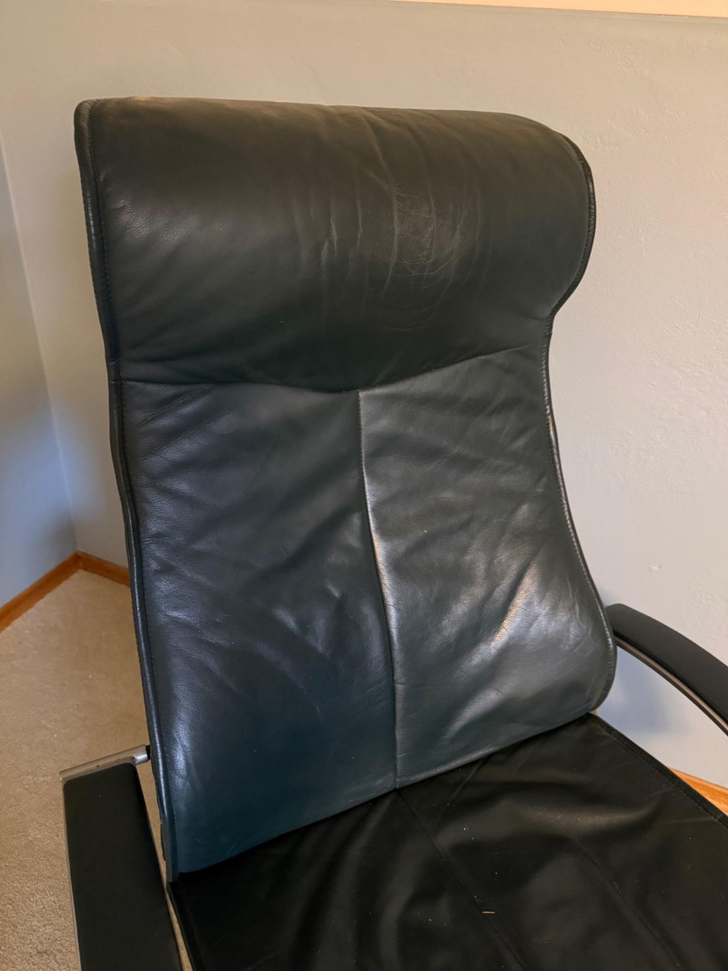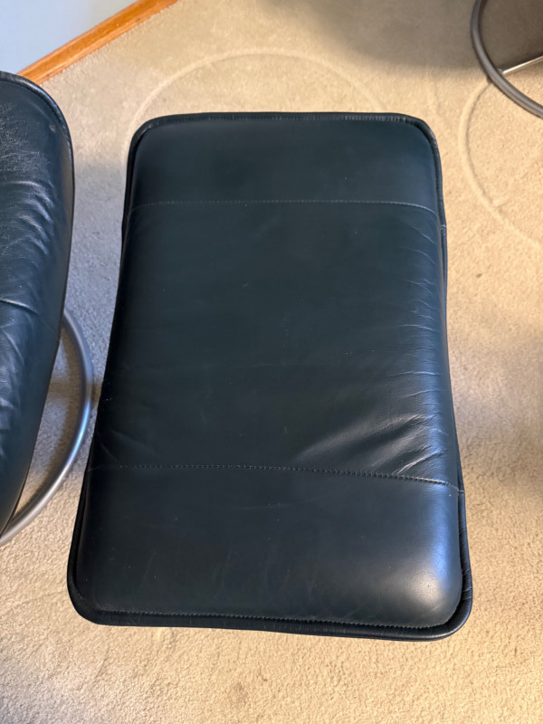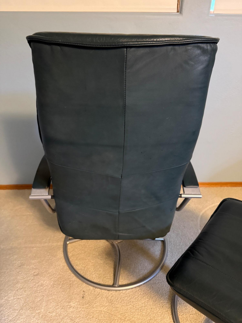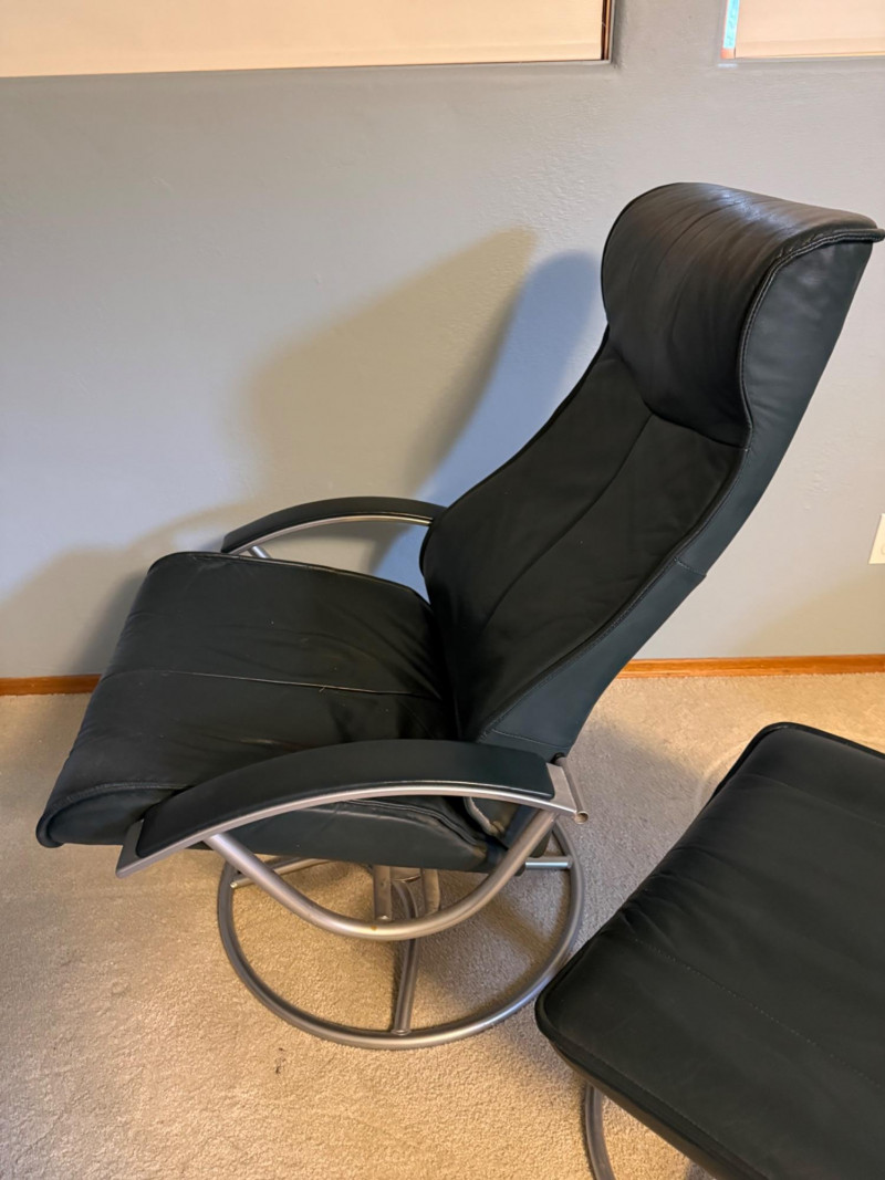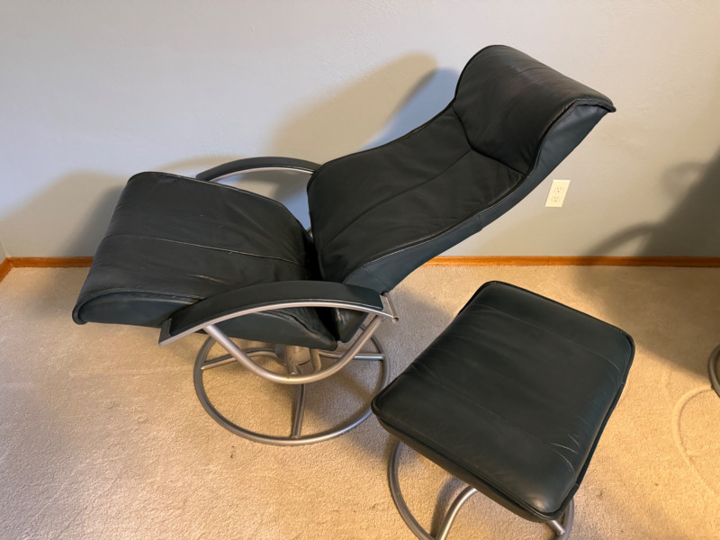 A sleek Kebe Scandinavian recliner and matching ottoman, upholstered in rich forest‑green leather with the brand’s signature balance of comfort and modern minimalism. The chair features a high, gently contoured back, smooth ergonomic lines, and sculptural metal arms that flow into a circular swivel base. The matching ottoman mirrors the same clean silhouette, offering supportive leg comfort and a cohesive modern profile. Seat height is 17 inches.