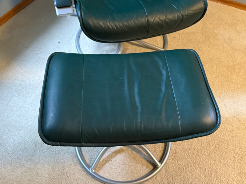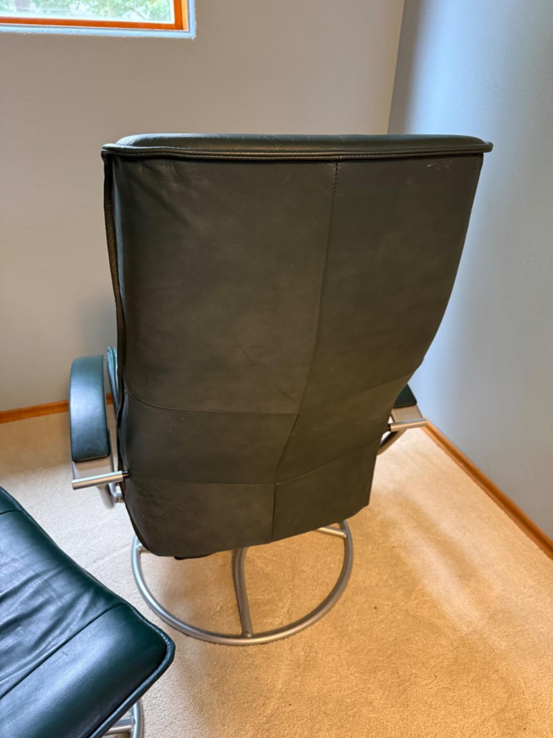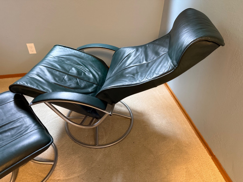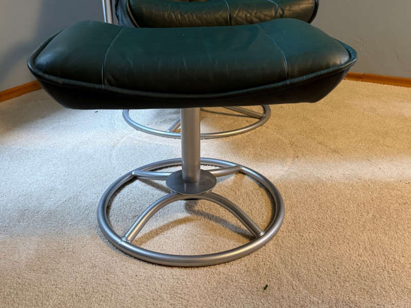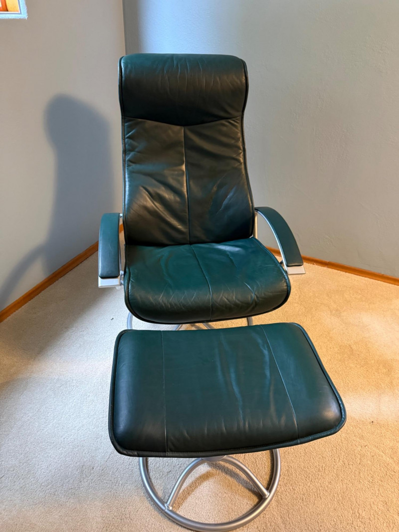 Forest green color. Seat height is 17 inches high. Kebe recliners are built around three signature traits: 1. Cold‑Cure Molded Foam. A single‑pour foam shell that keeps its shape for 20+ years. No sagging or compression like traditional cushion foam 2. Scandinavian Ergonomics. Glide‑path reclining (smooth, body‑responsive) High backs with neck support. Matching ottoman designed to keep legs at a neutral angle 3. Premium Leather Options. Full‑grain or top‑grain leather. Typically available in black, brown, grey, cognac, or bordeaux
