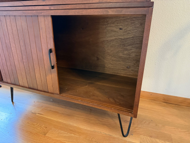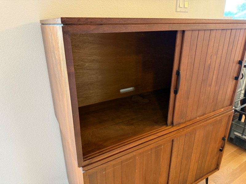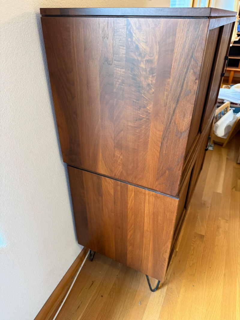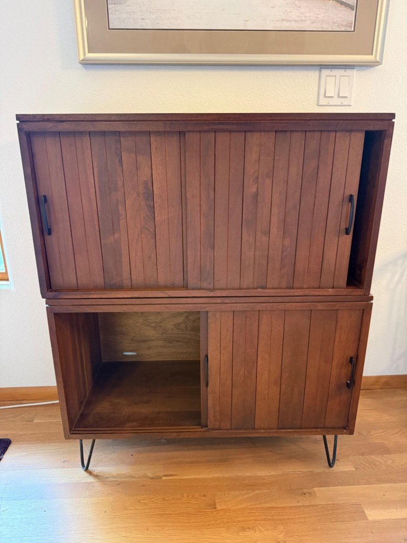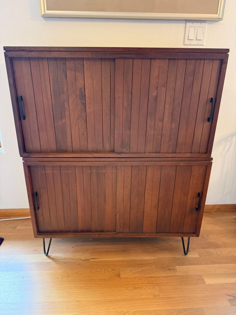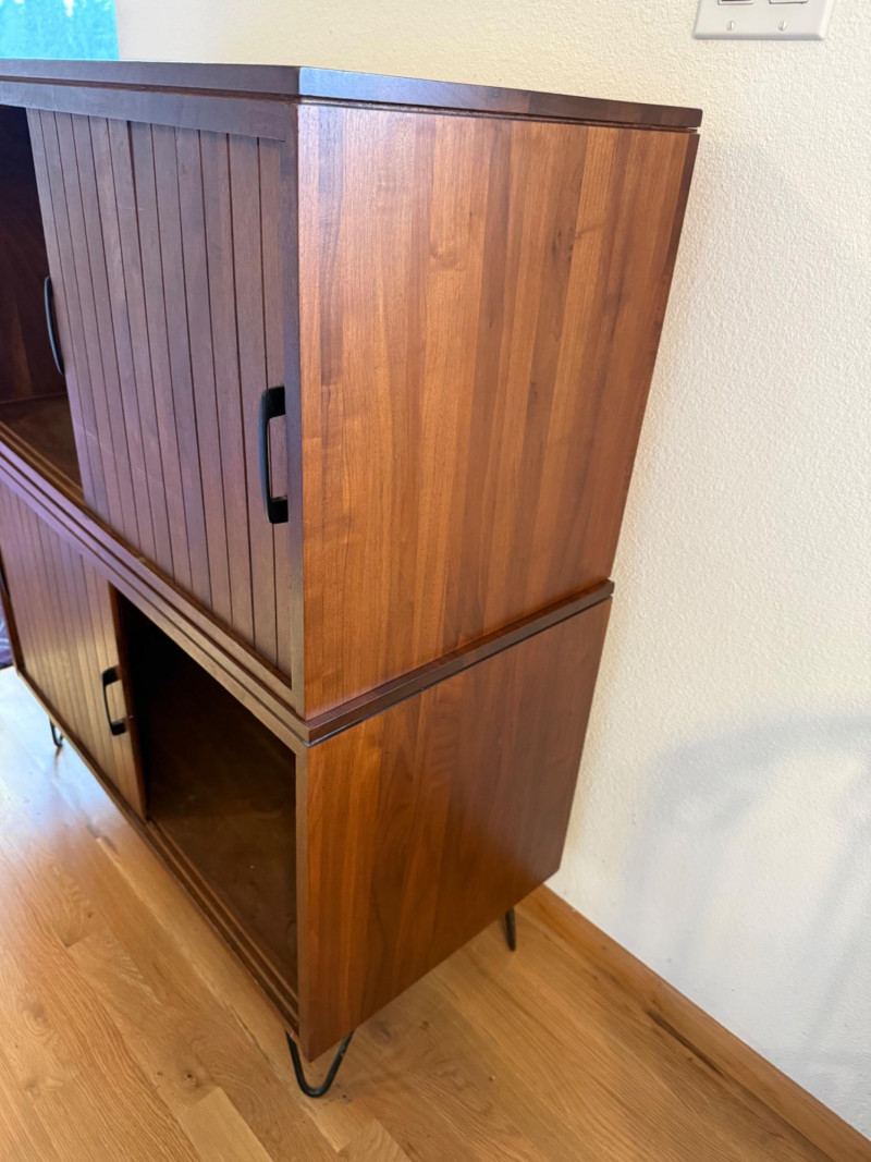 Two separate pieces stacked on each other. Slatted doors give it a textural, architectural look. Metal legs lighten the visual weight. Sliding doors make it practical in tight spaces. Works beautifully with teak, walnut, and Scandinavian décor. Could pair nicely with your mineral displays or art glass pieces.