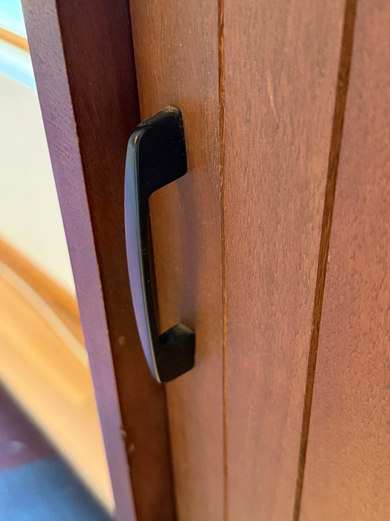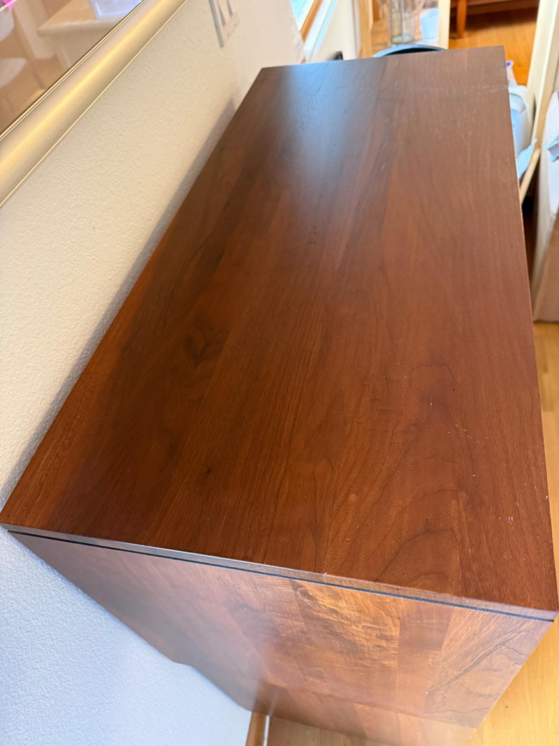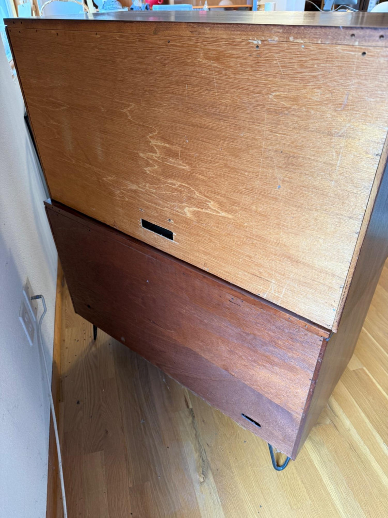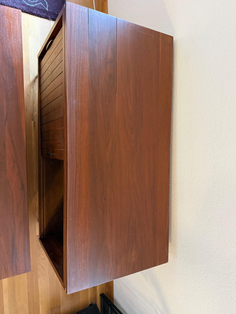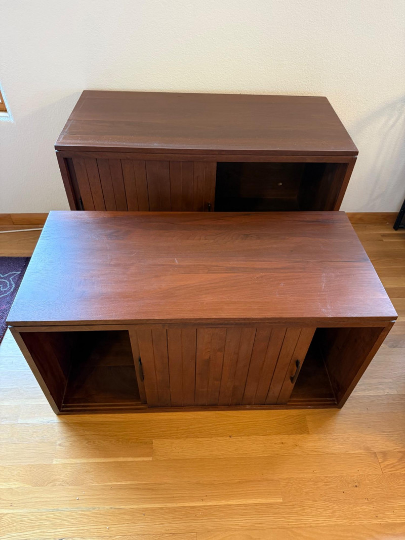 Two separate pieces stacked on each other. Slatted doors give it a textural, architectural look. Metal legs lighten the visual weight. Sliding doors make it practical in tight spaces. Works beautifully with teak, walnut, and Scandinavian décor. Could pair nicely with your mineral displays or art glass pieces.