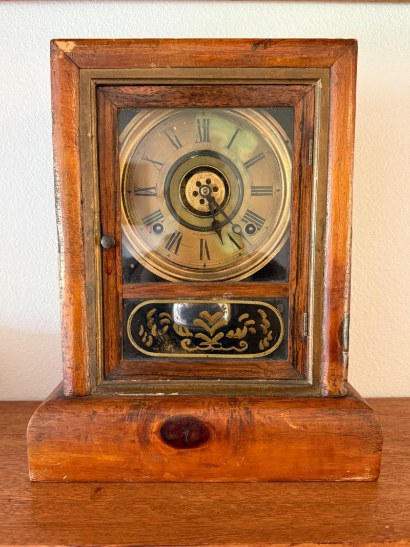 This is a late‑19th to early‑20th‑century mantel clock, often called a parlor clock. It has a rectangular wooden case, a round dial with Roman numerals, and a glass lower panel decorated with a gold stenciled design. These clocks were made by many American makers (Seth Thomas, Ingraham, Ansonia, Waterbury, etc.) and were very popular household timepieces.