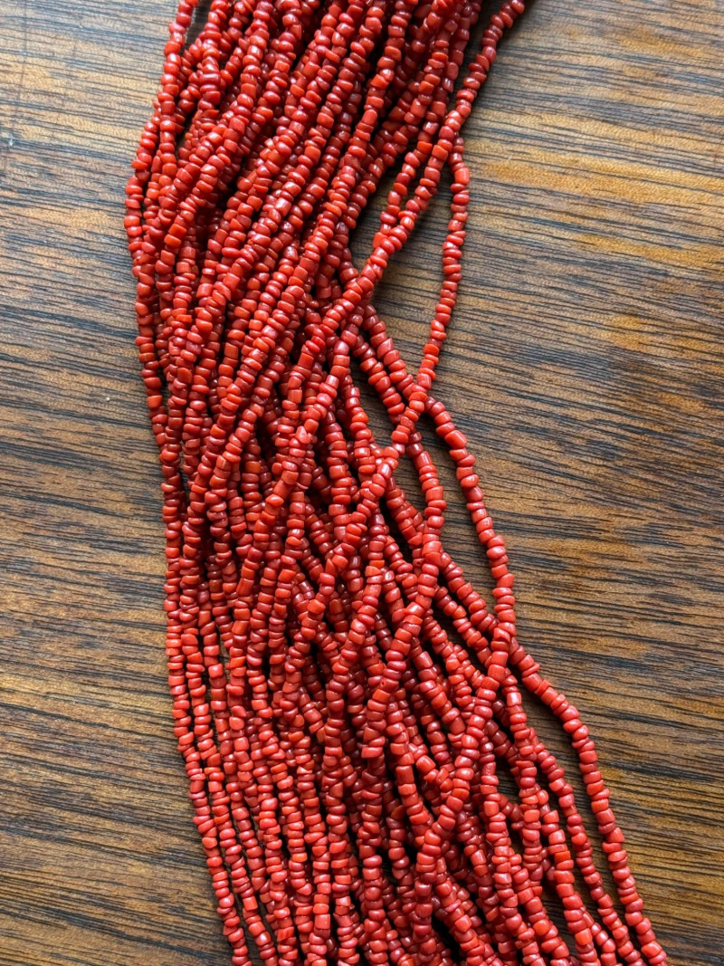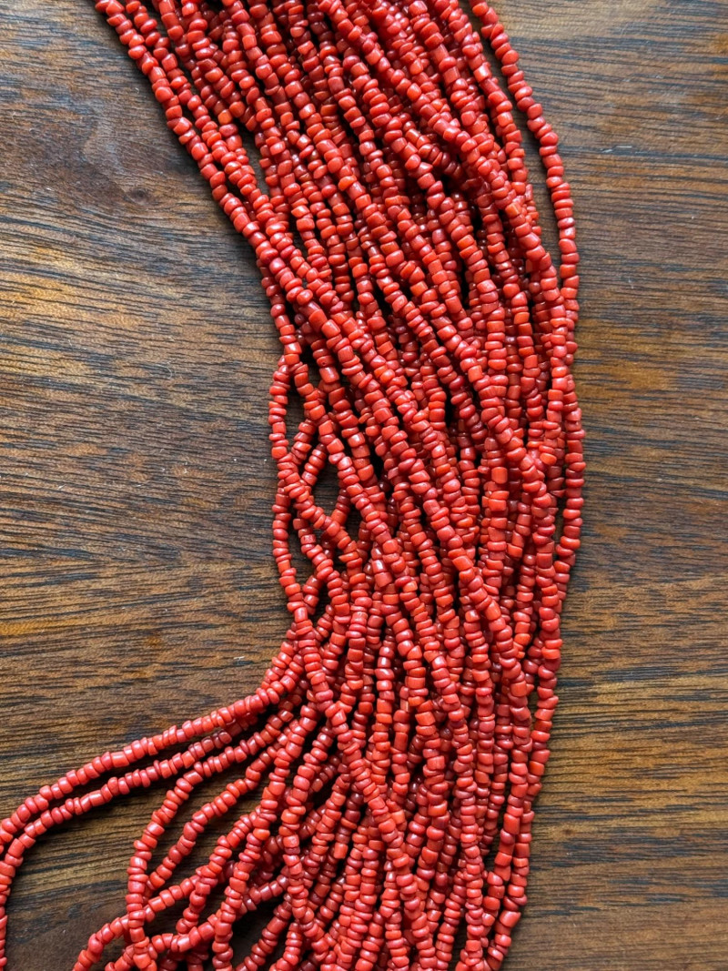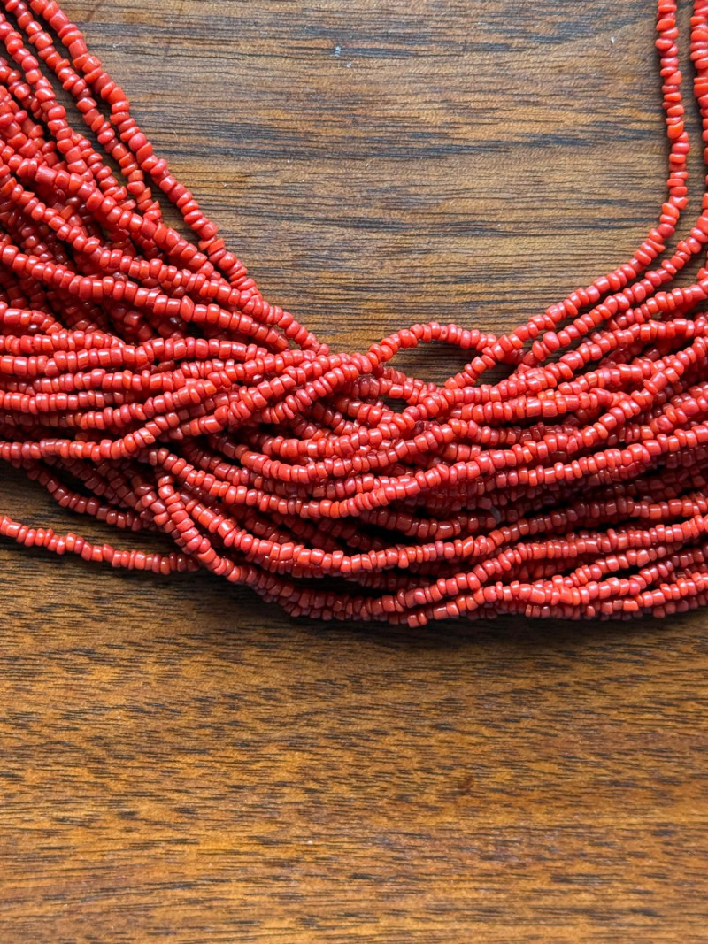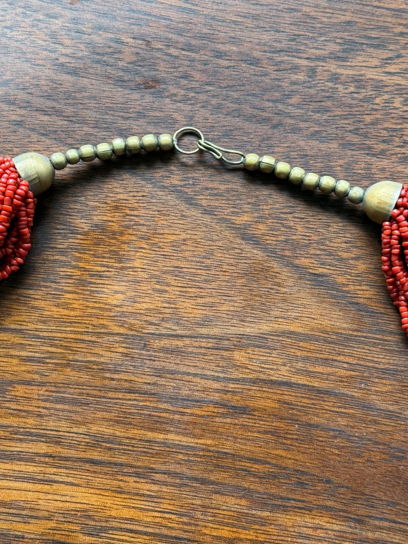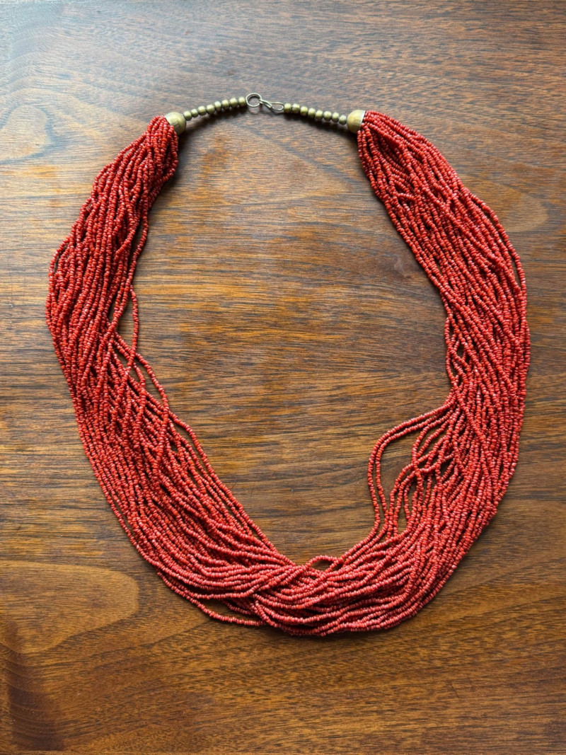 This is a traditional Tibetan multi‑strand coral necklace, made from many small red beads gathered into metal end caps. These necklaces are worn for protection, good fortune, and status in Himalayan cultures.