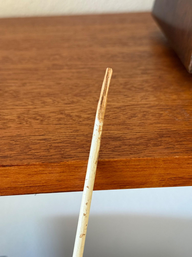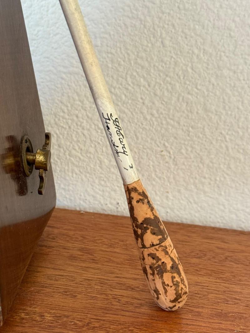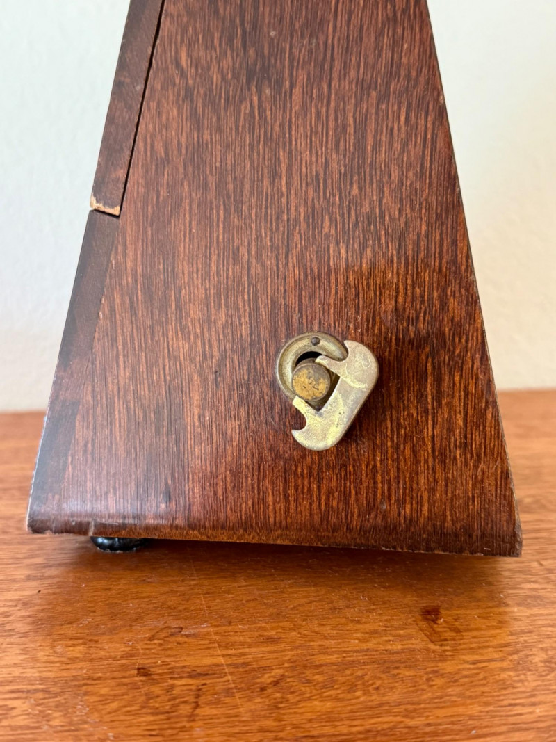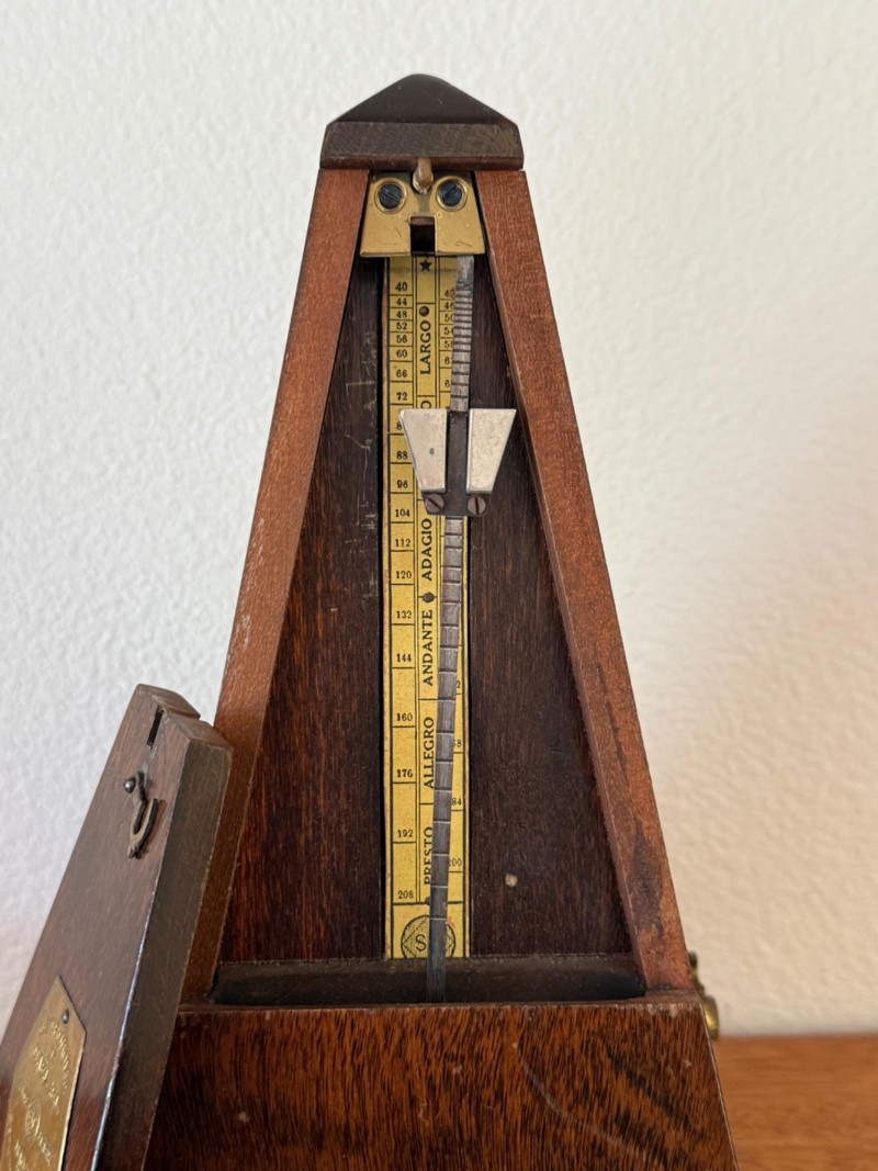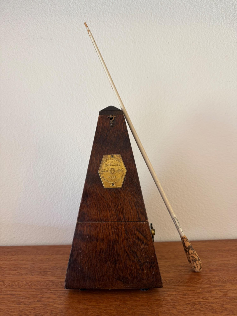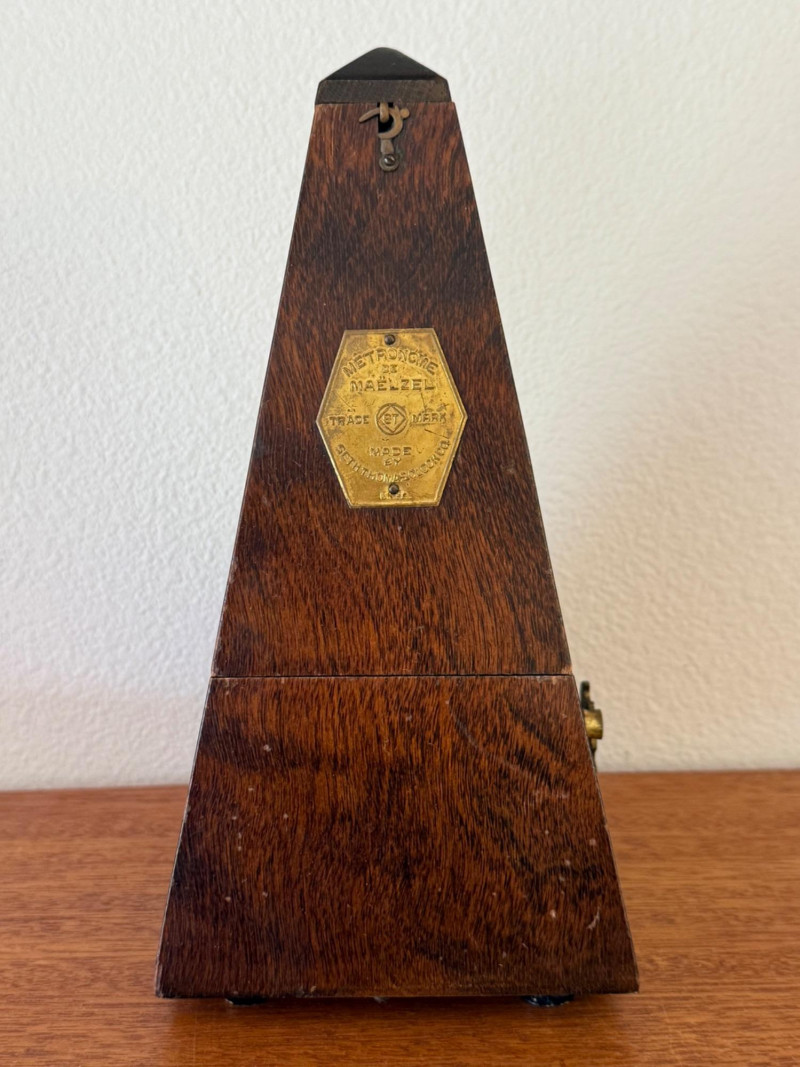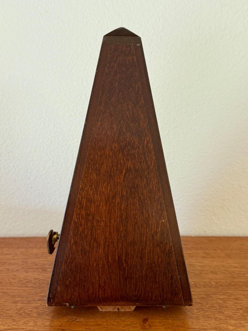 Wand is 14.25” long. Metronome is 9” tall. This is a classic mechanical pyramid metronome, the type musicians used for over a century to keep steady tempo. It works by winding a spring and adjusting the sliding weight on the metal pendulum.The label on it (“Metronome de Maelzel”) refers to Johann Maelzel, the inventor who popularized this design in the early 1800s. Many companies later produced metronomes using his name as a style reference.