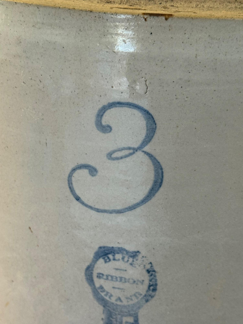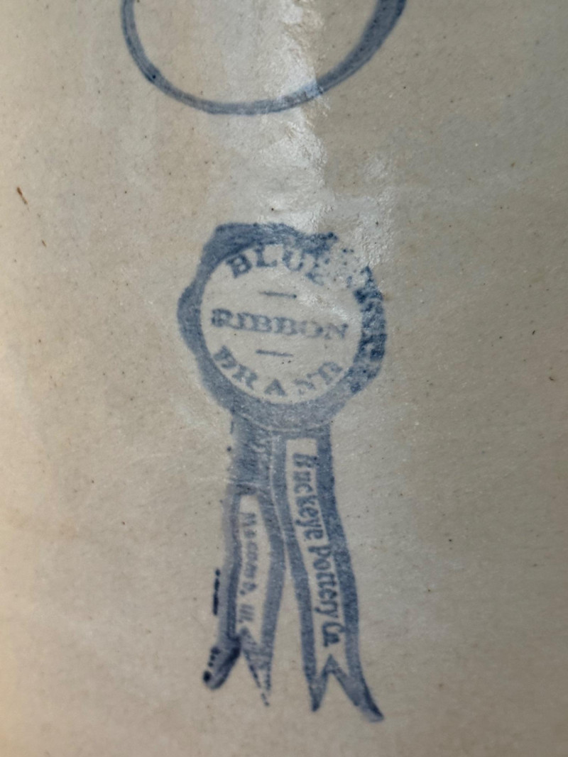 The Buckeye Pottery Blue Ribbon 3‑Gallon Jug is an early‑1900s stoneware storage jug made in Macomb, Illinois. It’s known for its cobalt‑blue “Blue Ribbon” stamp, thick salt‑glazed stoneware body, and classic utilitarian shape.