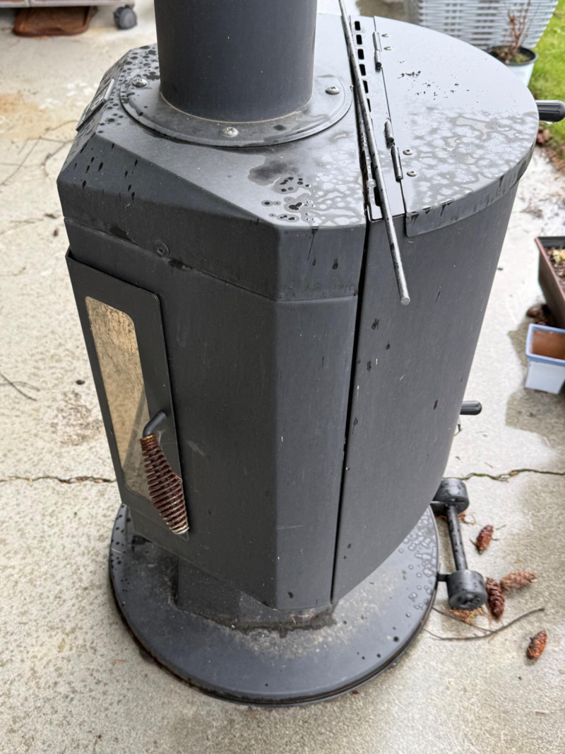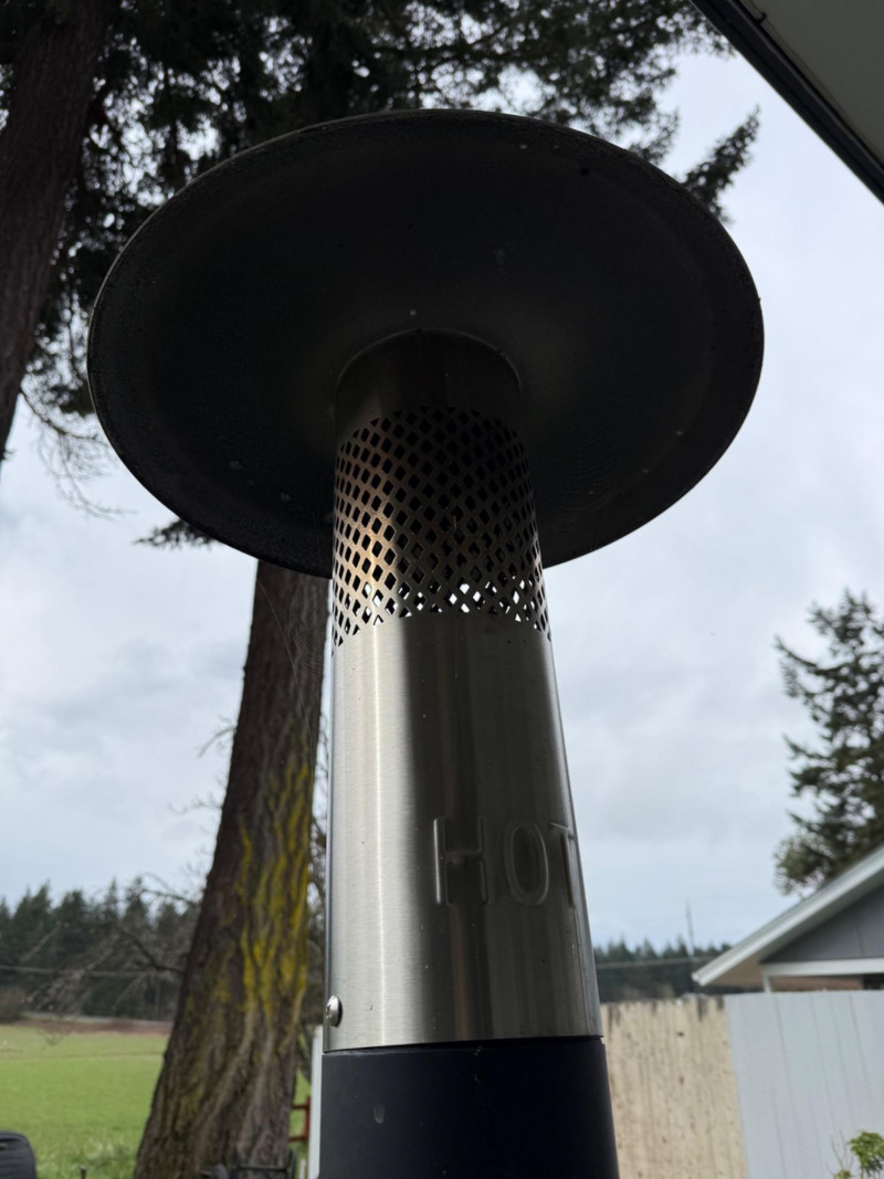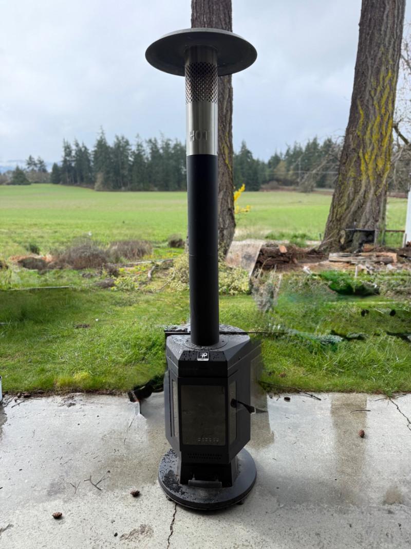 Untested. A Flame Pro pellet patio heater is an outdoor heater that burns wood pellets instead of propane. It produces a tall, visible flame inside a metal tube, giving both heat and ambiance. These are popular in Washington because pellets are inexpensive and burn clean.