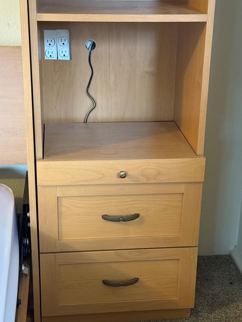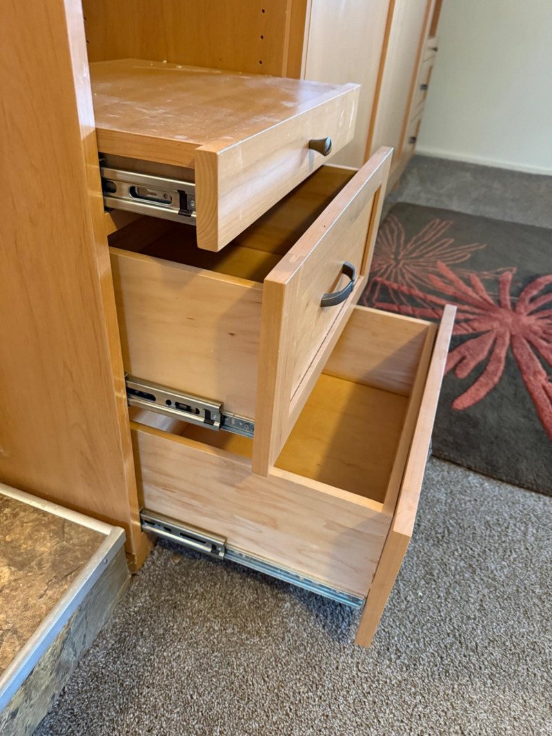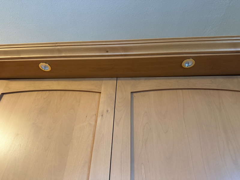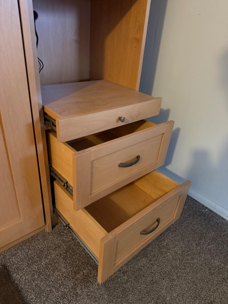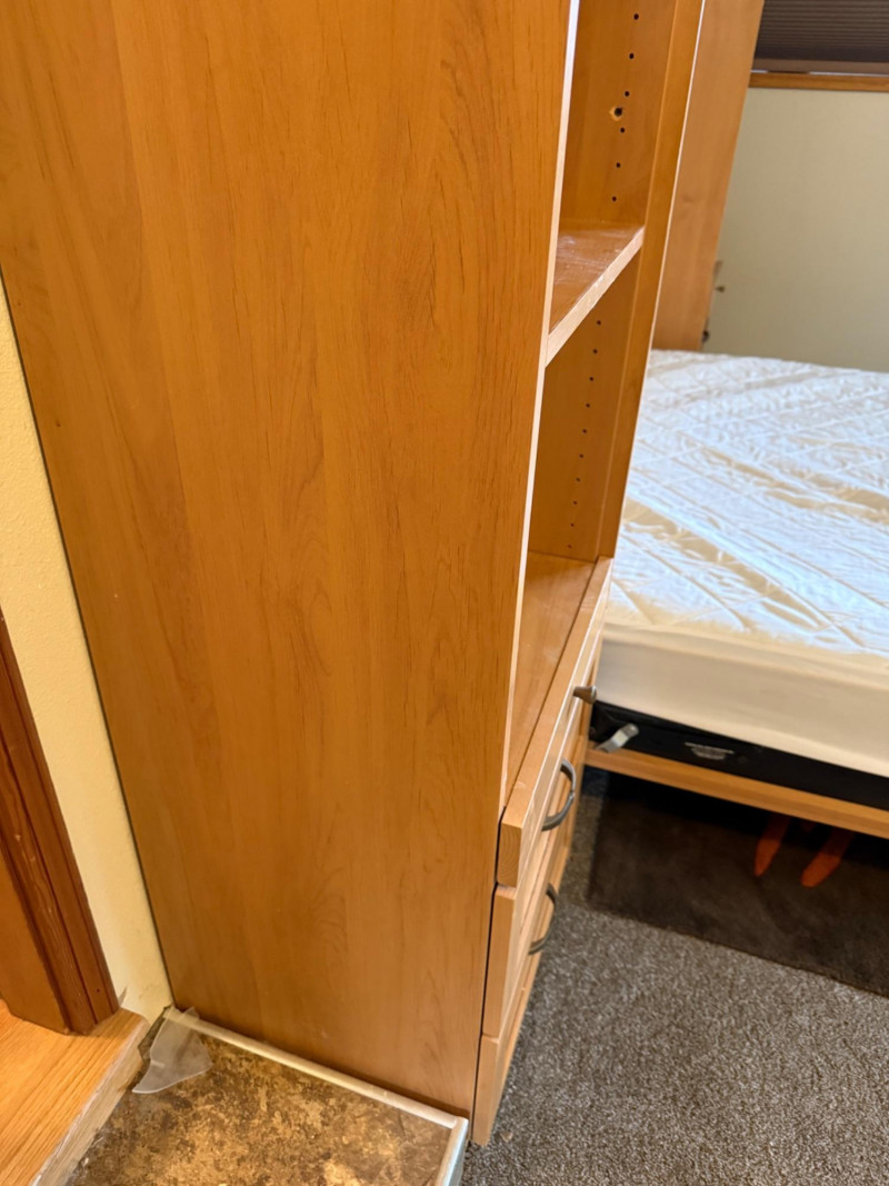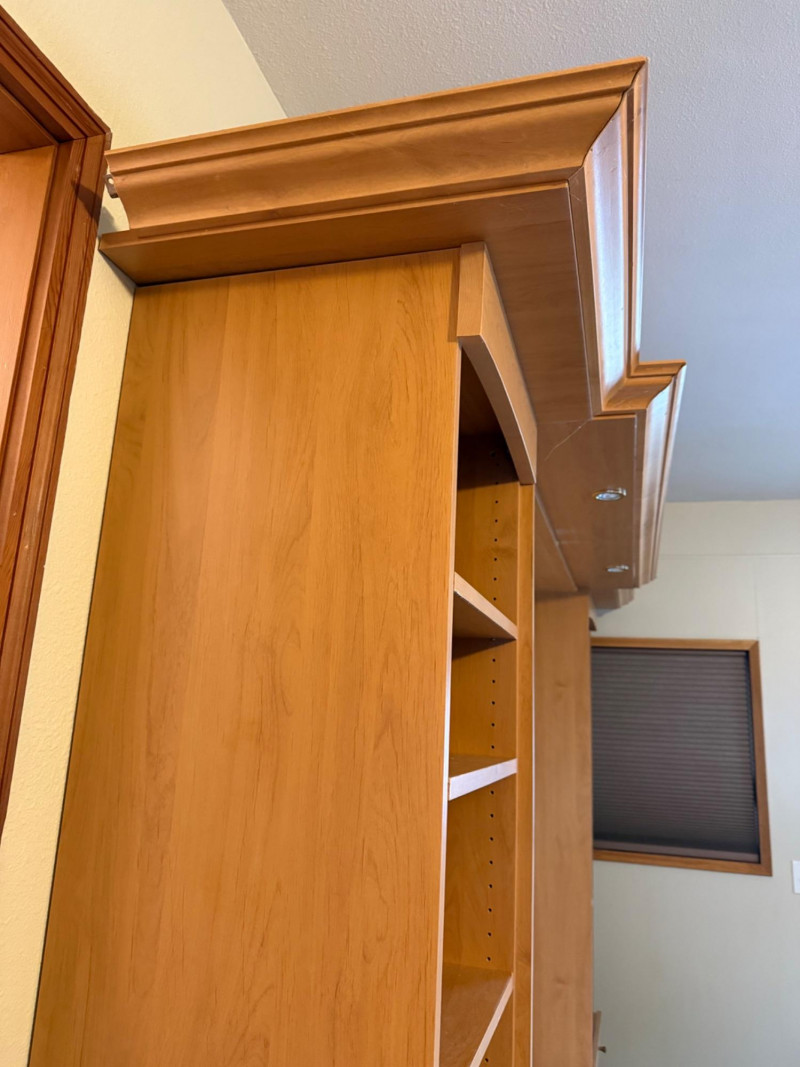 A substantial queen‑size Murphy bed housed in a beautifully built light‑wood cabinet with integrated storage towers. The central unit features two tall, arched‑panel doors that conceal the fold‑down bed, supported by hydraulic lift arms for smooth, easy operation. The surrounding towers offer generous open shelving and two lower drawers on each side—ideal for books, décor, or bedroom essentials. The piece is topped with elegant crown molding and built‑in overhead lighting, giving it a finished, custom‑cabinetry presence. When closed, it reads as a full wall unit; when open, it converts the room into a functional guest space without sacrificing floor area.
