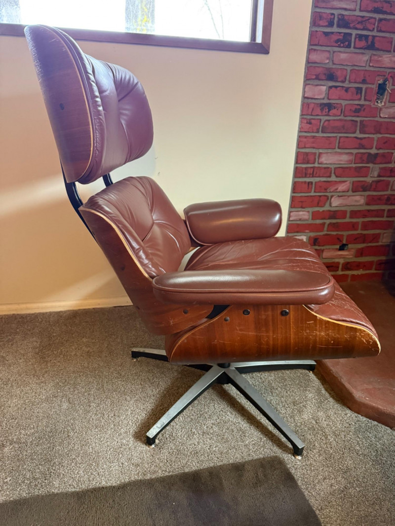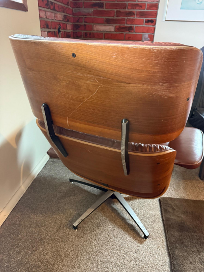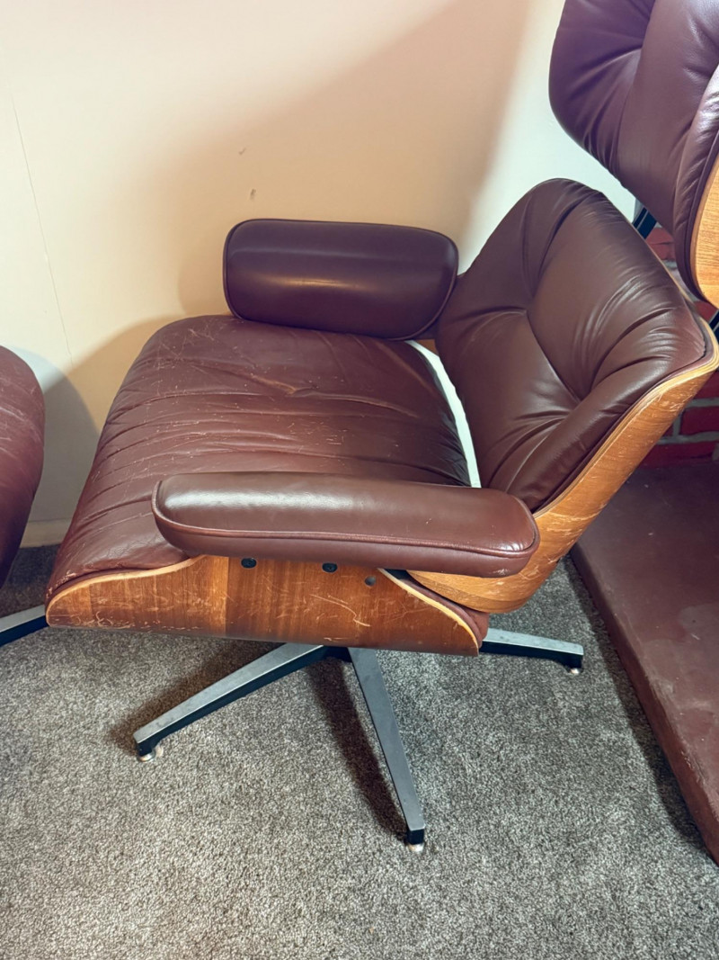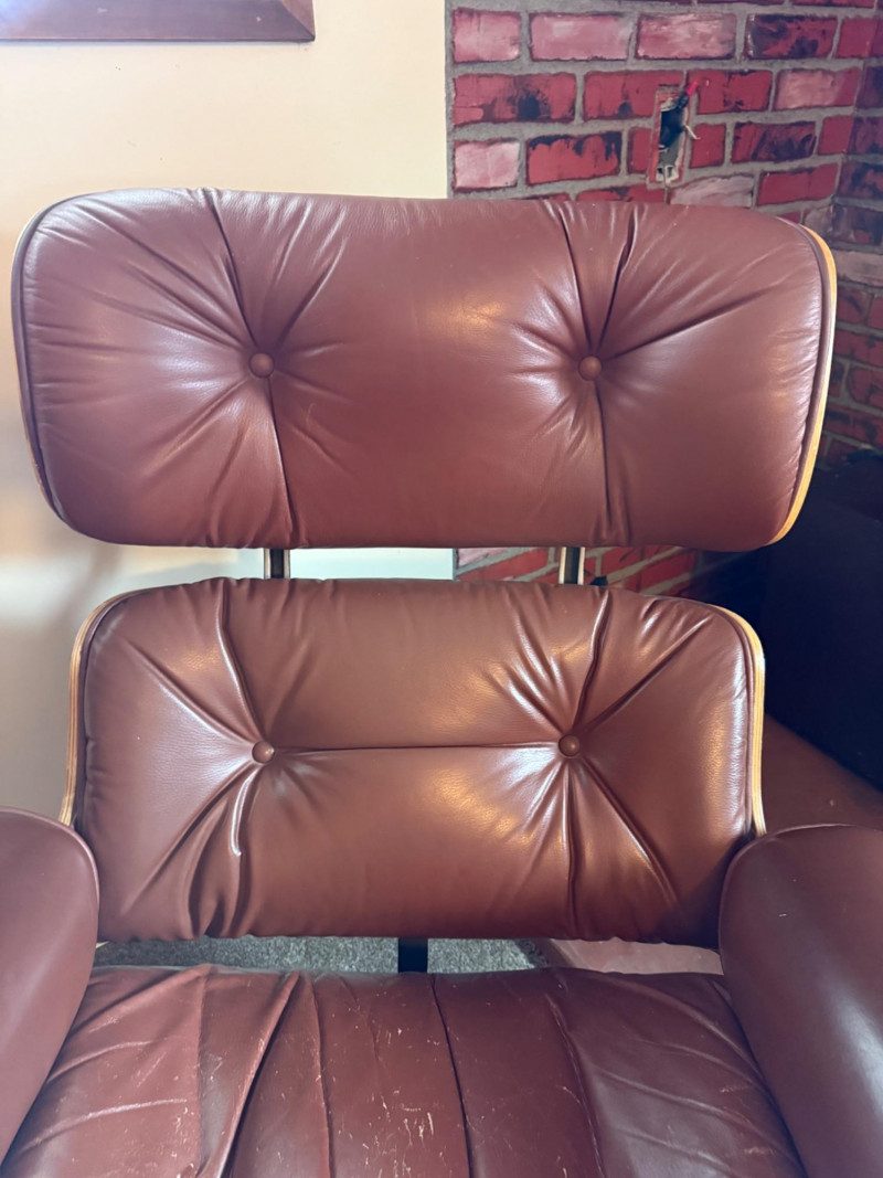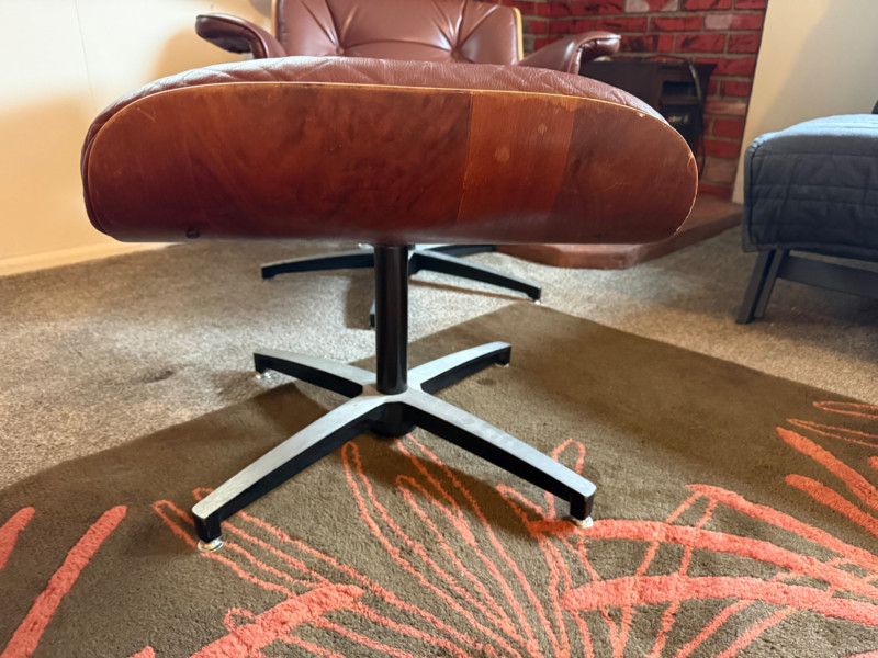 This is a mid‑century modern style lounge chair with matching ottoman, inspired by the iconic Eames Lounge Chair (1956). This is a reproduction, not an original Herman Miller piece, but it still carries the classic look: molded wood shell, tufted cushions, and a low, relaxed seating angle.