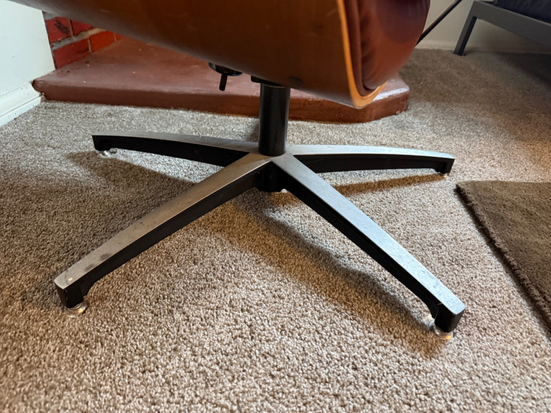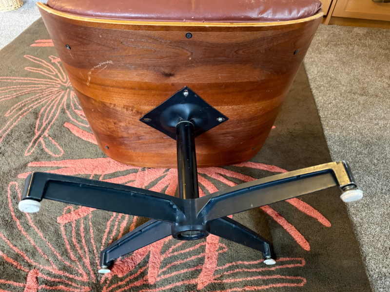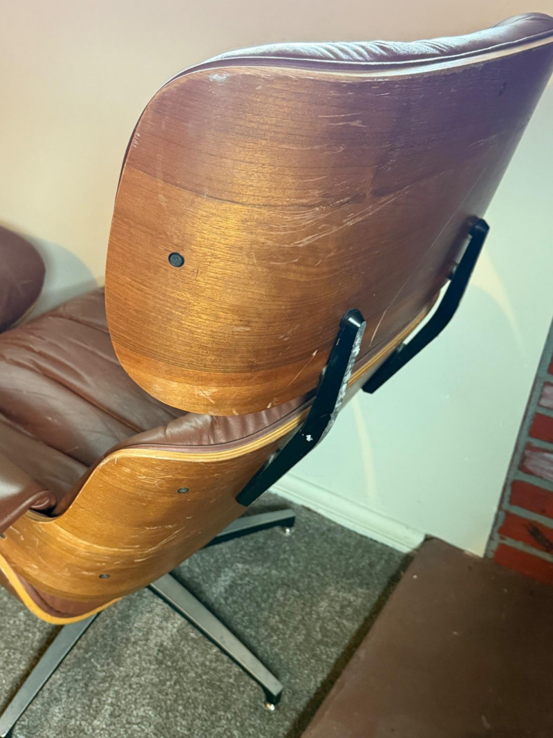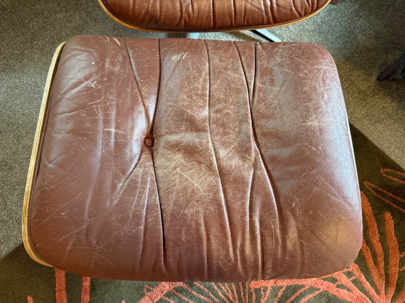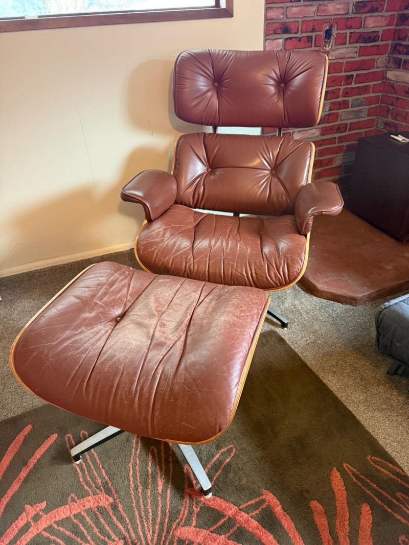 This is a mid‑century modern style lounge chair with matching ottoman, inspired by the iconic Eames Lounge Chair (1956). This is a reproduction, not an original Herman Miller piece, but it still carries the classic look: molded wood shell, tufted cushions, and a low, relaxed seating angle.