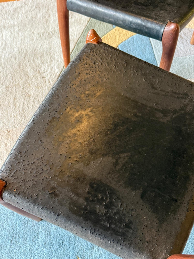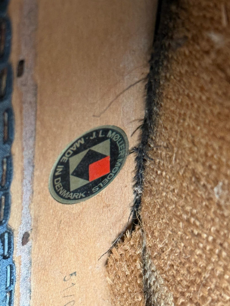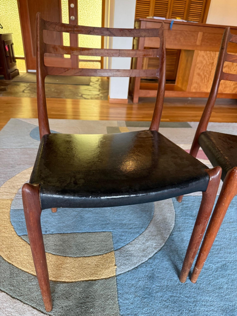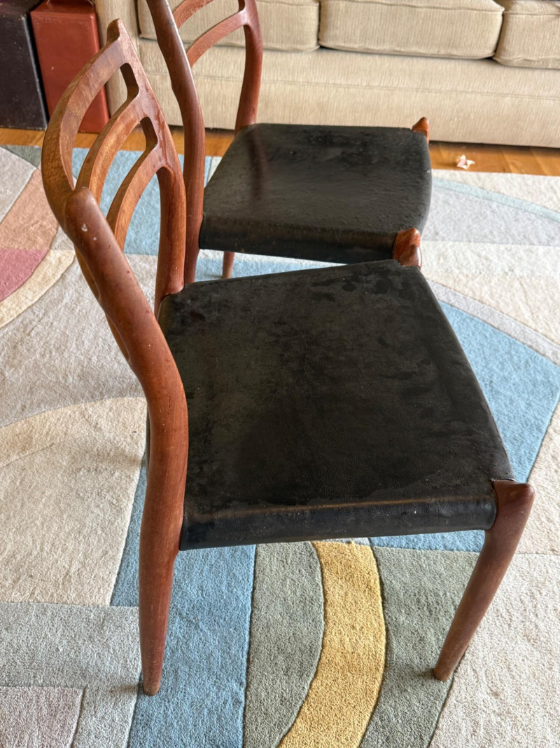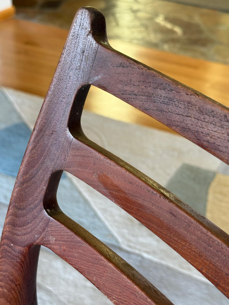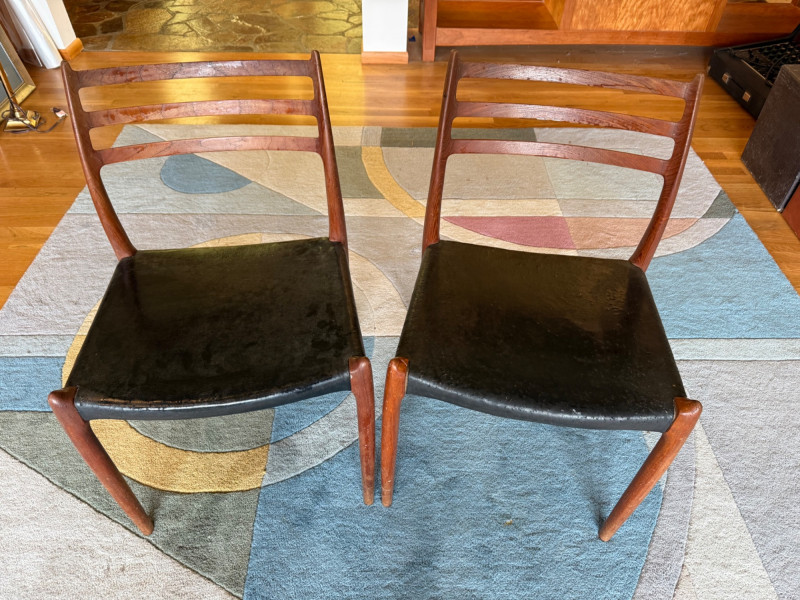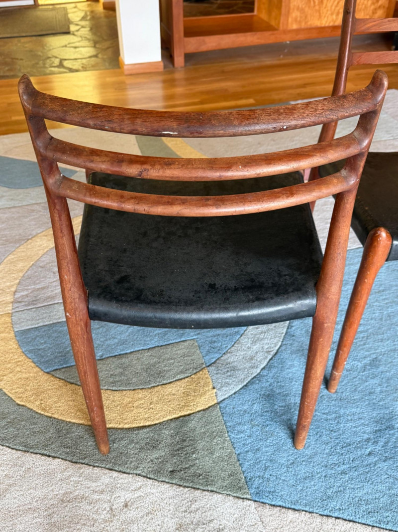 A pair of iconic J.L. Møller Danish modern dining chairs, celebrated for their refined craftsmanship and sculptural teak frames. These examples feature the classic three‑slat curved backrest, a hallmark of Møller’s elegant, ergonomic design language. The frames show the brand’s signature hand‑finished joinery and graceful, tapered legs that give the chairs their light, floating presence. PLEASE NOTE- Good bones but needs recovering. J.L. Møller chairs are some of the most collectible Danish mid‑century dining chairs, known for hand‑crafted joinery, teak/rosewood frames, and woven papercord seats.