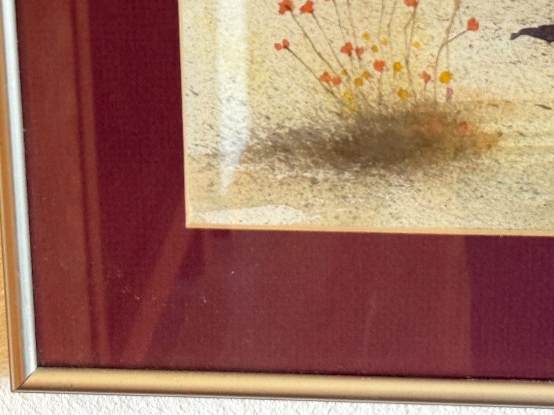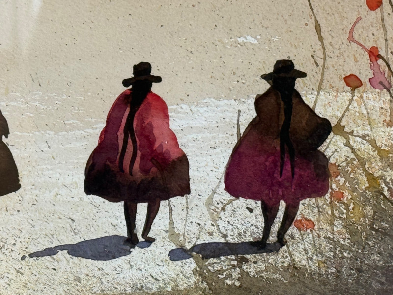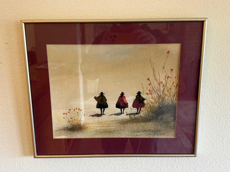 Original watercolor landscape of the Andes women signed ‘Méndez.’ Atmospheric mountain scene with soft watercolor technique. Nicely framed.”