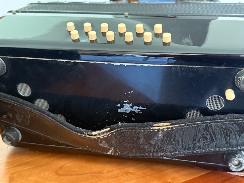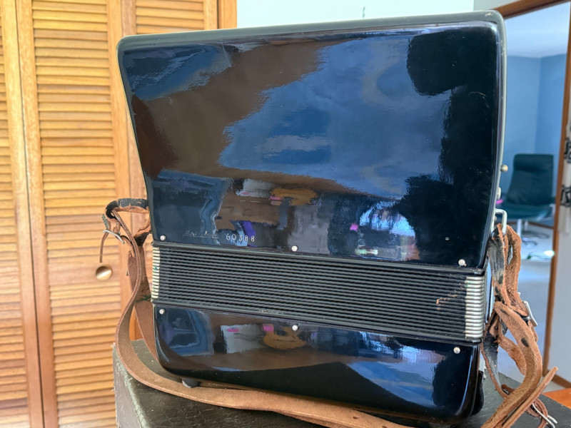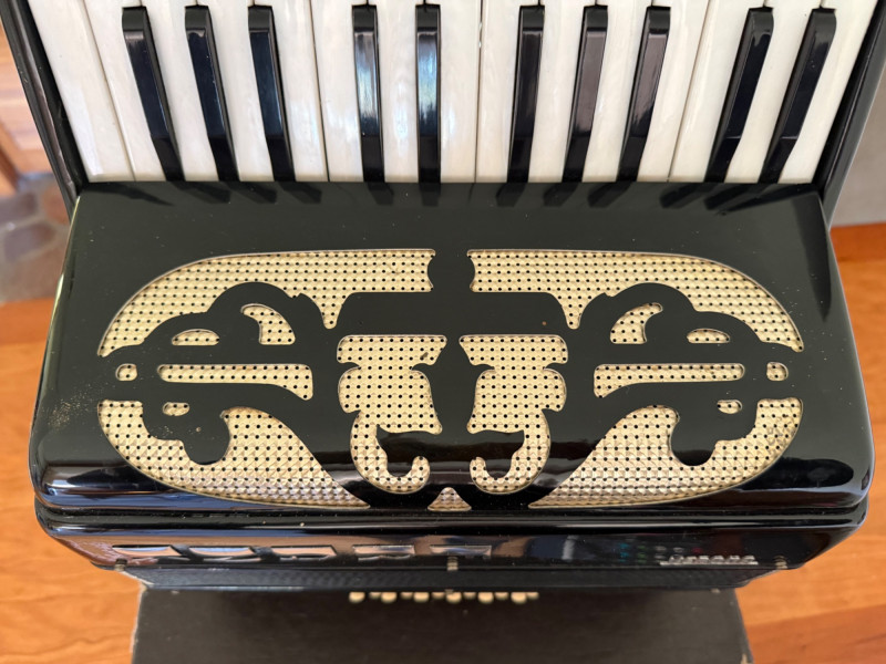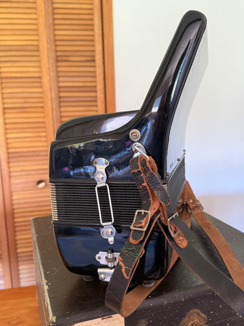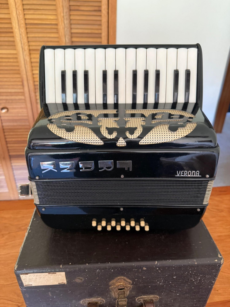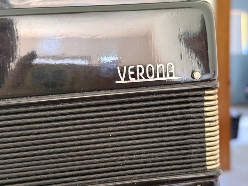 Piano‑style keyboard (usually 41 keys on full size, 25–34 on student size)120‑bass or 72‑bass button systemCelluloid‑covered body (pearl, red, black, or sparkle finishes)Italian reeds (machine‑made, mid‑grade)Multiple treble registers (3–7 switches depending on model)Serial numbers like #60388 indicate production batch, not a specific model nameA Verona accordion is usually a mid‑century Italian piano accordion, imported to the U.S. under a house brand rather than a specific maker. These instruments were built for students, hobbyists, and light performance use, and they remain collectible as decorative pieces or functional vintage accordions.