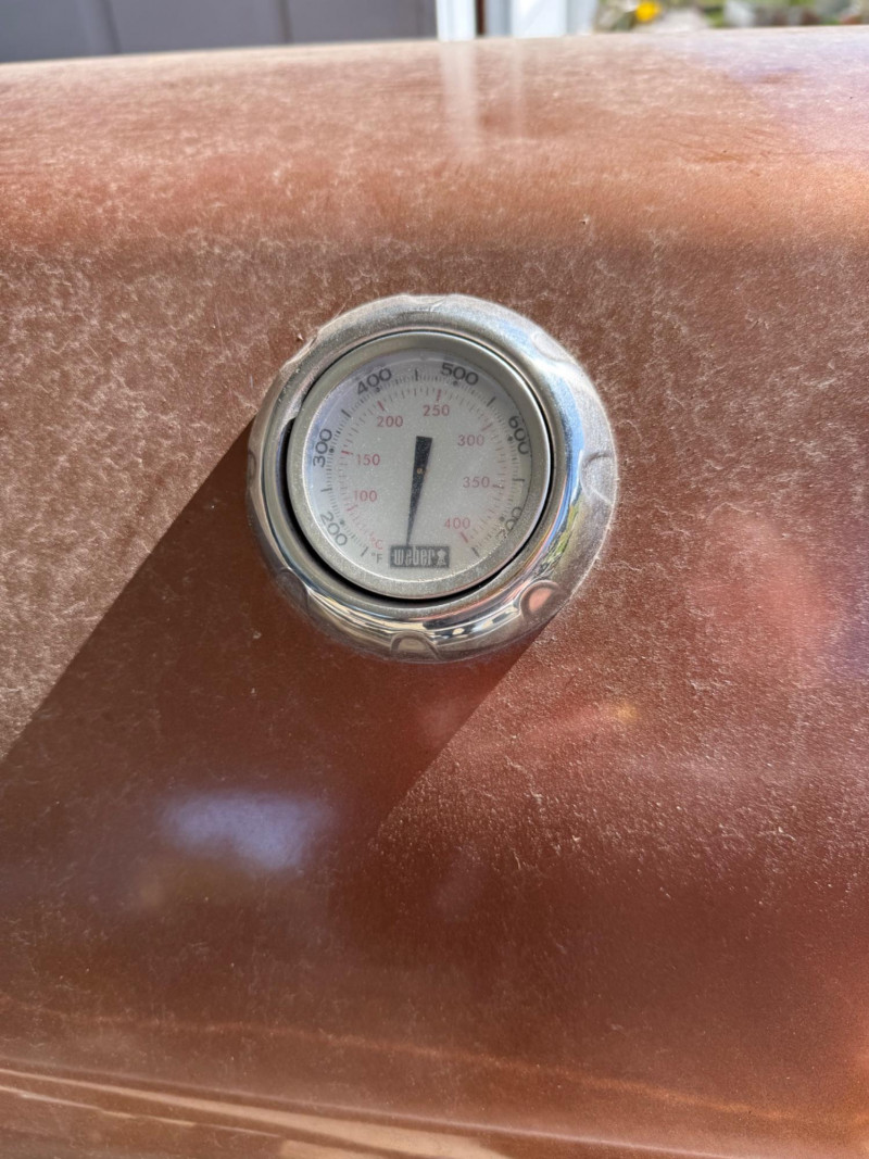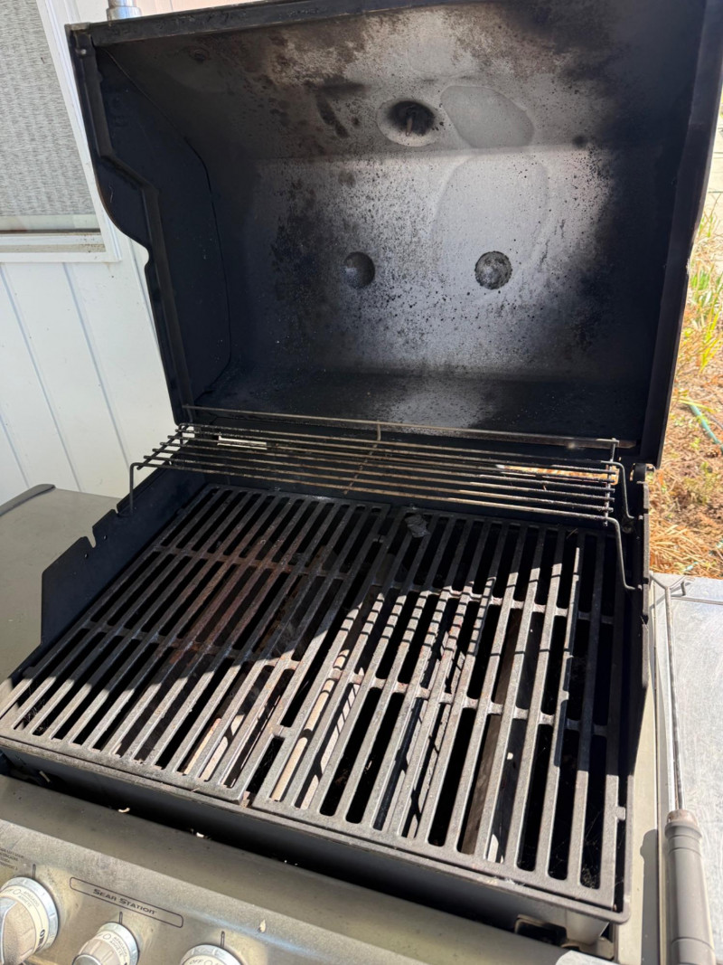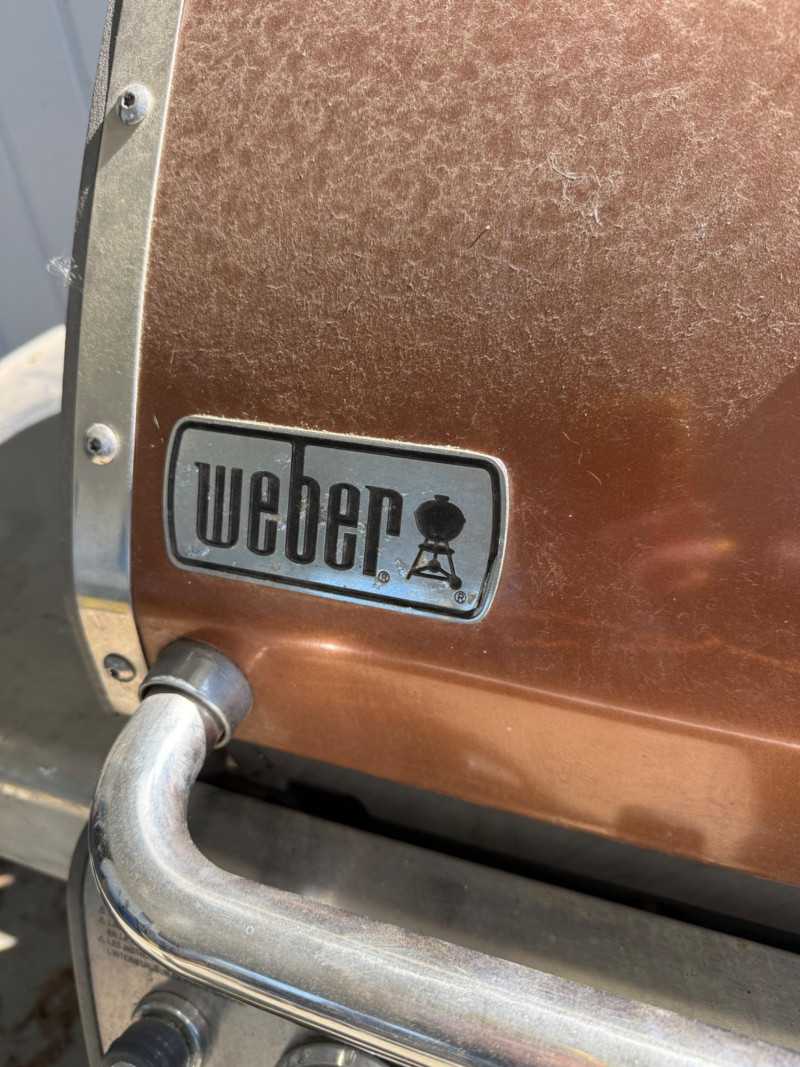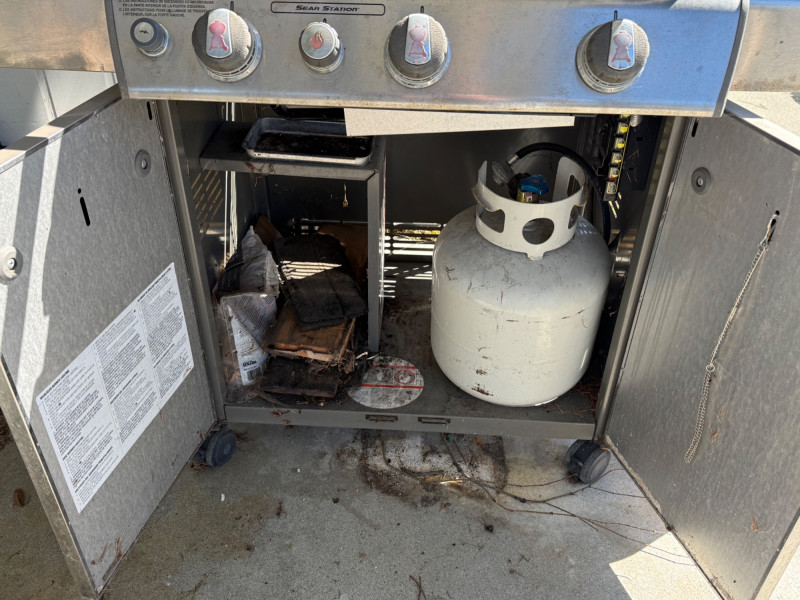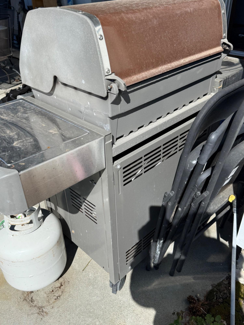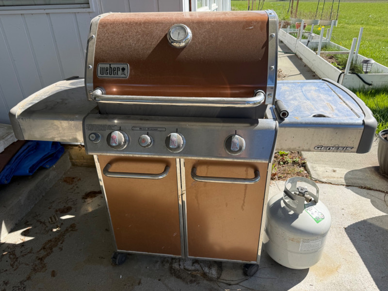 A solid, full‑size Weber Genesis gas barbecue featuring a classic enameled lid with built‑in temperature gauge, stainless‑steel handle, and multi‑burner control panel for even, reliable heat. The grill includes side prep shelves, a lower double‑door storage cabinet, and an attached propane tank, offering a complete outdoor cooking setup. Igniter button doesn’t work. Have to manually light. Comes with two propane tanks.