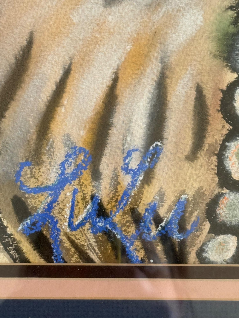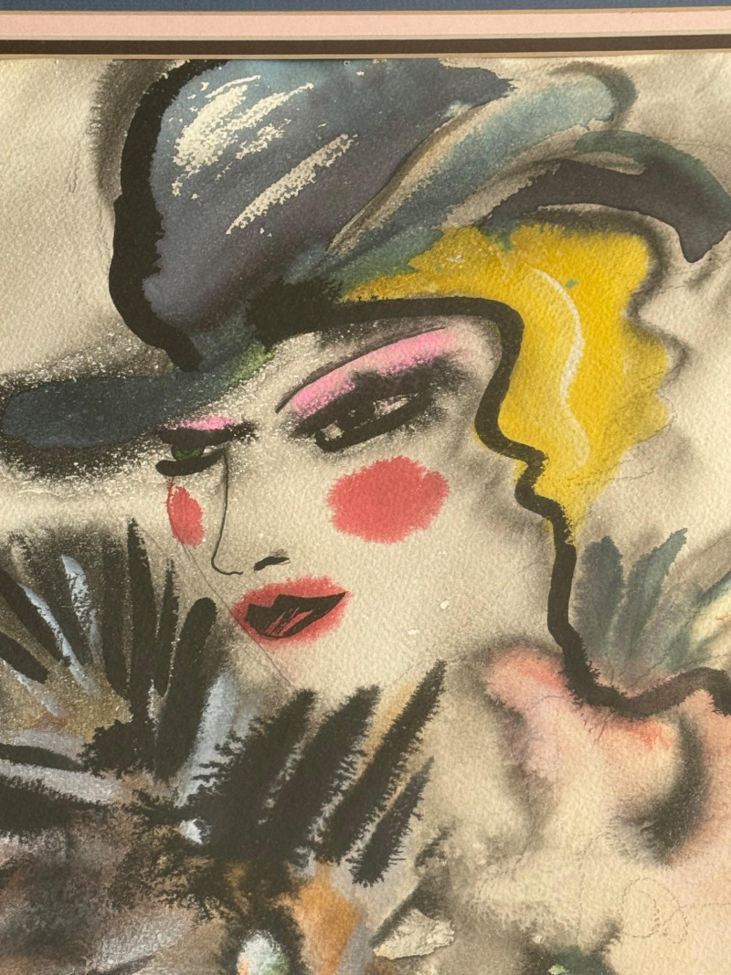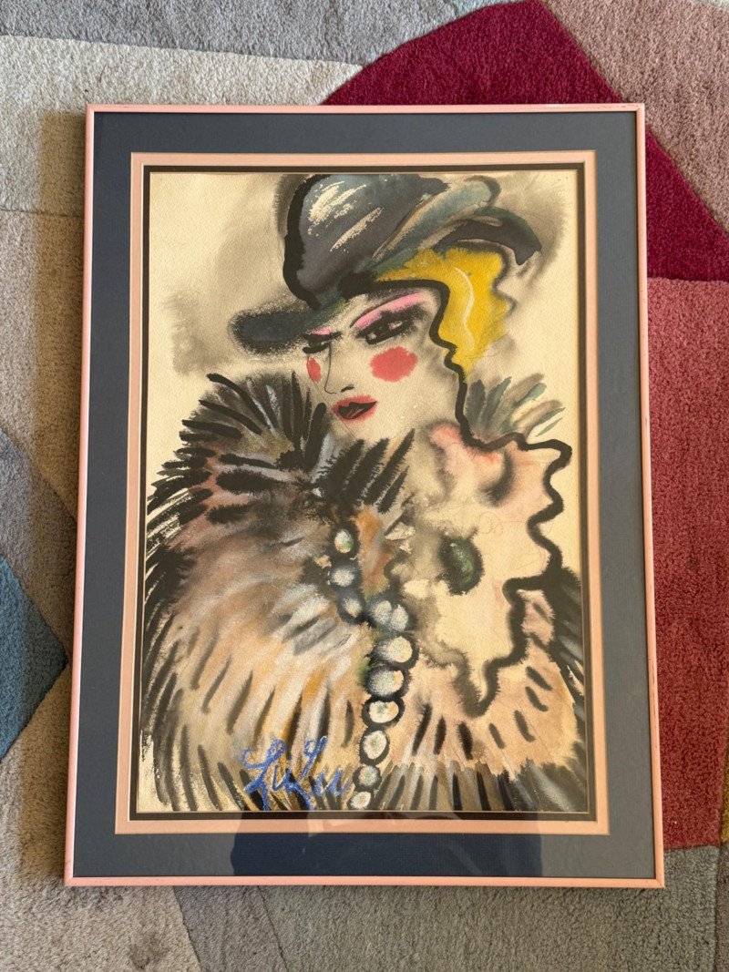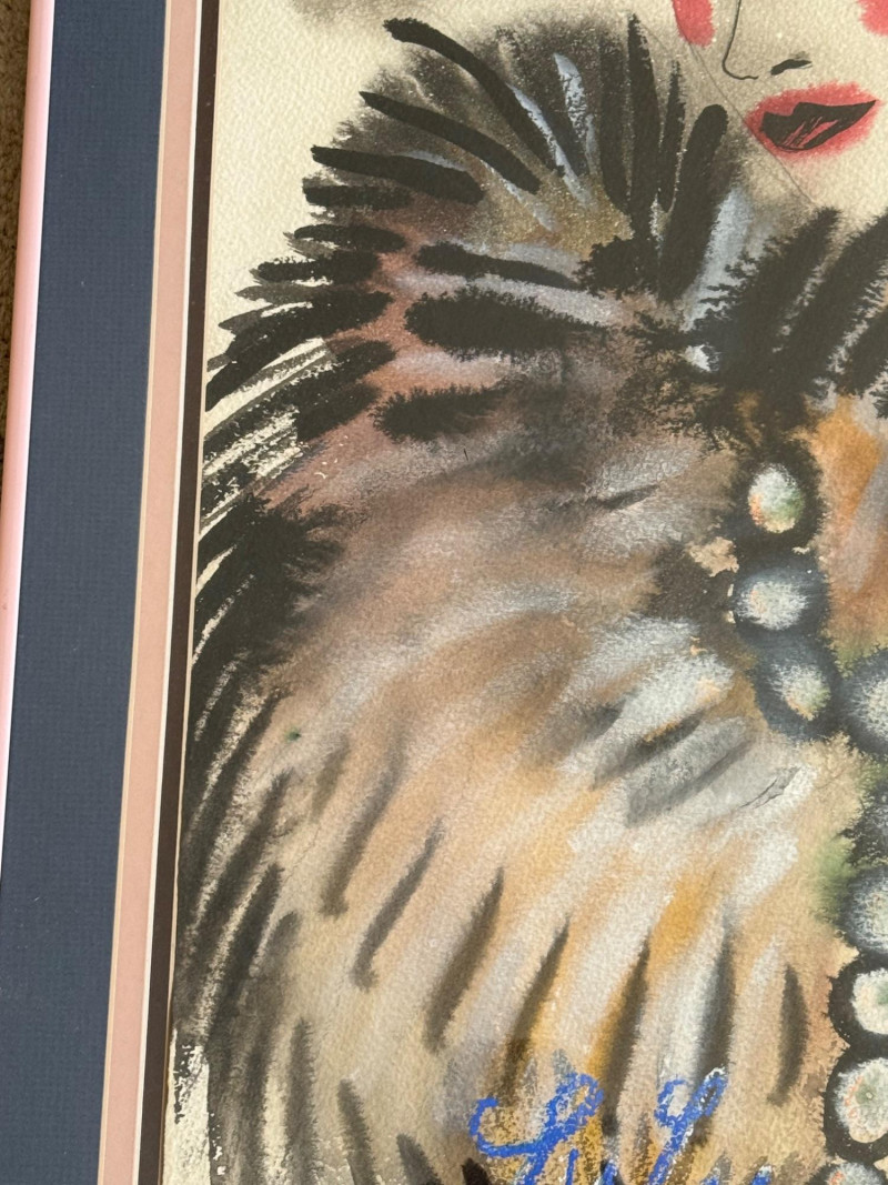 This is an original pastel portrait signed “Lulu”. The artwork depicts a stylized, fashion‑inspired figure with dramatic makeup, a dark hat with a feather, and a fur‑like wrap. The expressive brushwork and bold color choices give it a lively, theatrical feel. The piece is framed in a metal frame and matted with a double mat (gray outer, pink inner), which enhances the portrait’s warm tones.