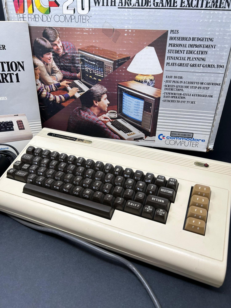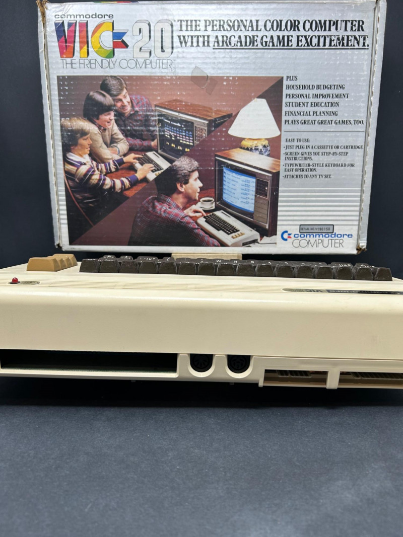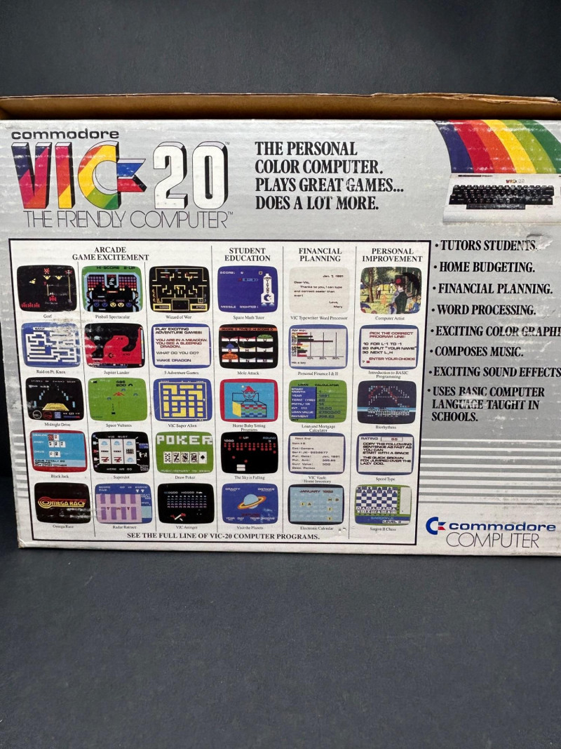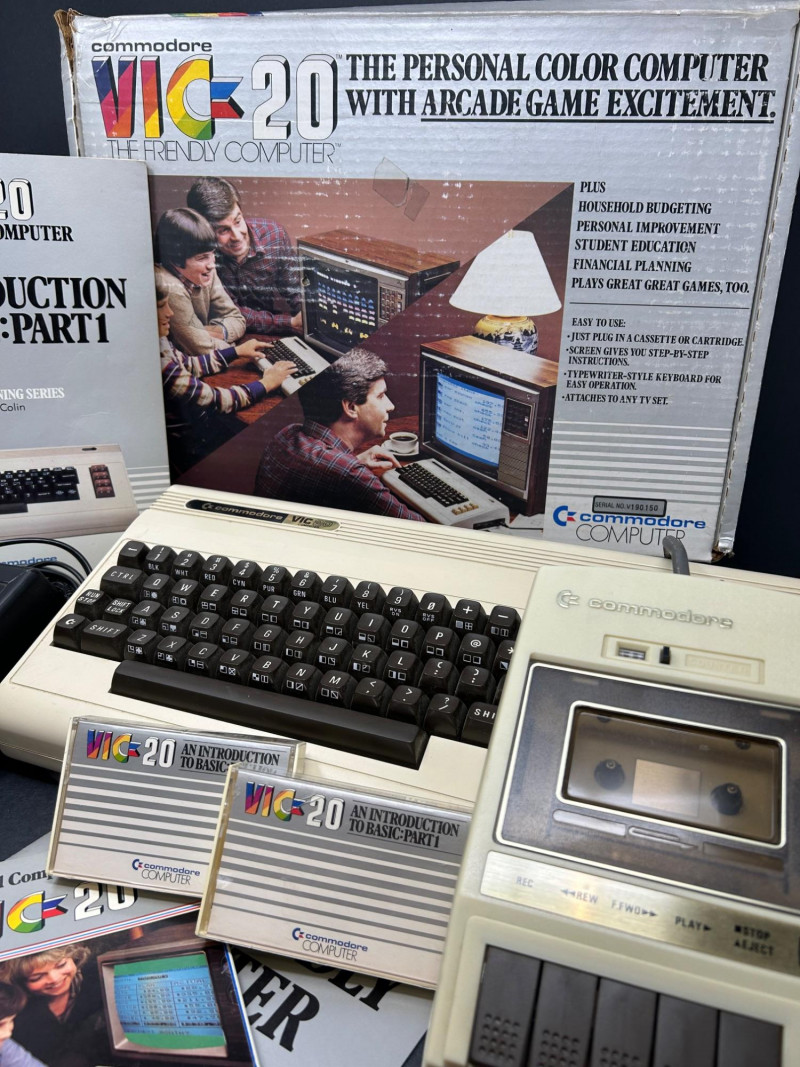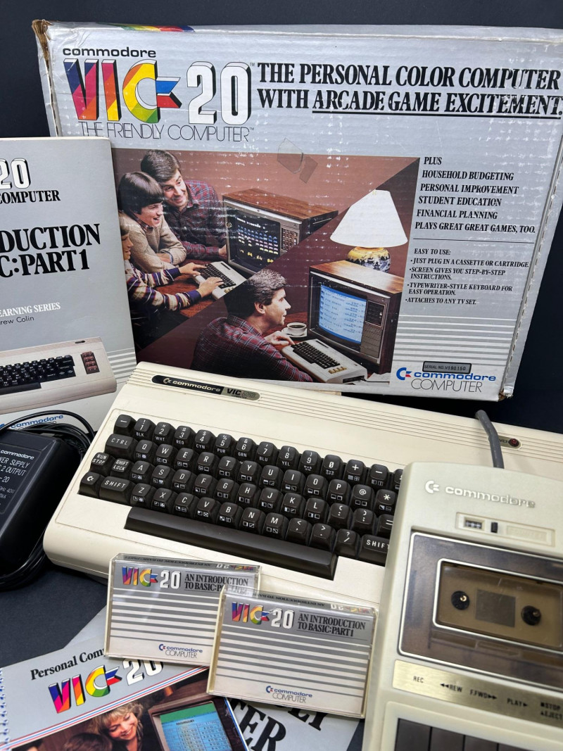 Vintage Commodore VIC-20 “The Friendly Computer” personal computer system. This classic early-1980s home computer comes with several original accessories and printed materials, making it a great collectible for vintage computer enthusiasts. Included in this lot: Commodore VIC-20 Computer Commodore C2N Cassette Tape Drive Commodore VIC-20 Power Supply (VIC-20) Original VIC-20 retail box Instructional materials and guides including: An Introduction to BASIC – Part 1 VIC-20 The Friendly Computer Personal Computing on the VIC-20 Assorted brochures and promotional materials Cassette tapes related to VIC-20 learning programs Notes:
