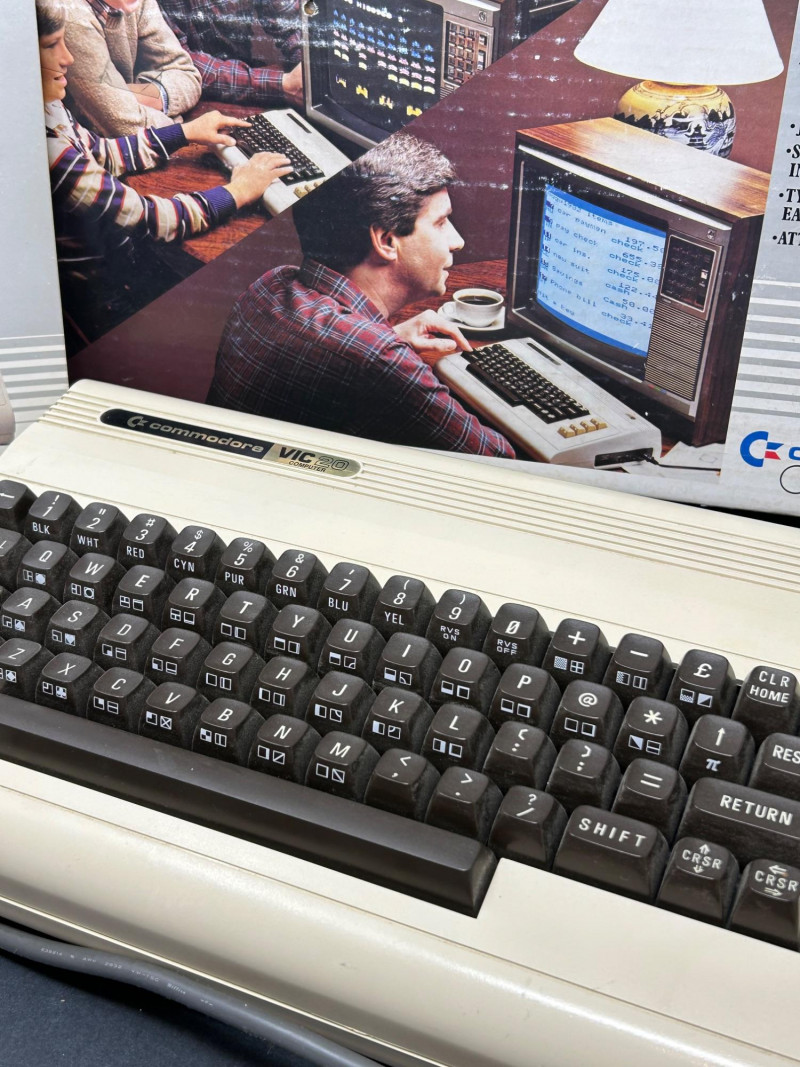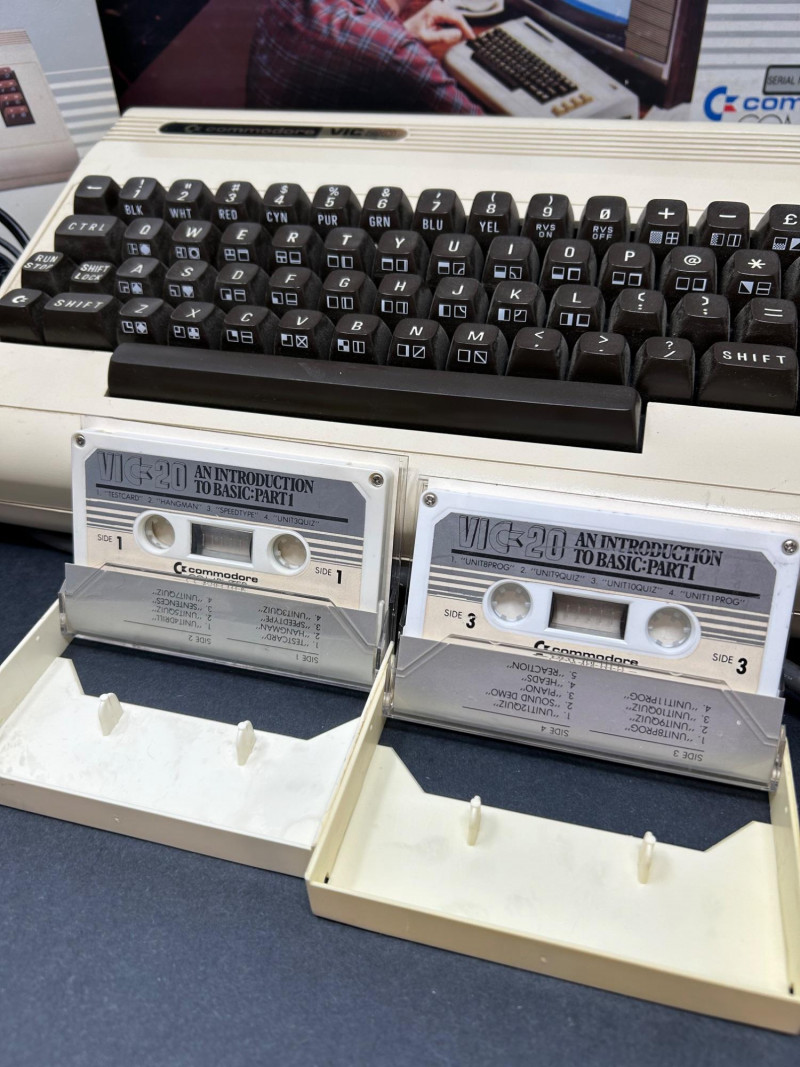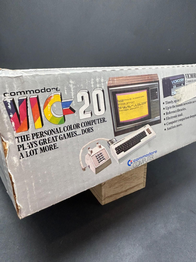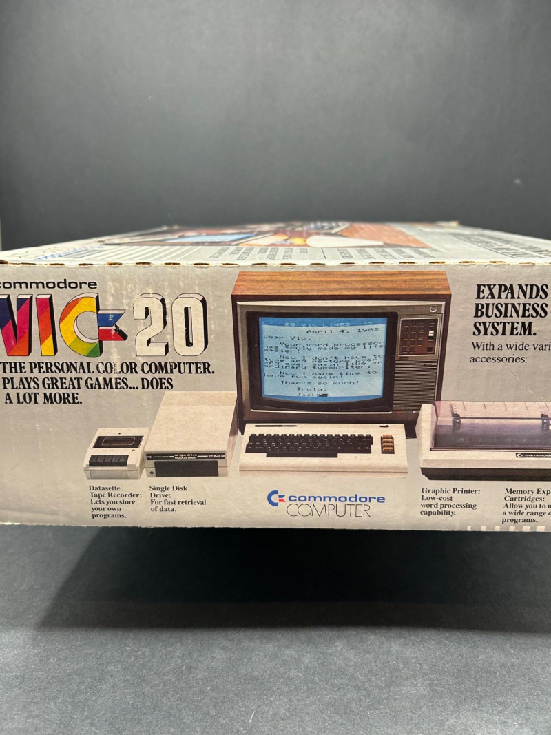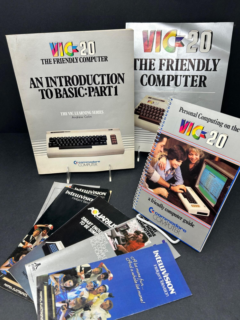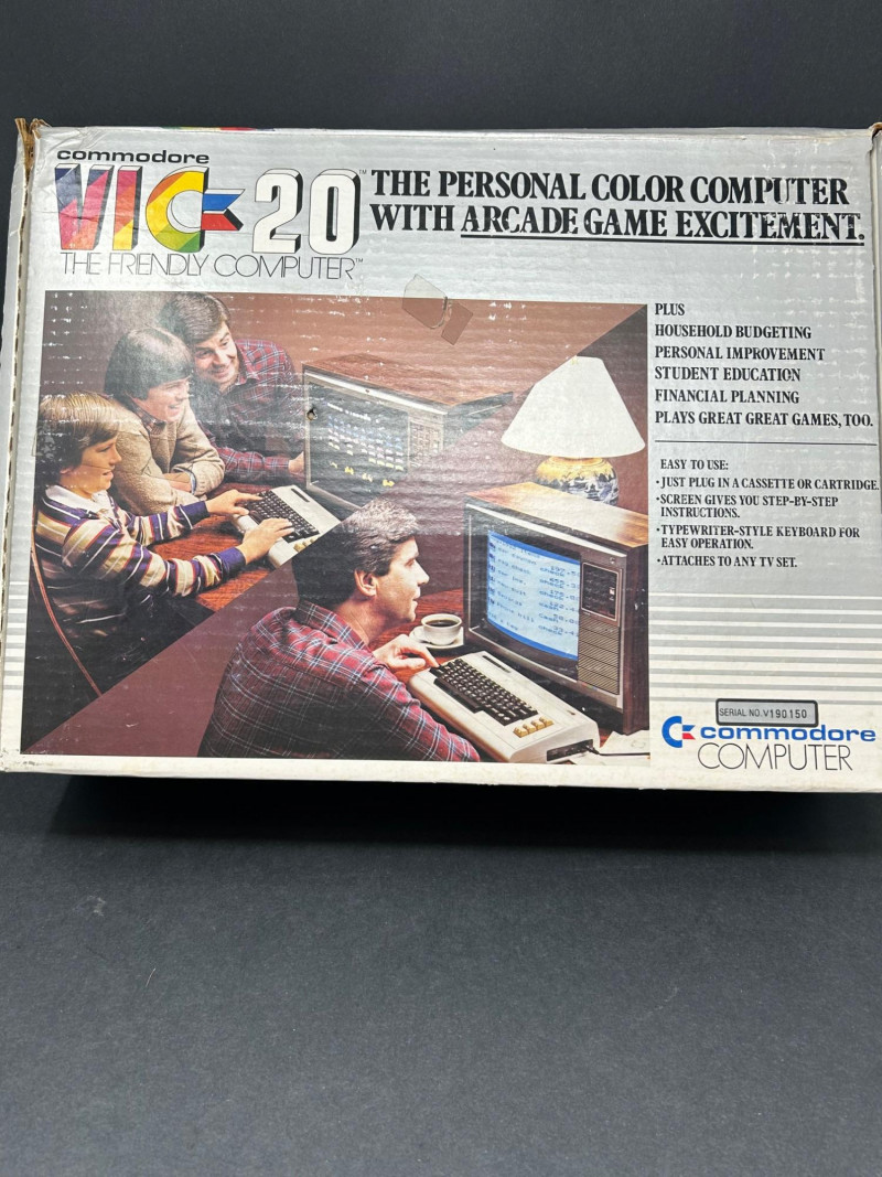 Vintage Commodore VIC-20 “The Friendly Computer” personal computer system. This classic early-1980s home computer comes with several original accessories and printed materials, making it a great collectible for vintage computer enthusiasts. Included in this lot: Commodore VIC-20 Computer Commodore C2N Cassette Tape Drive Commodore VIC-20 Power Supply (VIC-20) Original VIC-20 retail box Instructional materials and guides including: An Introduction to BASIC – Part 1 VIC-20 The Friendly Computer Personal Computing on the VIC-20 Assorted brochures and promotional materials Cassette tapes related to VIC-20 learning programs Notes: