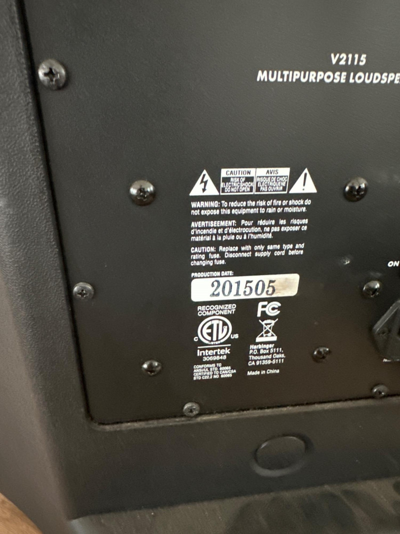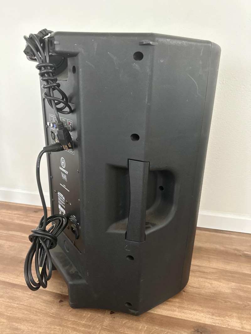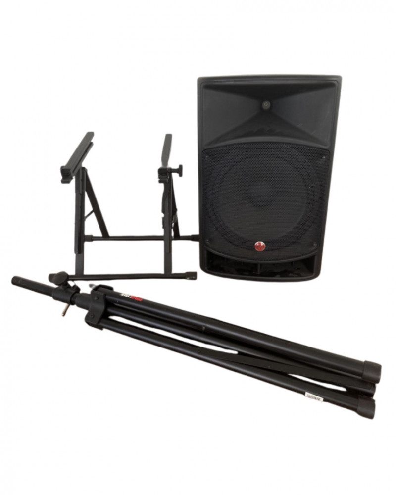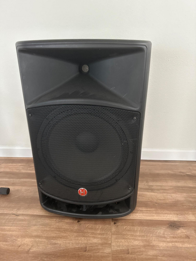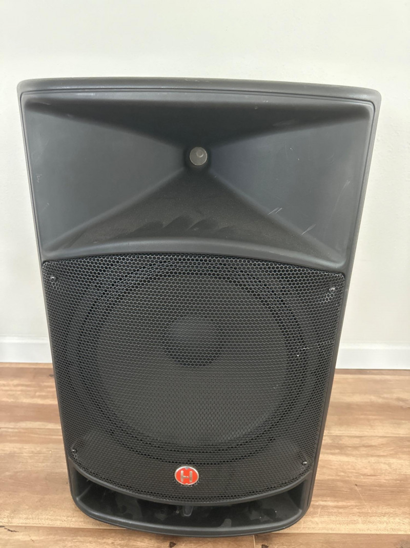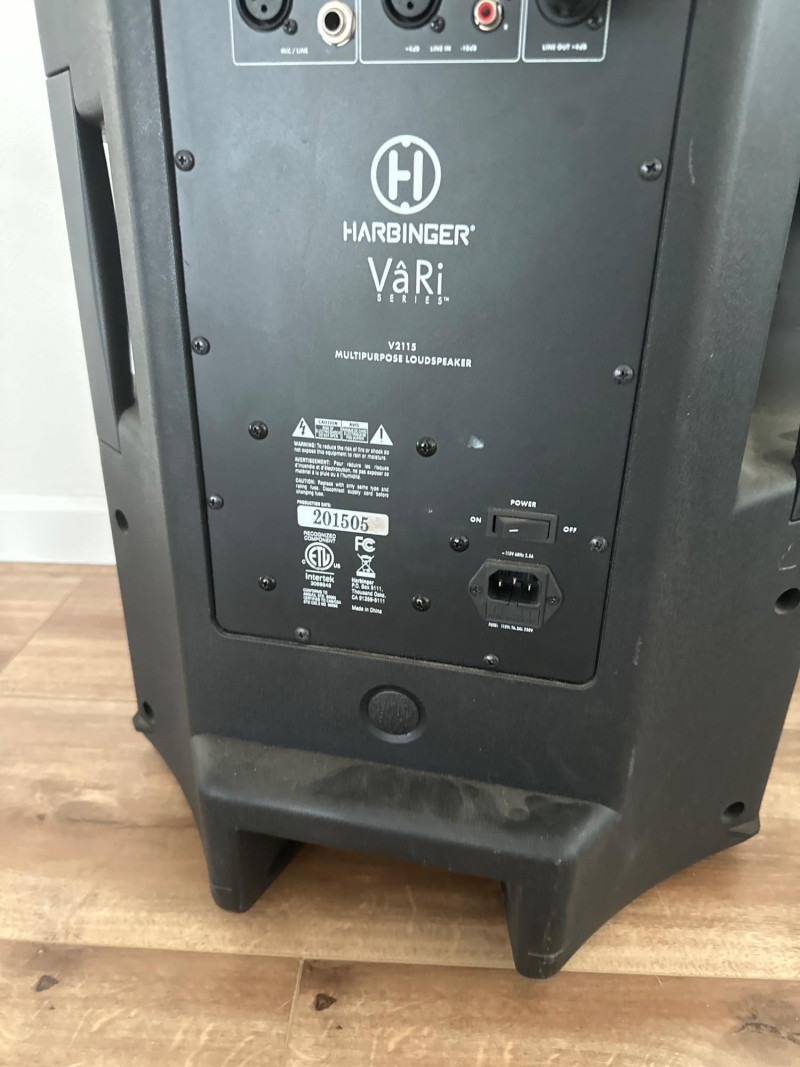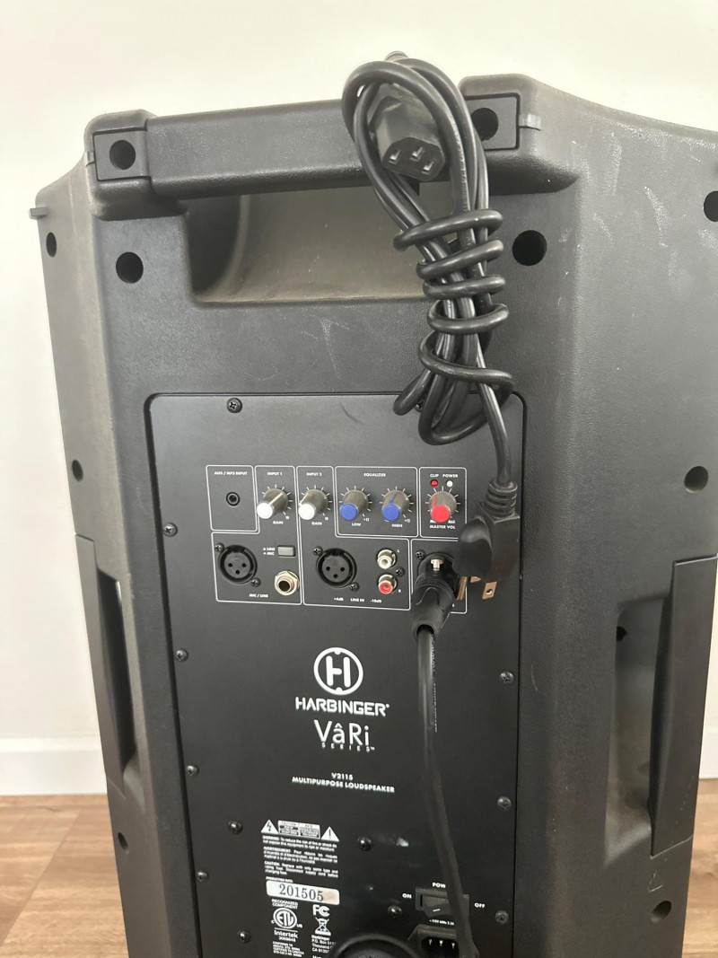 Harbinger VARI V2115 powered multipurpose loudspeaker. This versatile PA speaker features a built-in amplifier and integrated mixer controls, making it suitable for live sound, DJ setups, events, presentations, or practice spaces. The rear control panel offers multiple input options with gain controls, EQ adjustments, and master volume for easy sound customization. The durable molded cabinet includes a built-in carry handle for easier transport. This lot also includes a Proline speaker stand, a metal equipment stand, power cable, and audio cable as shown in the photos. Item Details: Brand: Harbinger Series: VARI Model: V2115 Type: Powered Multipurpose Loudspeaker / PA Speaker Color: Black Inputs: XLR, 1/4", and RCA inputs Controls: Gain, EQ (Low/High), Master Volume Measurements: 27” H x 18” W x 15” D